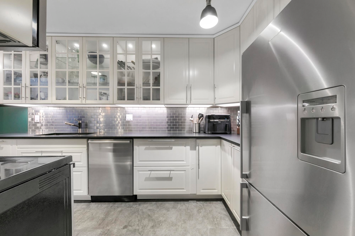 Top floor and nearly 13-foot vaulted ceilings. Bright, airy, and open. Lush greenery right outside your windows creates wonderful privacy and delivers cozy, elevated tree-house vibes you’ll love coming home to. Here’s the fun twist: a super-unique 377 sqft full attic, perfect as in-suite storage or a secret kid-cave / creative hideaway, complete with a rolling access platform. Separate underground storage and you finally have room for all the summer and winter toys. Large, renovated kitchen flows into a dedicated dining area that easily fits the whole family, ideal for real dinners, not just bar stools. Huge bedrooms, you simply can't find in modern condos. Full WOOD SHOP stocked with tools, GYM(squat rack), Pool, Sauna, Hot tub in a well run building and pro-active strata.