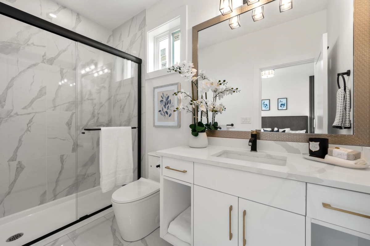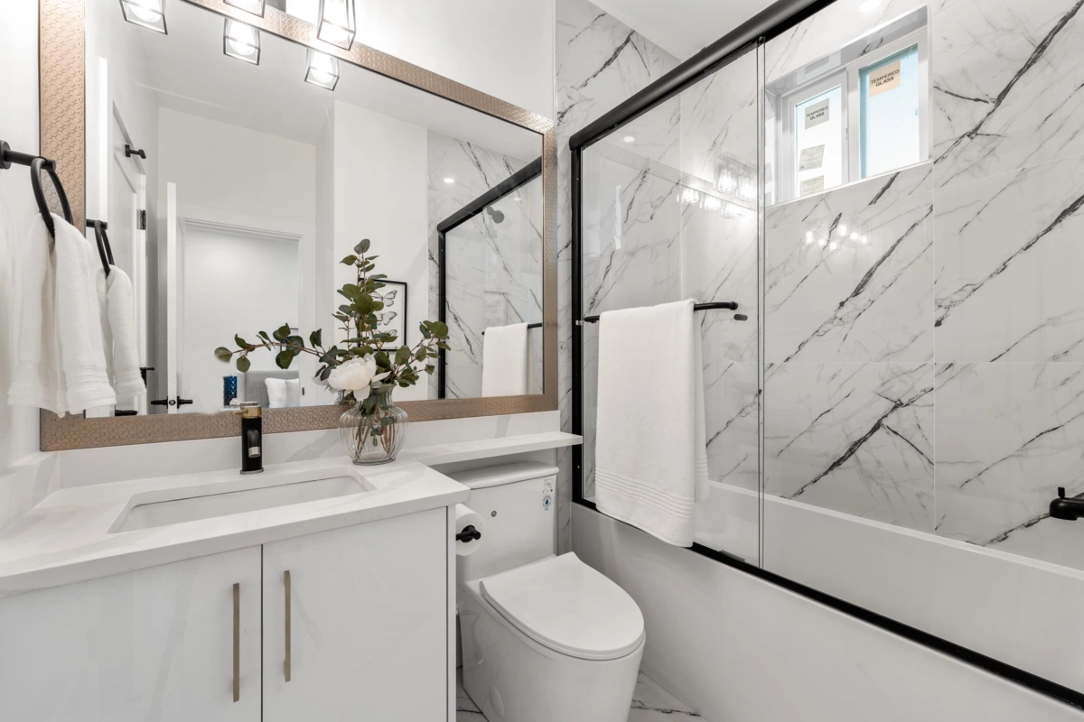 The best Duplex in town! Only 1 remaining brand new home in GlenBrooke North which has everything you need: high ceilings, privacy, ample sunshine, A/C, HRV, radiant floor heating & security cameras. Open kitchen features a 5 burner gas stove, waterfall kitchen island, s/s appliances, garburator for convenience, and a modern family room overlooking the open patio w/ BBQ gas connection and big backyard. The spacious living and dining areas have a 60" fireplace whilst the luxurious powder room feels like a 5 star hotel. Upstairs, there are 3 bedrooms with ensuites. Below has a potential 2 bedroom suite w/ bath & separate entry, a great mortgage helper or can be used as a flex space for storage, home office, or gym. Level 2 EV ready carport. Walking distance to all levels of school.