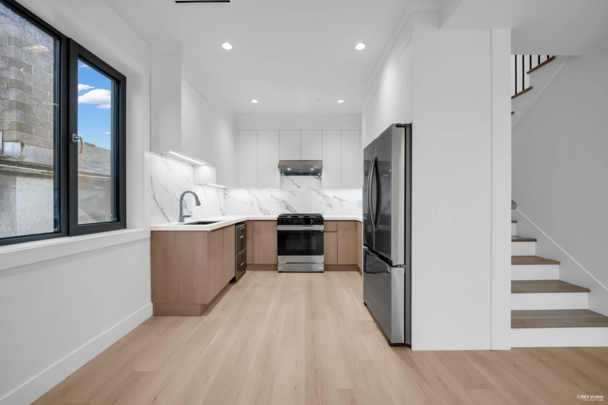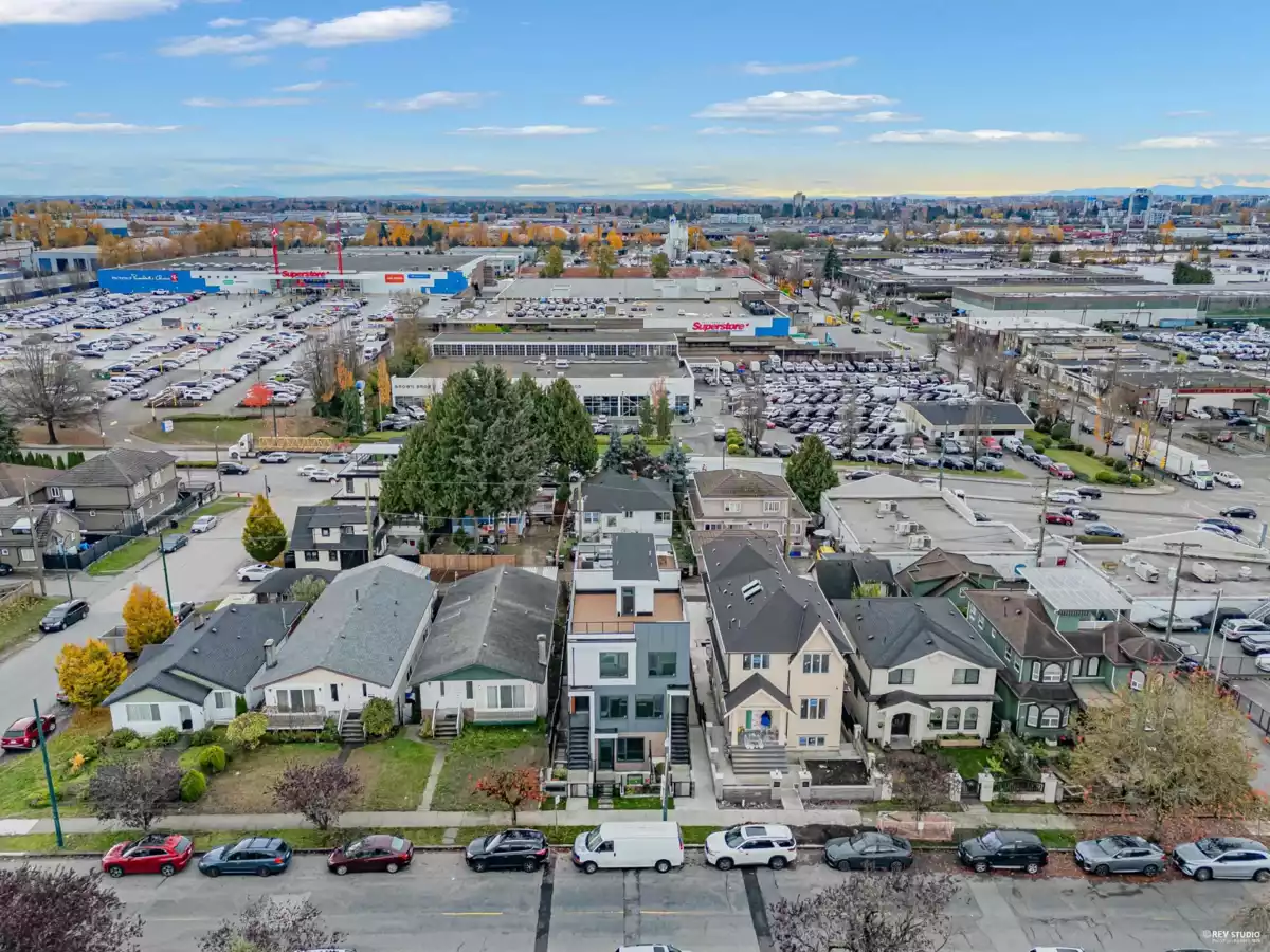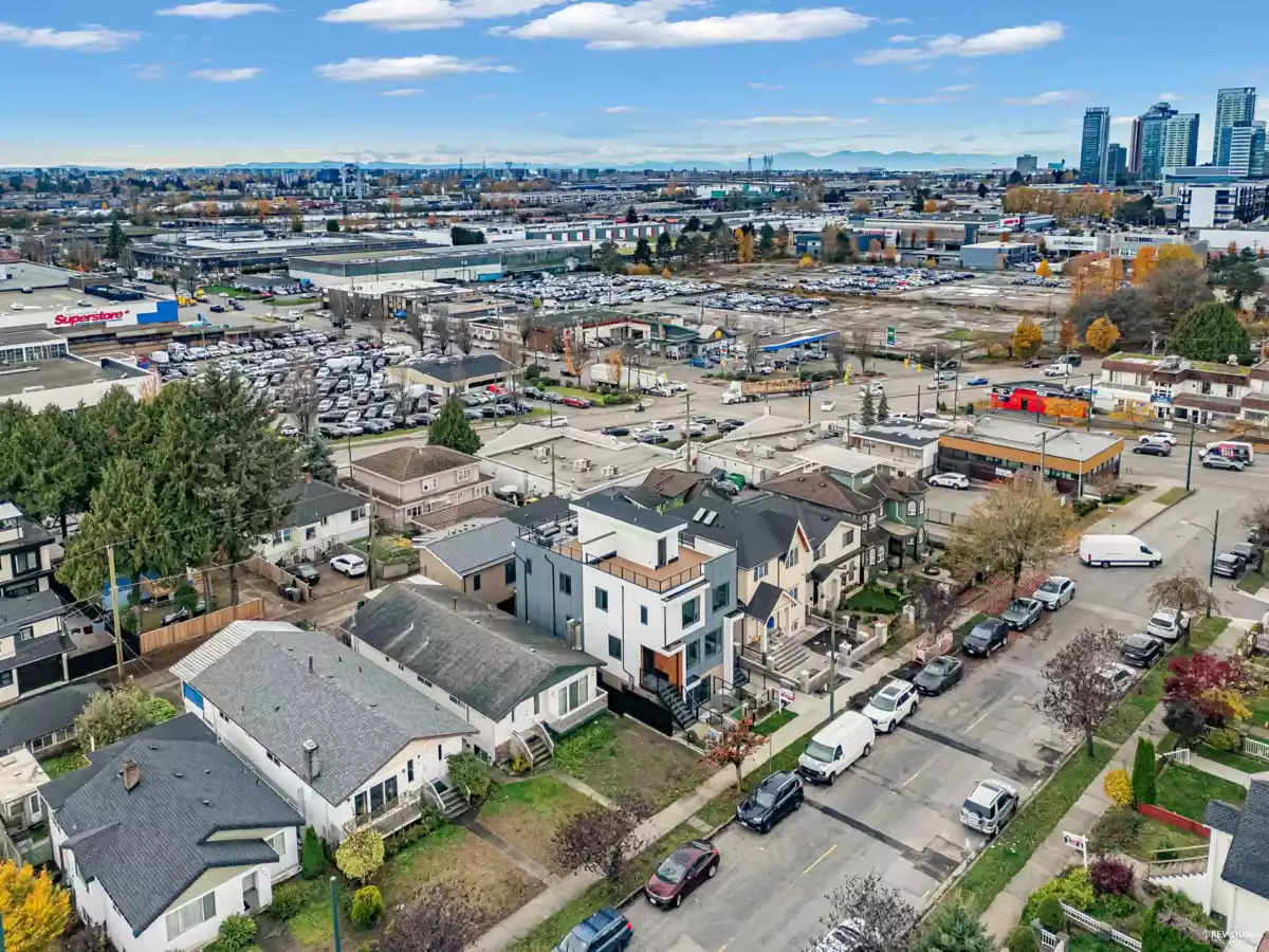 Modern 3 BDRM/2.5 BATH unit in a premier 4-plex, combining style, comfort & convenience. Only 1 min walk to bus stop w/direct access to Skytrain & Vancouver waterfront, 5 mins walk to restaurants & Canadian Superstore. Contemporary design features clean lines, open-concept layout, triple-glazed metal frame windows & energy-efficient systems. Enjoy private yard, alarm, sprinkler & security cameras with back lane access open parking with EV Charging. Inside: gas stove, heat pump (heating/cooling) & 450sqft rooftop patio w/ unobstructed city & mountain views. No Strata Fee!