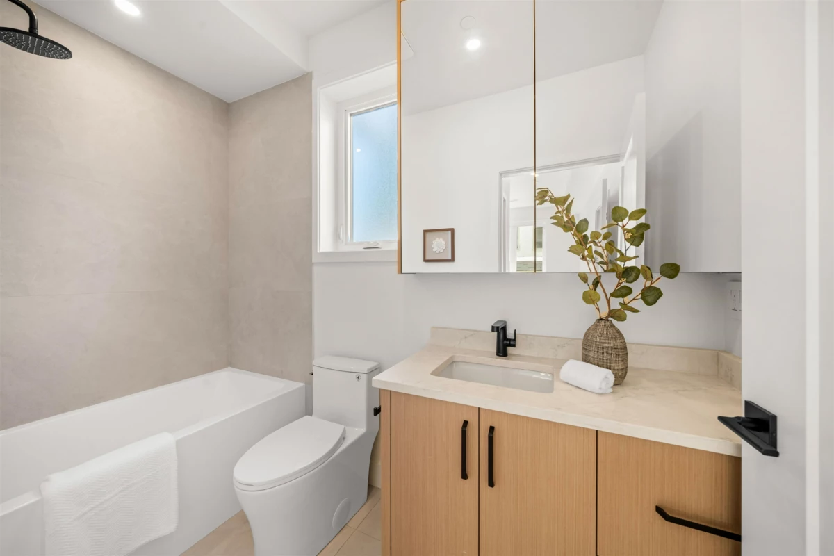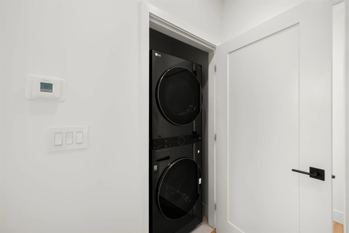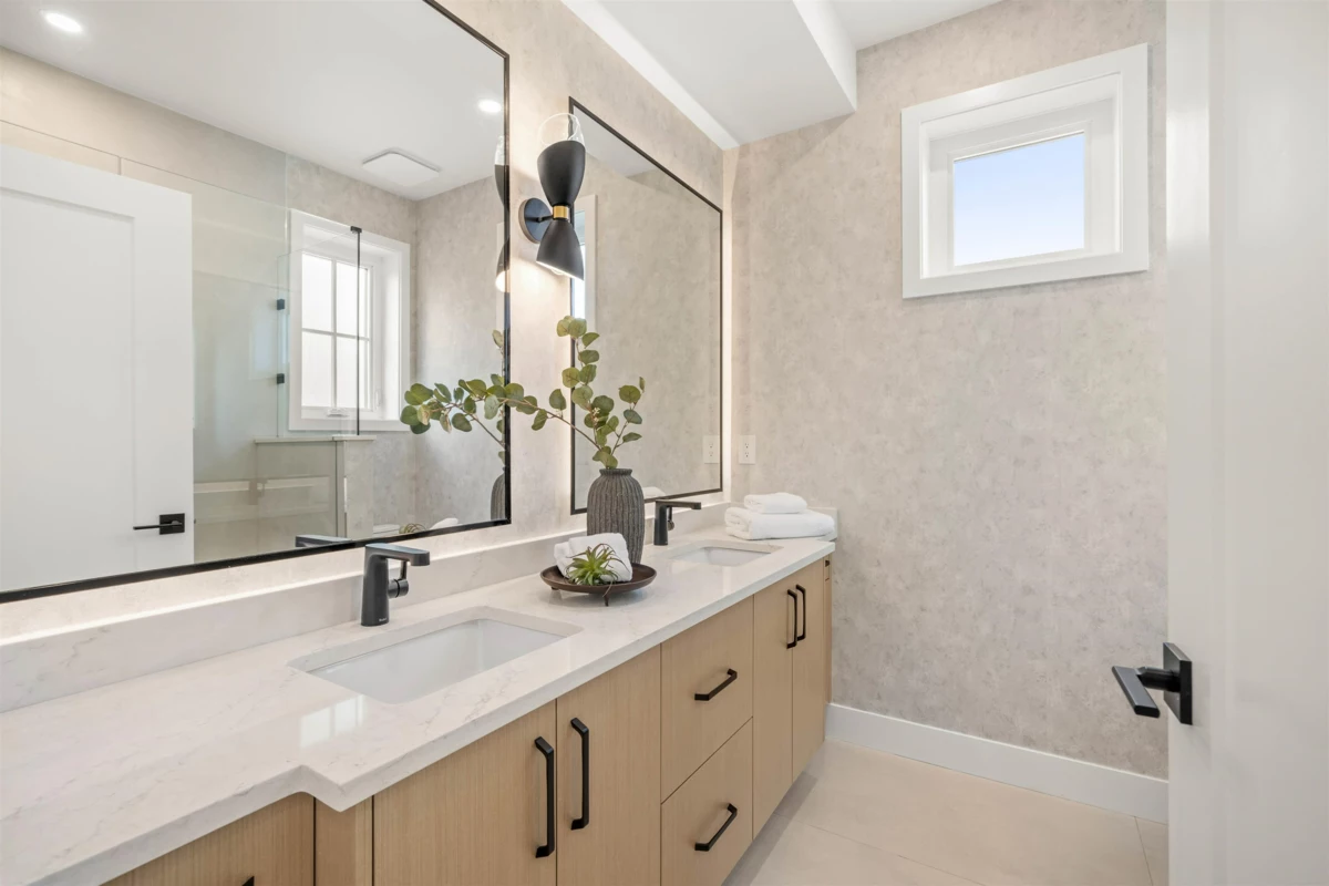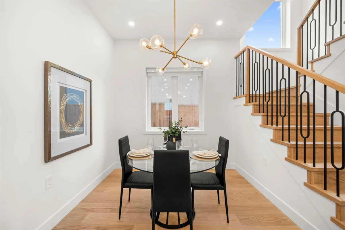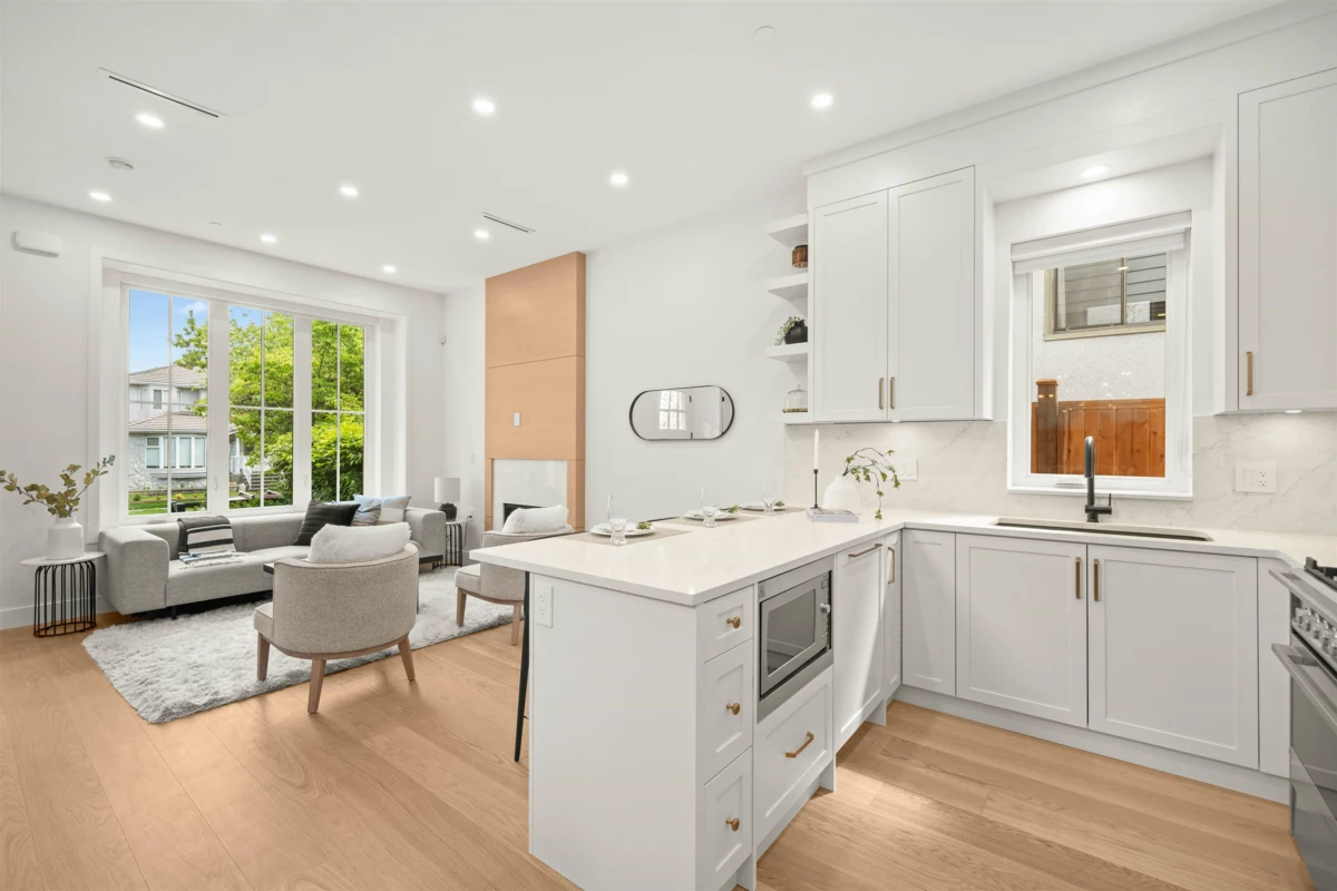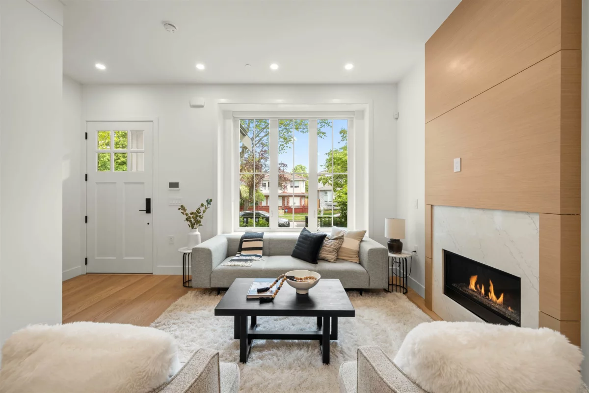 Enjoy stunning mountain views from this brand-new front duplex in the vibrant Main Street neighbourhood. Spanning three levels, this home offers 3 bedrooms and 3.5 baths with thoughtful design throughout. The main floor features 10’ ceilings, hardwood flooring, a gas fireplace, Fisher & Paykel appliances, and custom built-ins. Upstairs includes two bedrooms, each with its own ensuite and built-in dressers, while the top floor showcases a private bedroom with ensuite and a balcony overlooking the mountains. Located close to shops, restaurants, golf course, John Henderson Elementary and John Oliver Secondary catchments.Complete with A/C, HVAC, security system, and an EV-ready single garage.