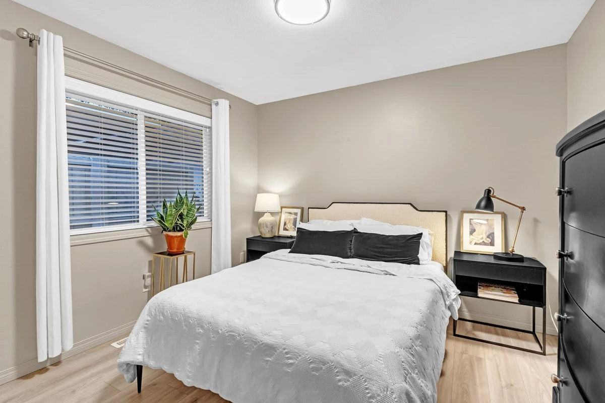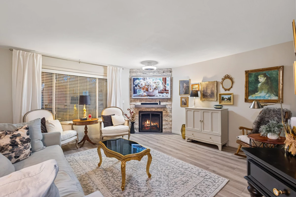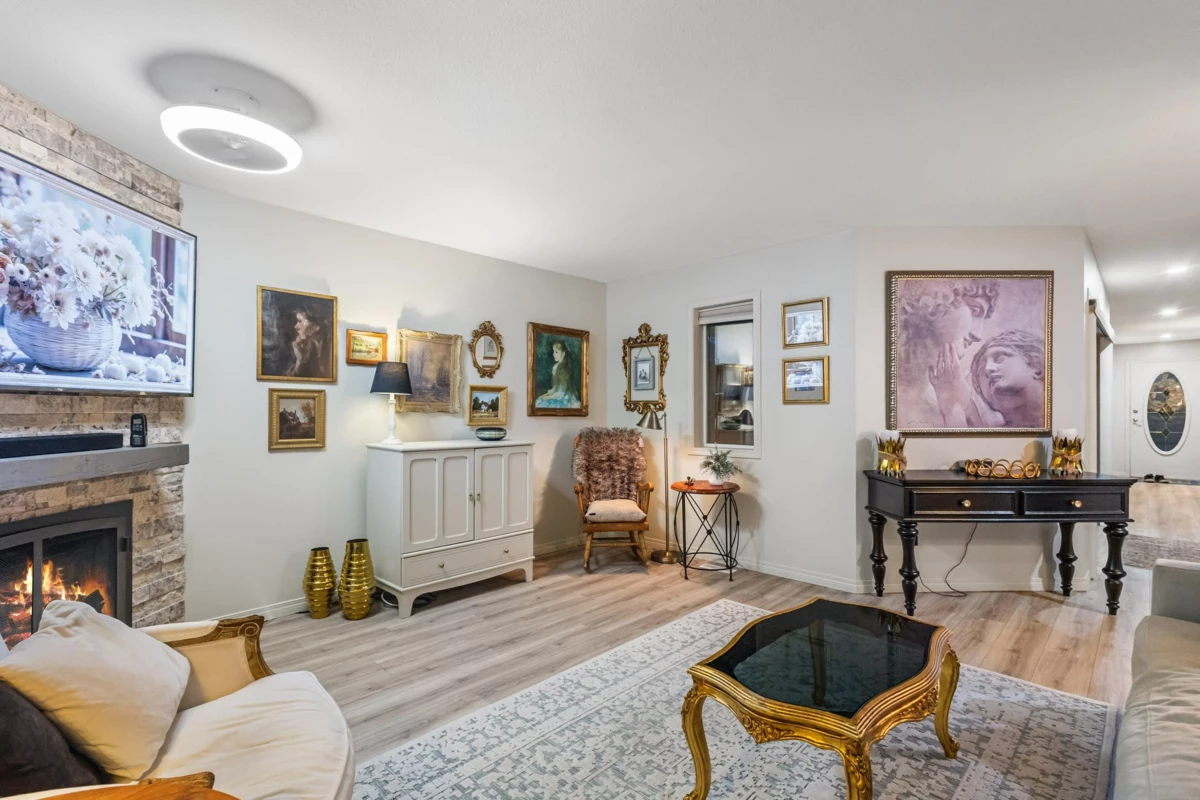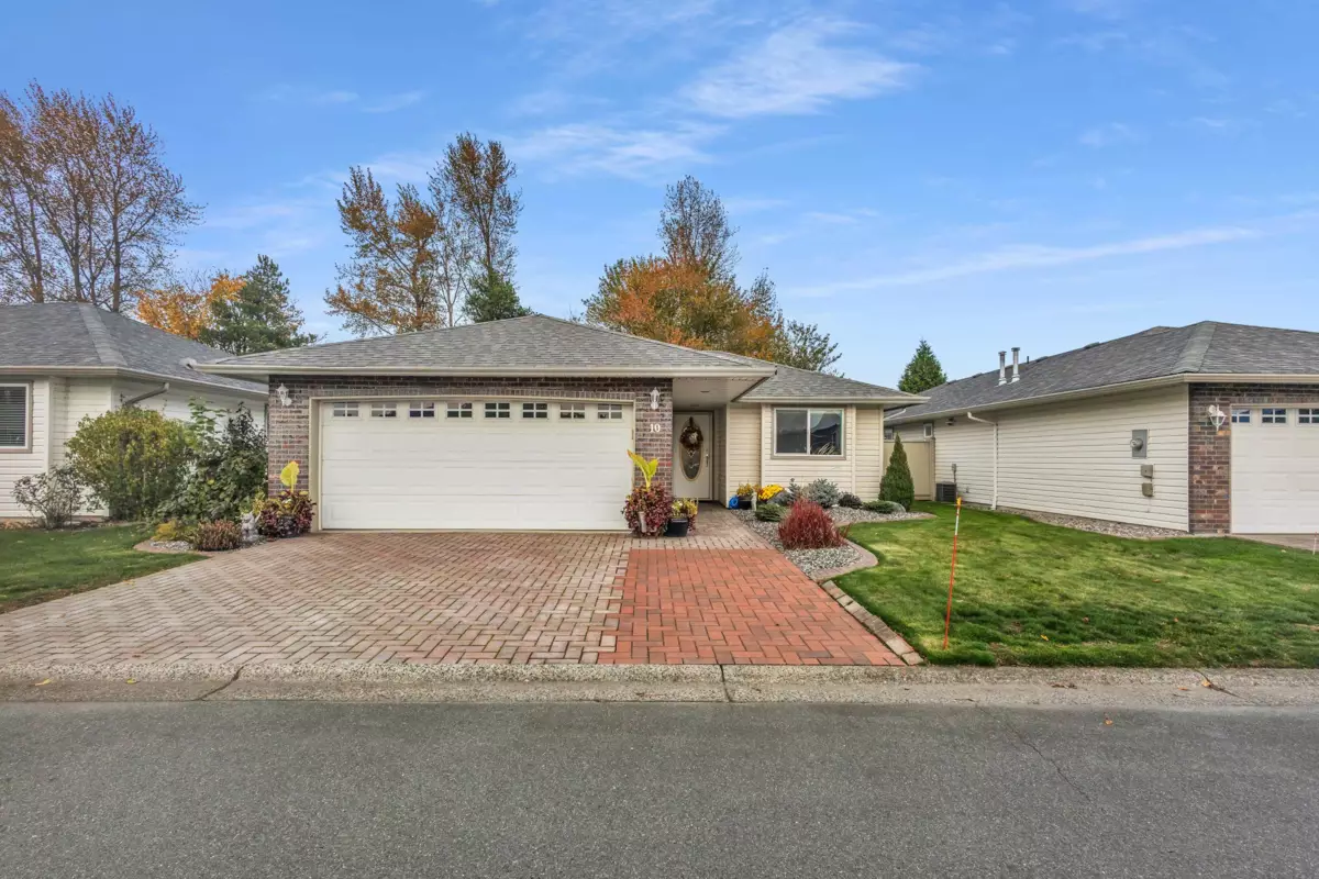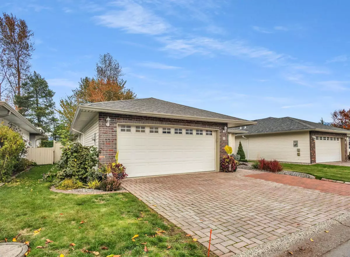 Stylish 2-Bedroom Rancher in 45+ Clover Creek! Discover this beautifully updated 1,520 sq ft detached home with 2 bedrooms and 2 bathrooms. Enjoy updated flooring, paint, lighting, and modern upgrades including A/C, updated hot water tank, roof and gutters with leaf guards. The kitchen impresses with extended cupboards for tons of extra pantry space, quartz countertops, an island, s/s appliances and a wine fridge. The spacious master suite offers double sinks, a large shower, and a sleek barn door. Relax by the stone floor-to-ceiling fireplace or step out through patio doors to a covered patio. Stone driveway with parking for 2 cars plus double garage, this move-in-ready home blends comfort and style in a sought-after community!