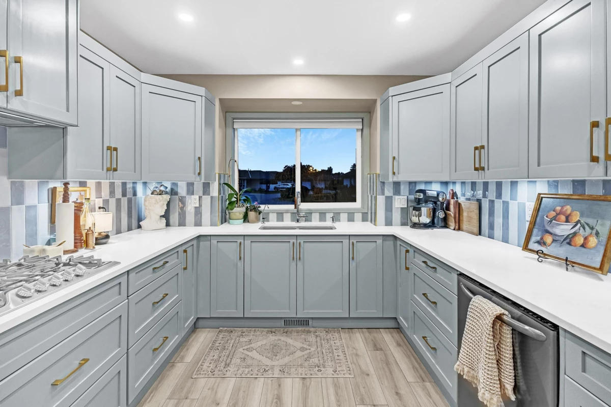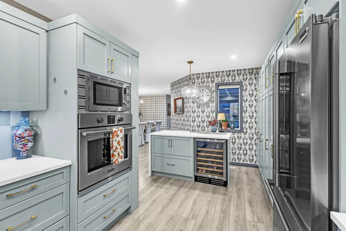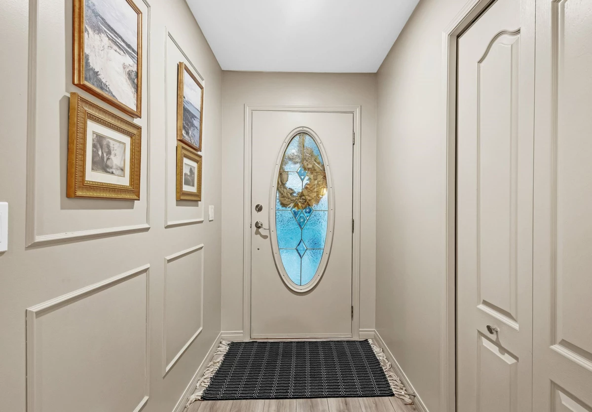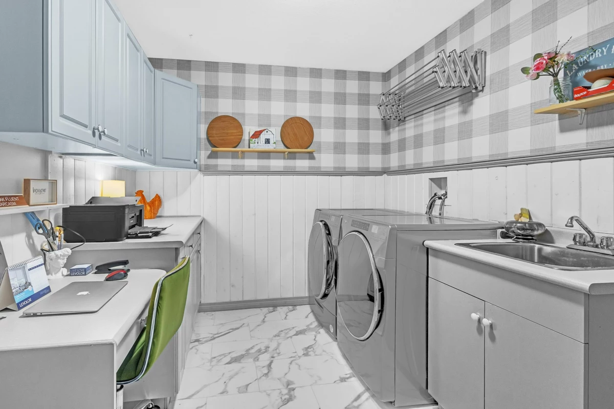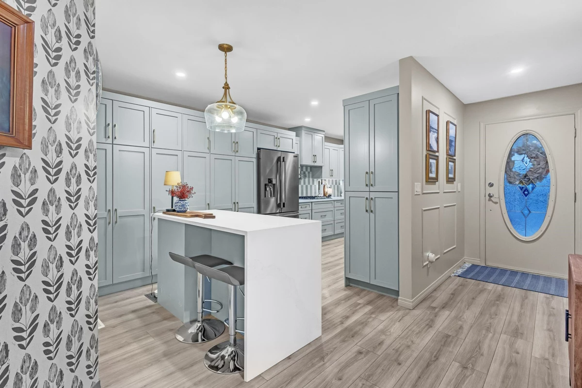 Stylish 2-Bedroom Rancher in 45+ Clover Creek! Discover this beautifully updated 1,520 sq ft detached home with 2 bedrooms and 2 bathrooms. Enjoy updated flooring, paint, lighting, and modern upgrades including A/C, updated hot water tank, roof and gutters with leaf guards. The kitchen impresses with extended cupboards for tons of extra pantry space, quartz countertops, an island, s/s appliances and a wine fridge. The spacious master suite offers double sinks, a large shower, and a sleek barn door. Relax by the stone floor-to-ceiling fireplace or step out through patio doors to a covered patio. Stone driveway with parking for 2 cars plus double garage, this move-in-ready home blends comfort and style in a sought-after community!