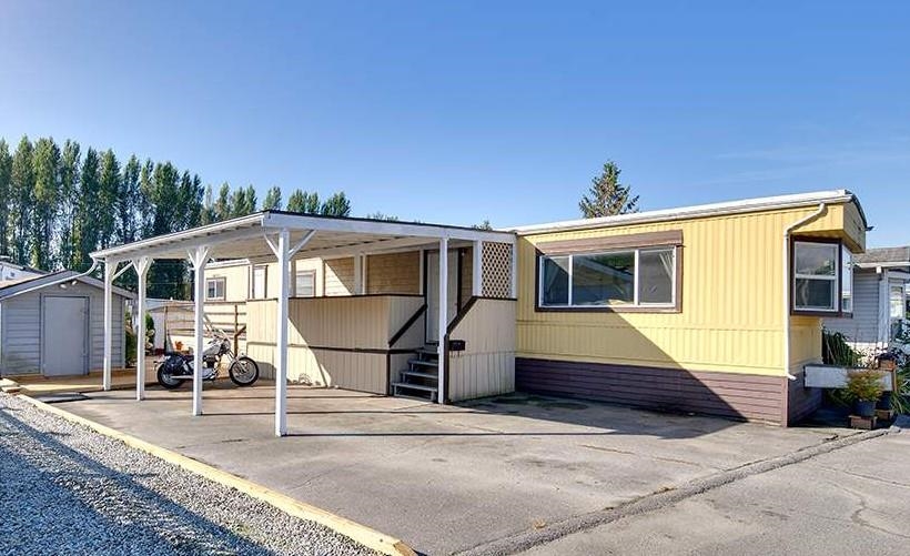 Welcome to Wildwood Park! Beautiful 2 beds & 1 bath, 696 sq.ft open concept unit. SINGLE-wide lot. featuring laminated, carpet & tiles flooring, huge windows, lighting fixtures, frameless shower, kitchen w/ granite counter-top. spacious deck w/ under storage, covered patio, shed. Well managed complex centrally located convenient to park, shopping, & transit. Enjoy great amenities offered w/ access to in-door pool, playground, clubhouse, storage & MORE! Pet friendly, parking available, Affordable pad fee. Come & see your future home!