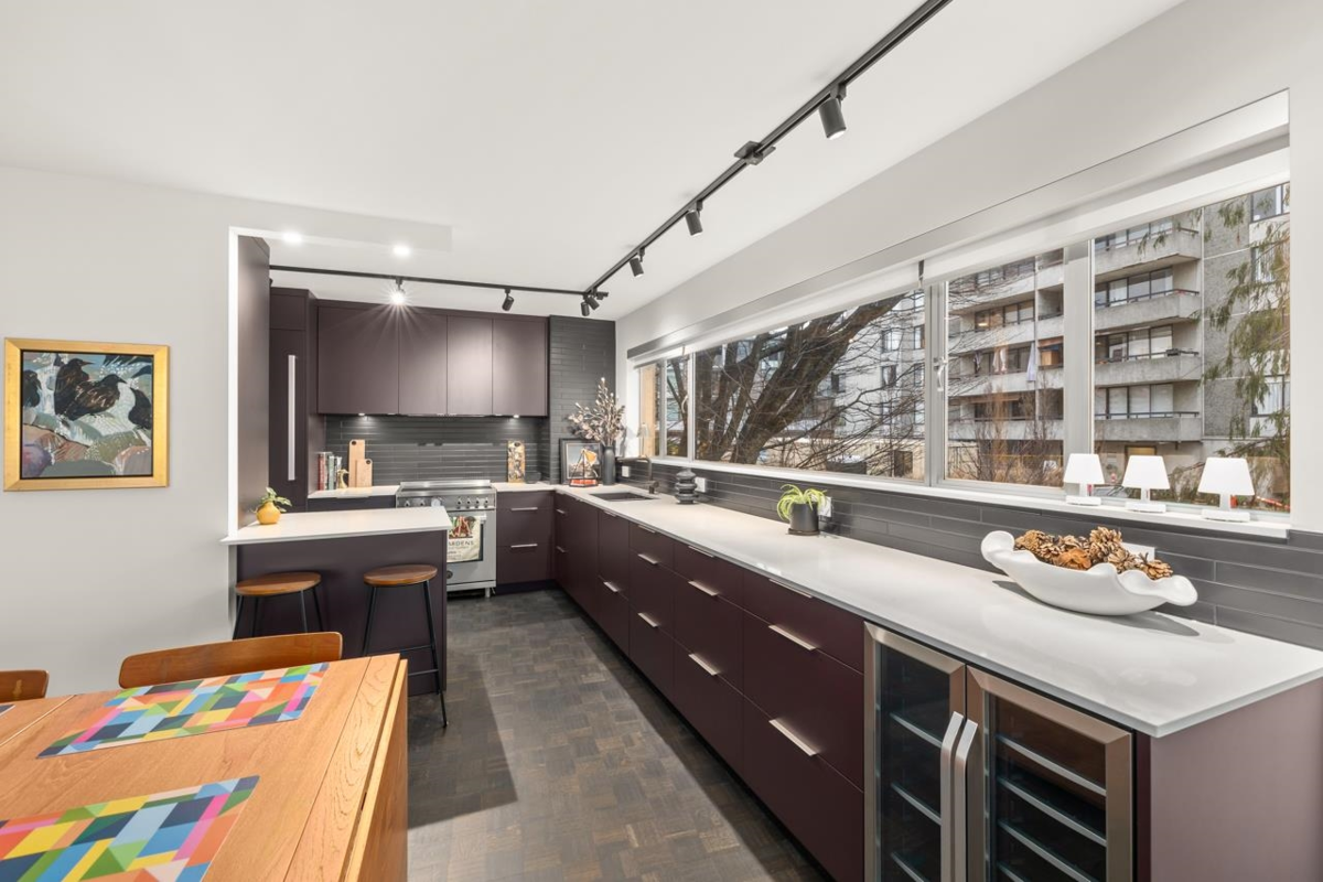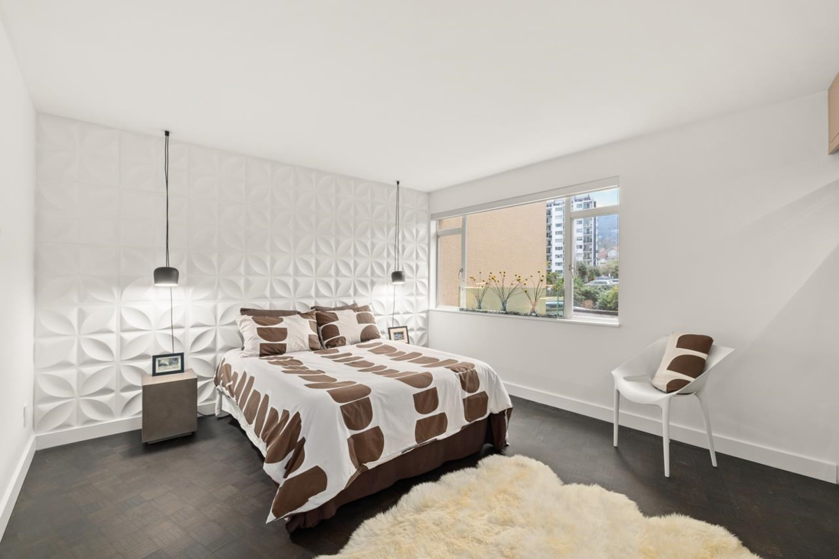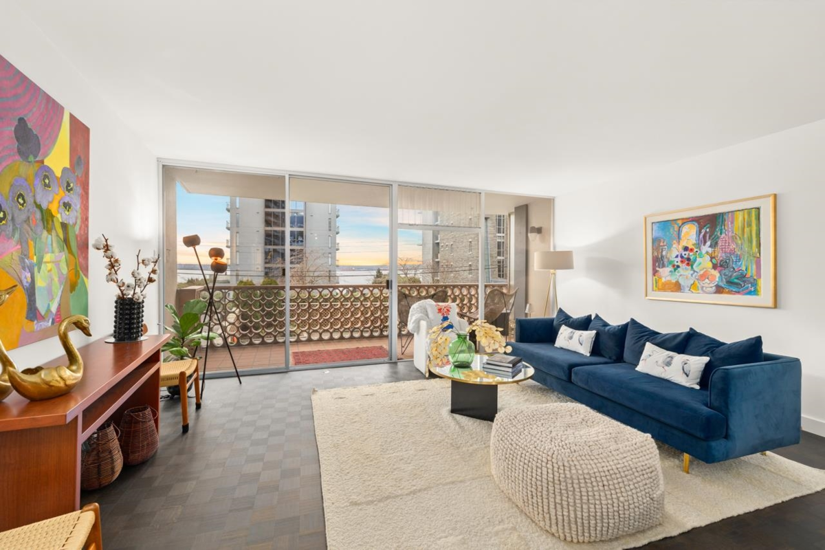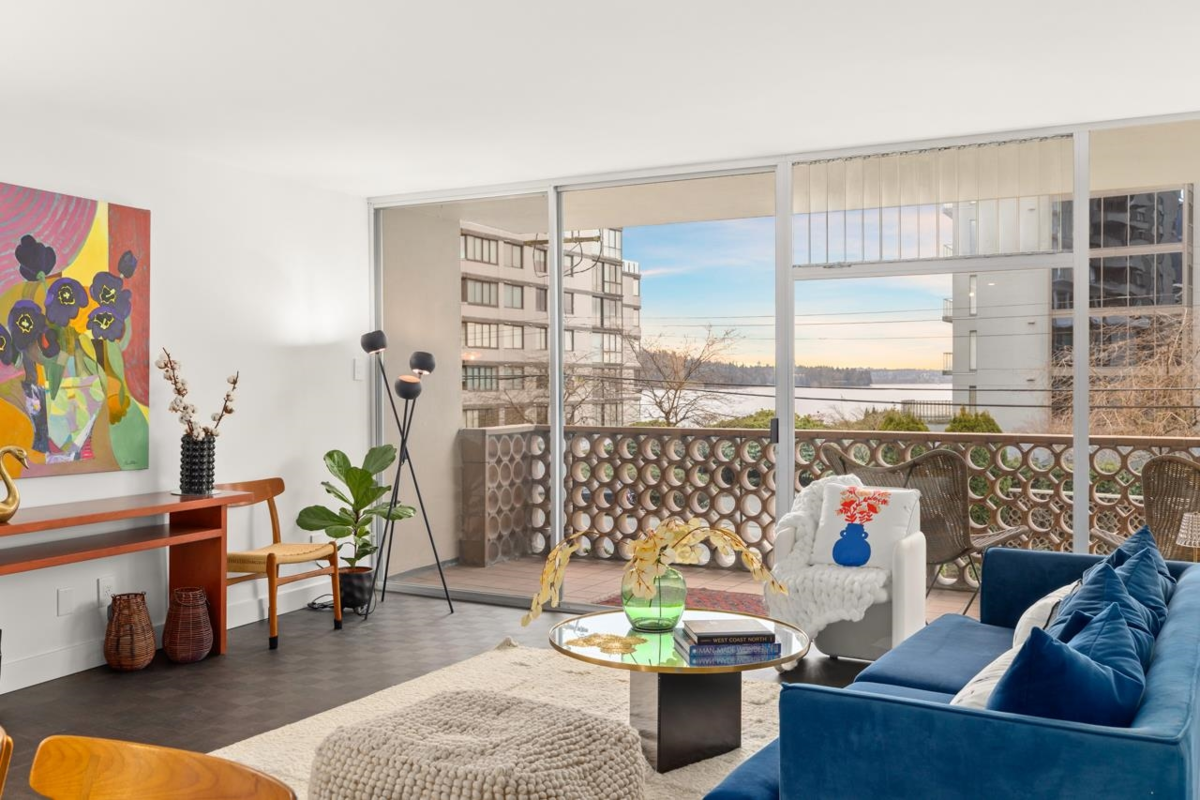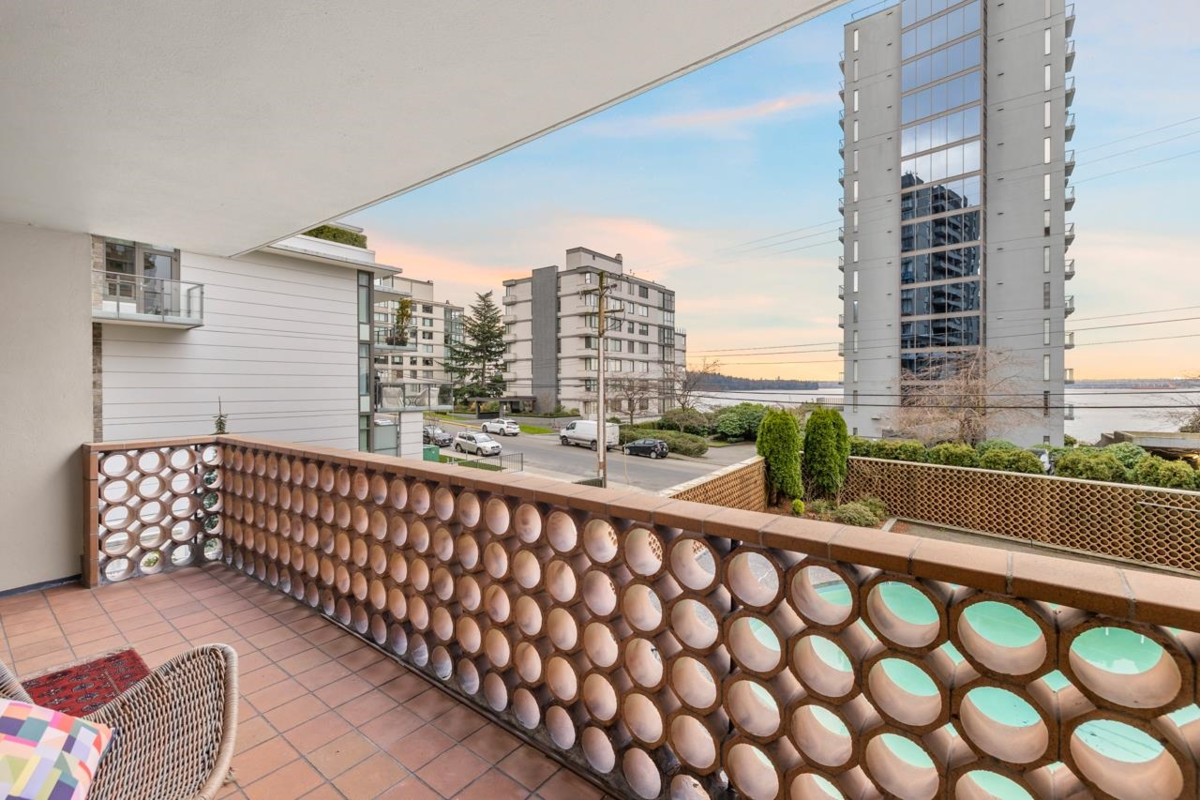 This corner unit gem was FULLY and immaculately reno'd in 2024 to echo the building's 1961 roots. It boasts windows on three sides, gorgeous Italian Bertazzoni appliances (including a built in wine fridge), all new lighting, Emtek Hardware, an opened up and expanded kitchen, two fully redone ensuite bathrooms, closet built-ins, in-suite laundry, window blinds, re-finished original oak hardwood floors, in floor heat and more! There hasn't been a detail missed in this renovation. New elevator & fully re-piped bldg. Views to the ocean are spectacular from the unit and from the massive roof top deck. Concrete-built, The Crescent is a unique jewel along the West Van waterfront. Close to the Seawall, shops, restaurants, beach! Opens: Thurs, Oct 30, 10-12 & Sun, Nov 2, 2-4