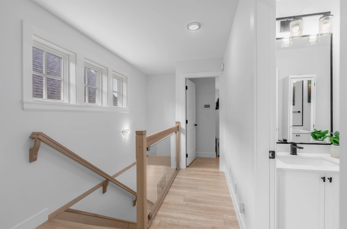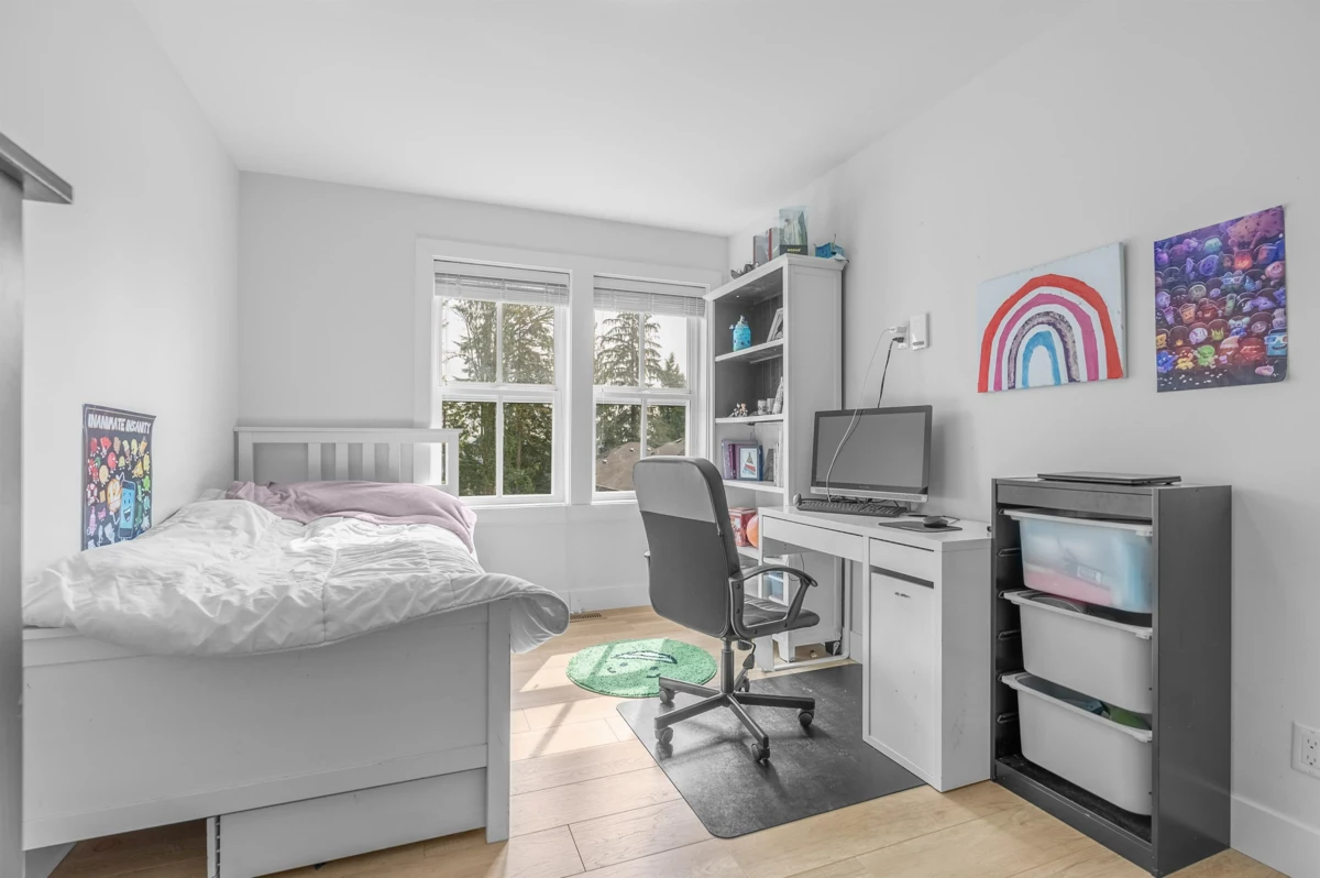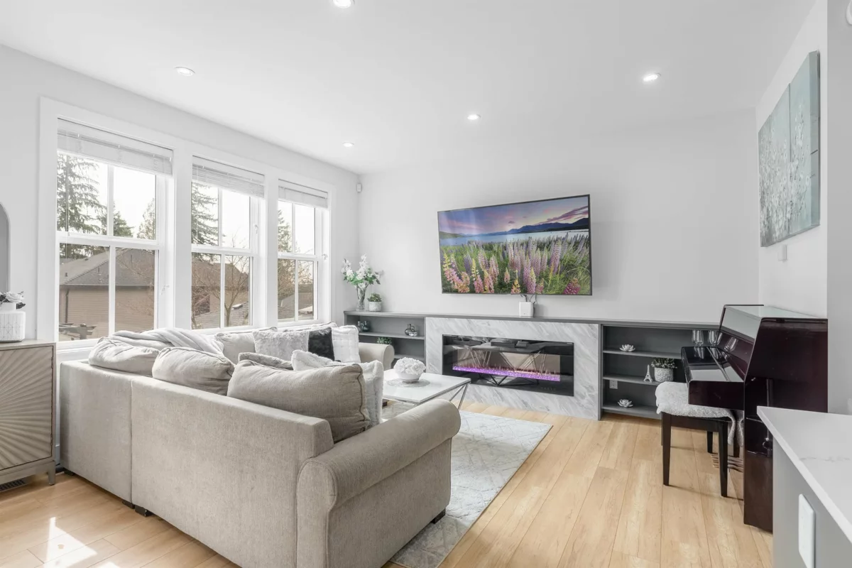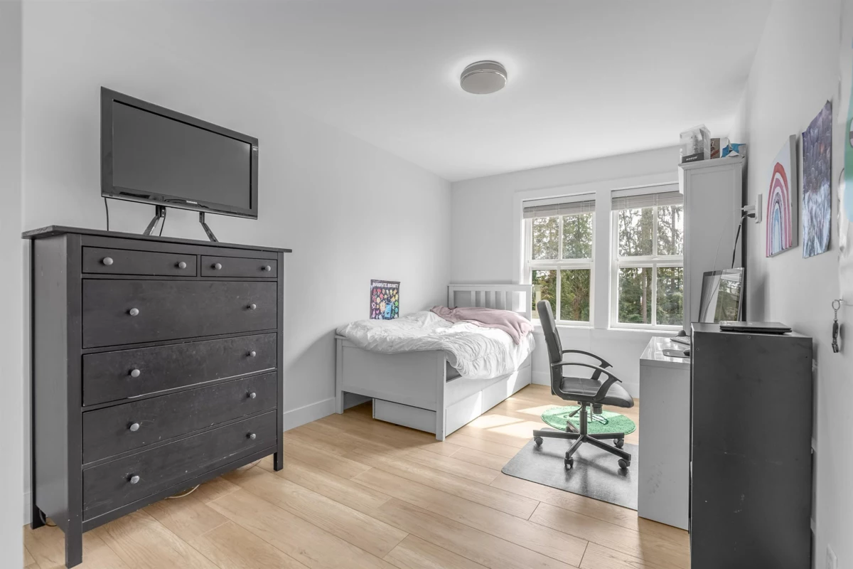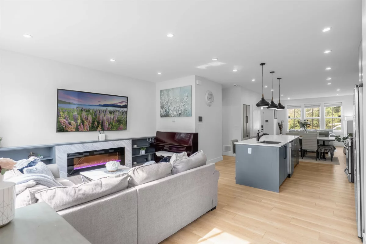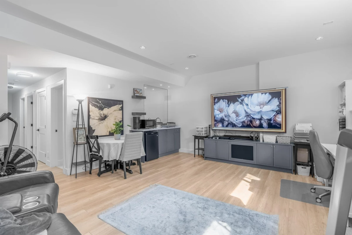 **NO STRATA FEES! Corner Unit Available. ** This modern row home in Burke Mountain features 4 bedrooms, 4 bathrooms, and a media room. The open layout includes a family room, living room, and formal dining room on the main floor, with 3 bedrooms and 2 bathrooms upstairs, and a guest bedroom with a full bathroom downstairs and a media room with a wet bar. The master bedroom has a stylish ensuite, feature wall, and walk-in closet. The property boasts a private yard with patio, three parking spaces, and street parking, all within a 5-minute walk to the elementary school and Queenston Park. Additional upgrades include air conditioning, home automation, a security system/camera, EV charging, central vacuum, paved backyard and more. Priced to Sell – Motivated Seller!