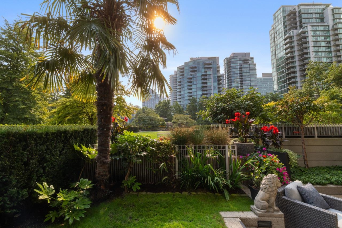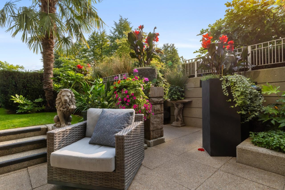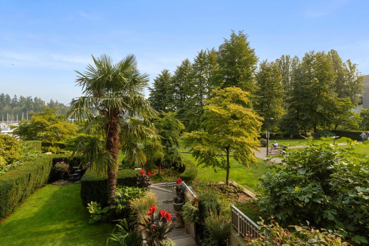 EXCLUSIVE WATERFRONT TOWNHOUSE AT BAYSHORE GARDENS II, JUST STEPS TO STANLEY PARK. Hard to believe this exists but it does! Imagine having your own private garden gate leading directly into parkland and onto the Seawall. You're surrounded by trees, away from the hustle and bustle, yet within easy walking distance of every imaginable amenity. Downsize without compromise, with 3 PARKING STALLS, 12' x 8' locker, and an incredible 1,300sf+ private patio/garden for your green thumb and your pets (2 dogs/cats). Tastefully renovated and laid out on just two levels, the expansive main floor flows seamlessly out onto the extraordinary outdoor space.The upper level enjoys exquisite park, marina and water views from the stunning primary suite, 2nd bedroom/office and lovely upper deck. SO SPECIAL!