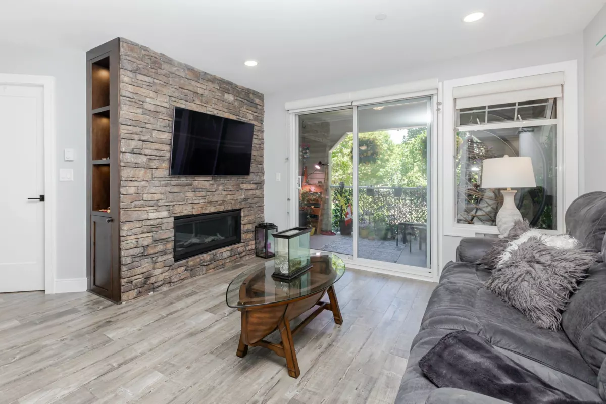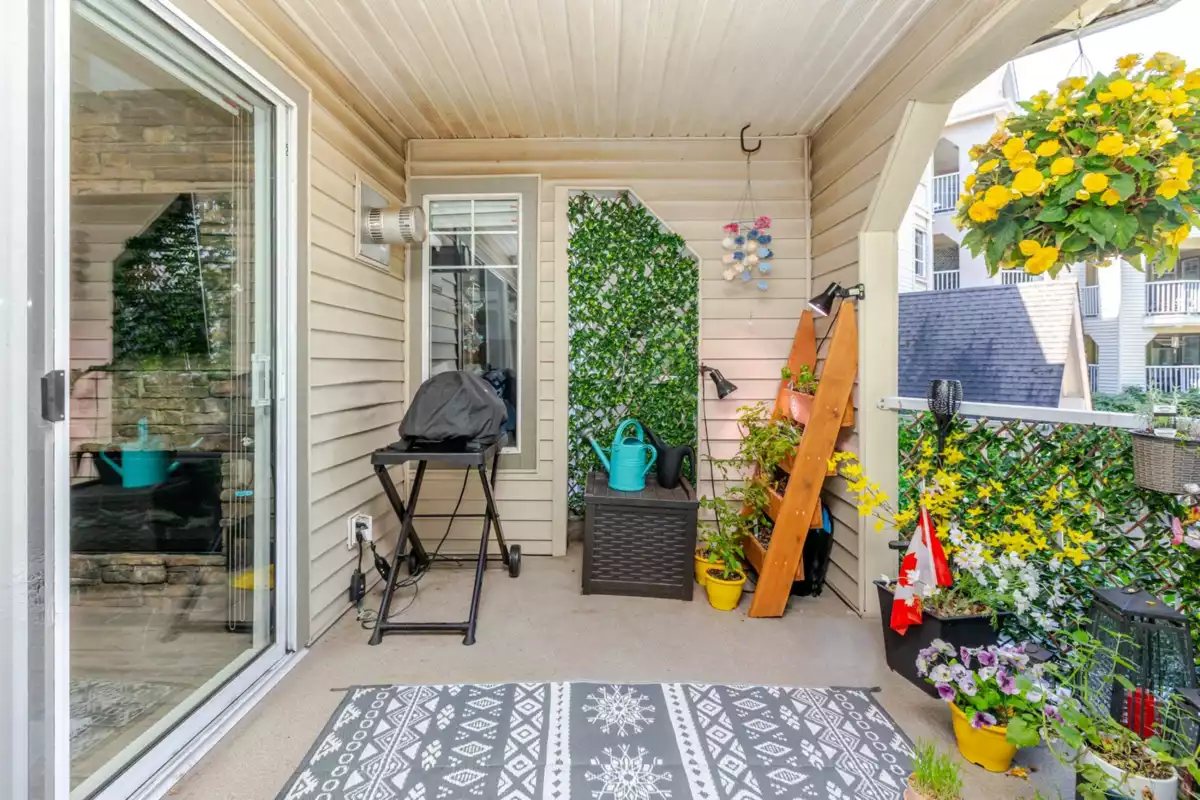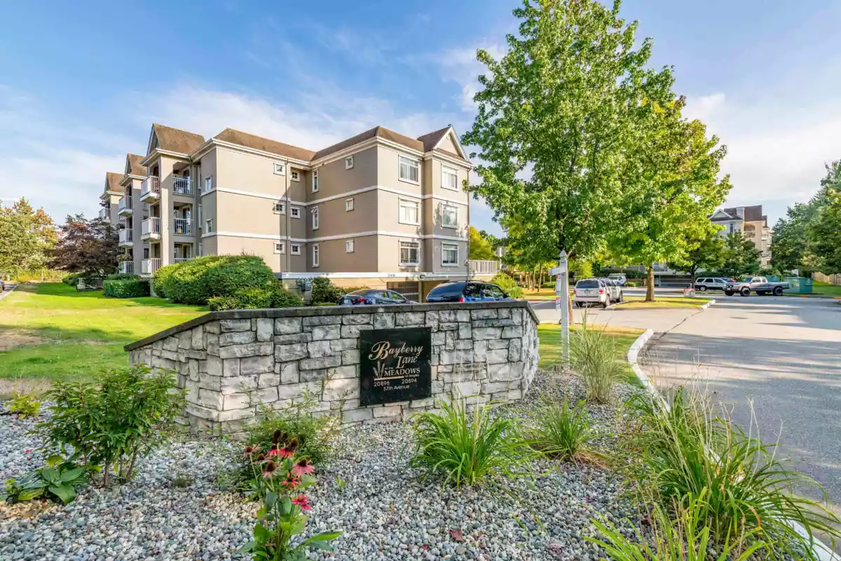 Welcome to Bayberry Lane! Nestled in a quiet Langley City neighbourhood walk to shops, amenities & close to several parks & walking trails. Elevated above ground condo with over 1000 sq ft of living space with Primary & 2nd bed & bath at opposite ends for total privacy. Primary easily fits a king bed, has his/hers walk through closets & ensuite with DBL shower. Totally renovated with a showstopper kitchen featuring S/S appliances, elegant 2 tone shaker cabinets, tons of quartz counters including huge peninsula. Kitchen extends to the large laundry with additional cabinets & side by side modern washer/dryer. Open plan dining & living room with cozy gas fireplace & access to the large balcony, perfect for entertaining, overlooking the courtyard & water feature. Pet friendly for dogs & cats.