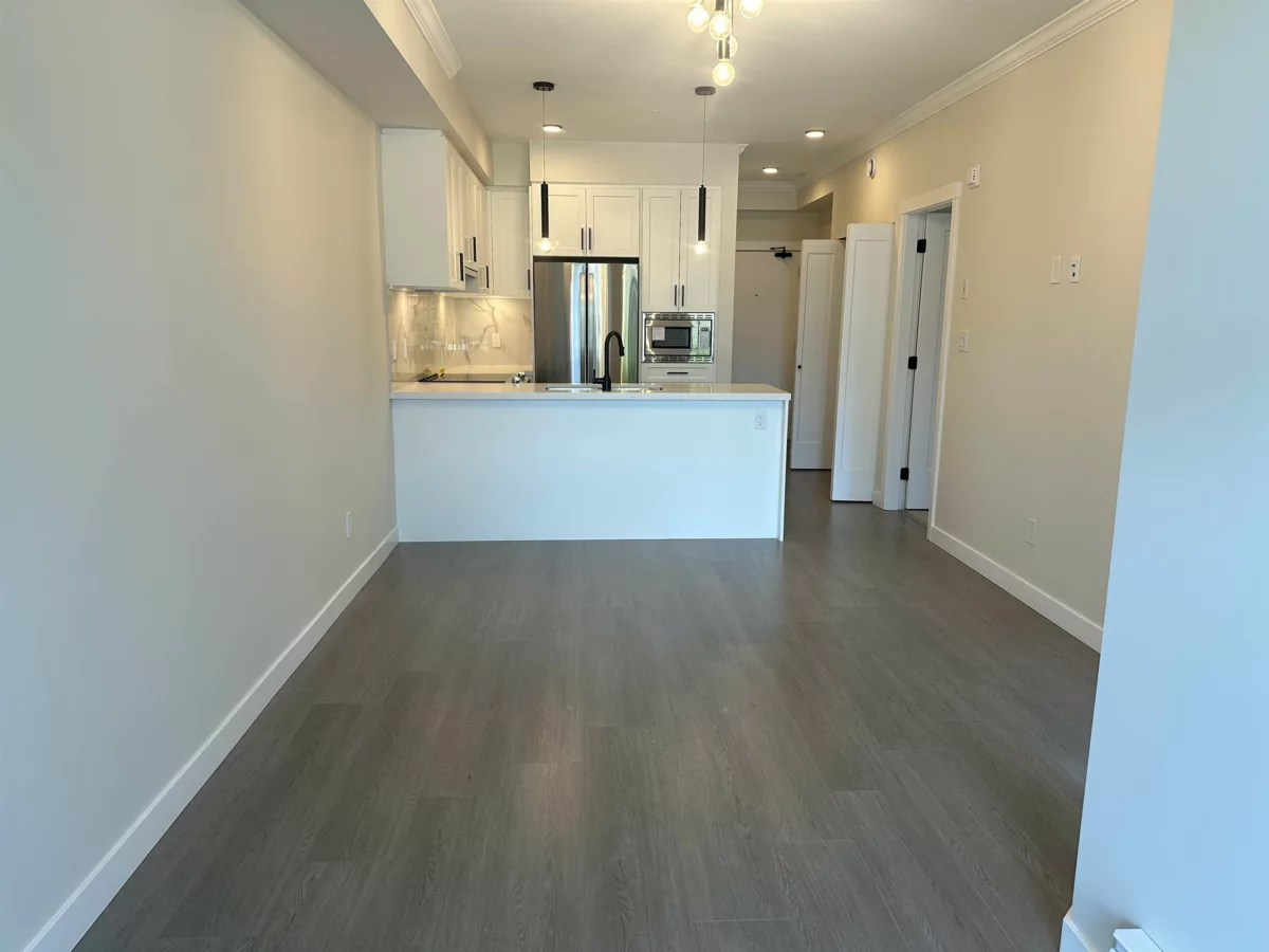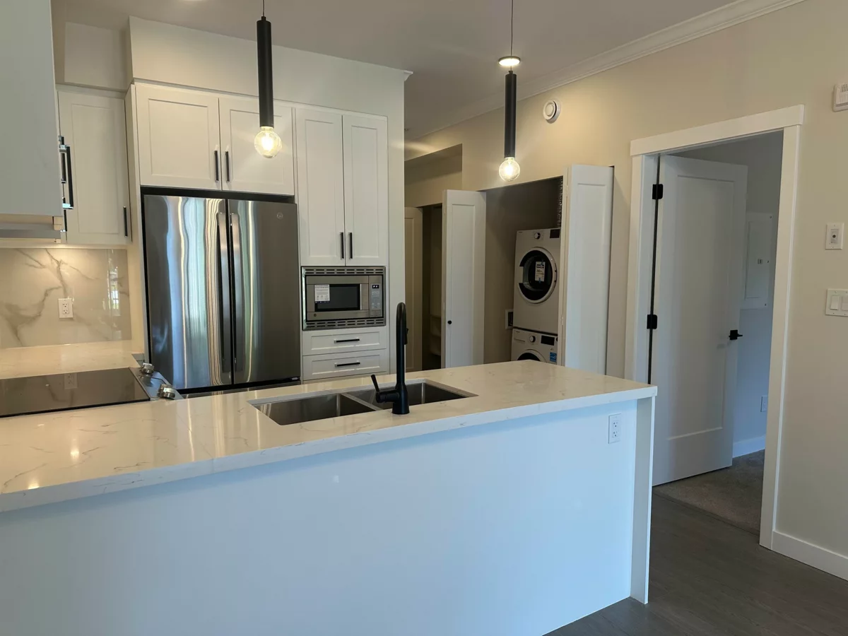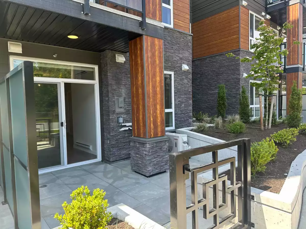 Brand new ground floor, 2 bedroom, 2 bath unit in Inspire development in Central Maple Ridge. Quartz countertops, undermount sinks, stainless steel appliances and AIR CONDITIONING! The unit includes 2 parking spaces and a bike/storage locker. The complex includes an amenities room, full service gym/yoga room, and a generous outdoor common area. Great location in the building. Ground floor unit means that your outdoor patio area has room to spread out and has a gate to the street for convenient dog walking.