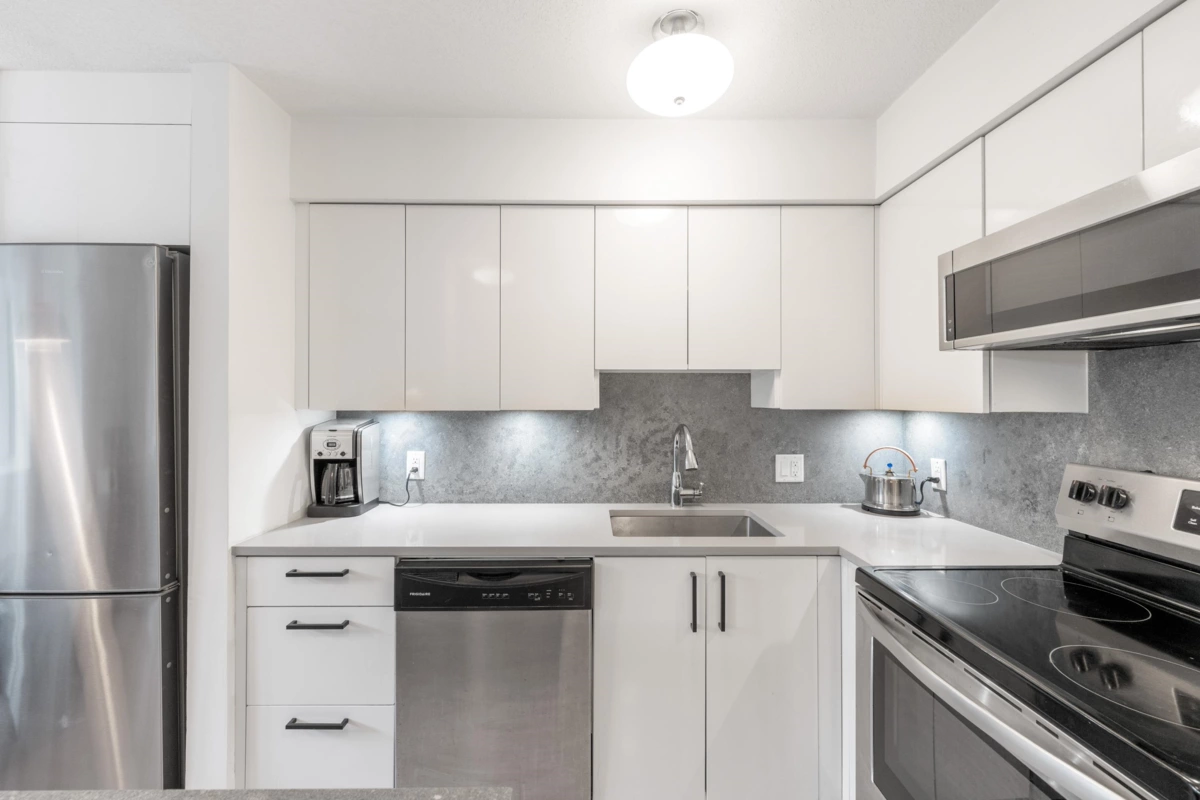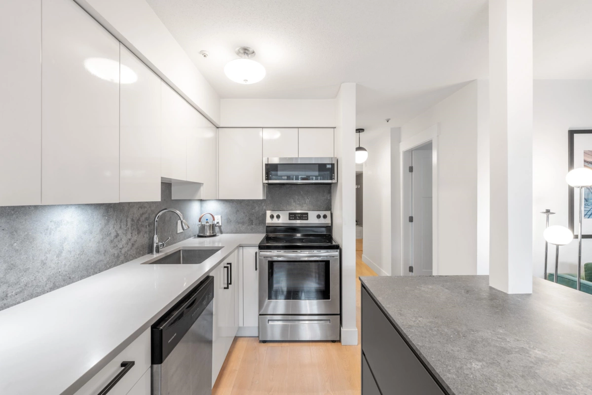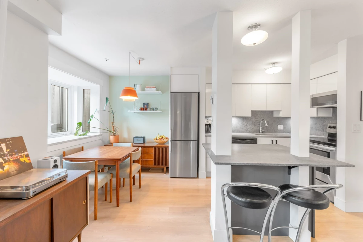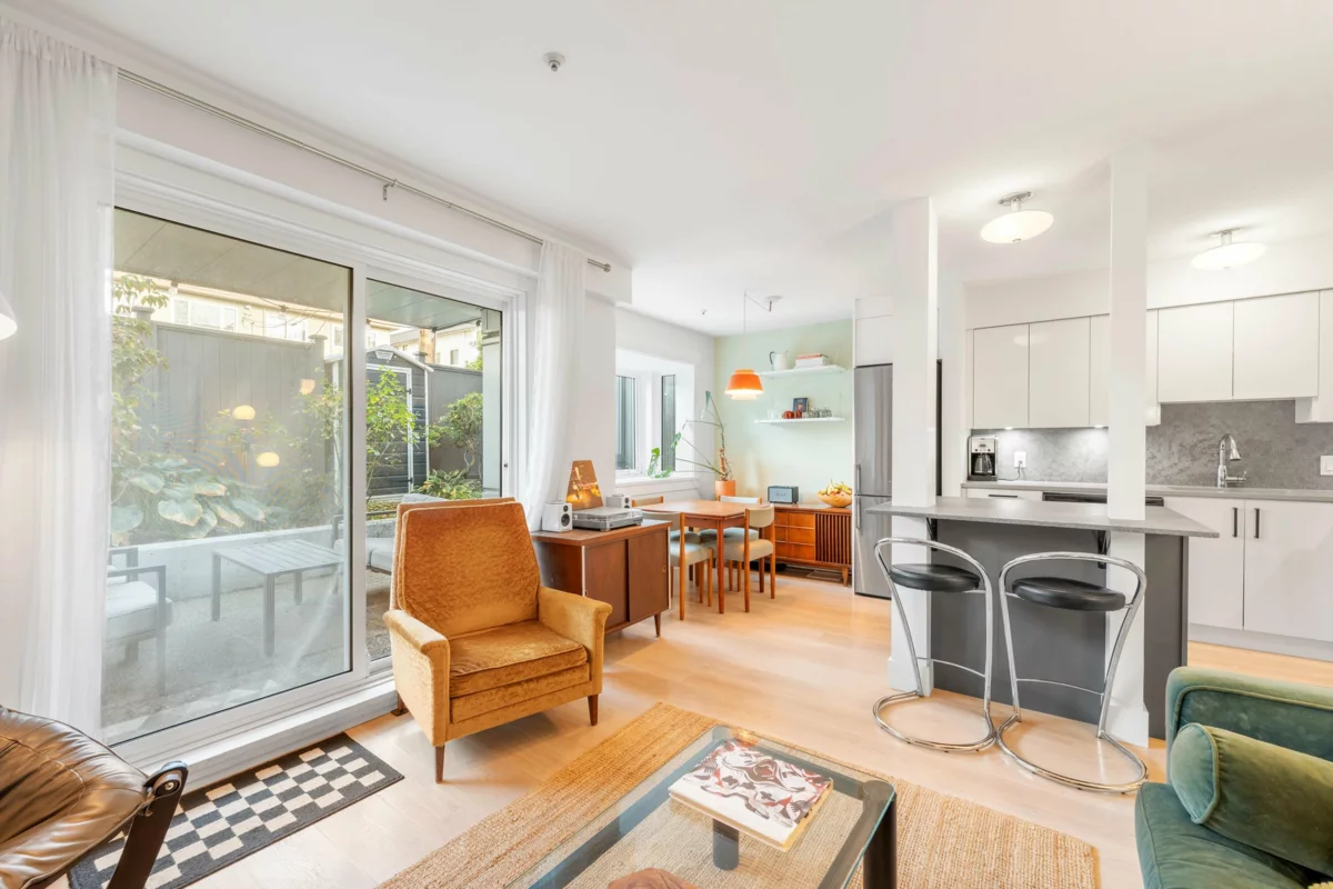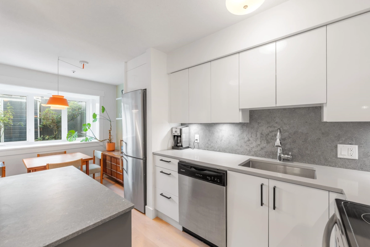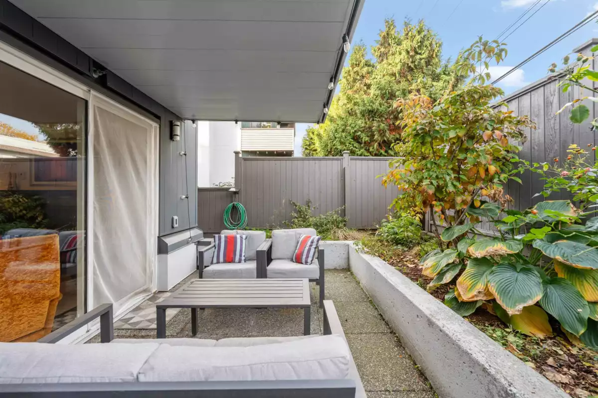 Discover this beautifully updated 2-bedroom + den ground-floor home on the quiet side of a friendly, pet-welcoming community just minutes from downtown. Thoughtfully renovated with modern finishes, it features a stylish kitchen with custom cabinetry, quartz countertops, and stainless steel appliances, plus a versatile enclosed den perfect for a home office or storage. Step outside to your spacious private patio—ideal for BBQs, entertaining, gardening, or relaxing in the open air—with room for your own storage shed. Convenient transit access, nearby shops, and restaurants complete this offering of modern urban living in one of Vancouver’s most connected locations. Call today to view your new home
