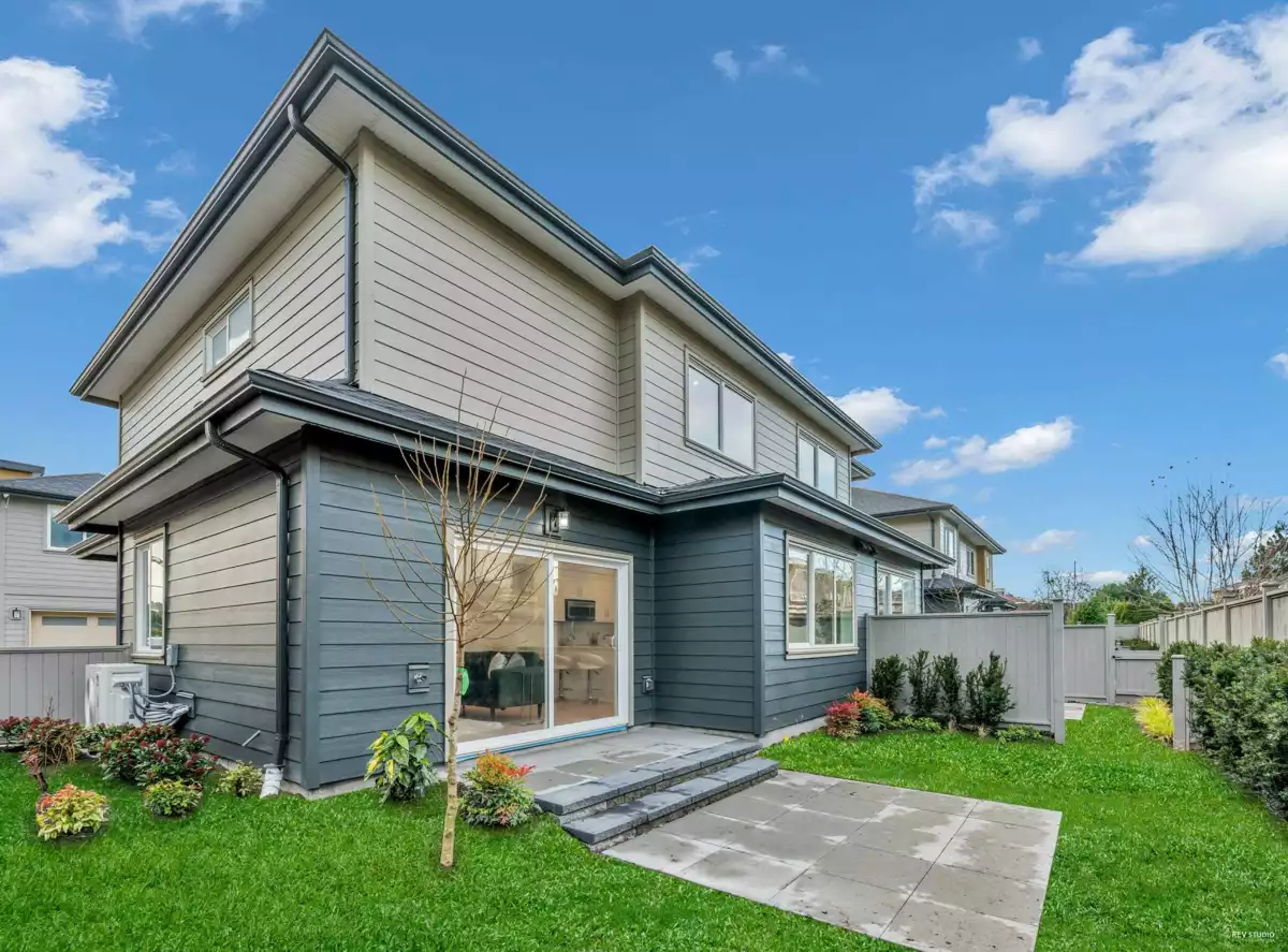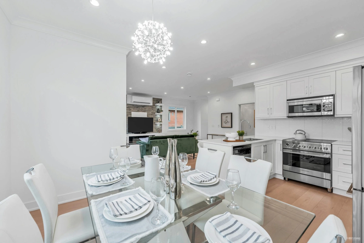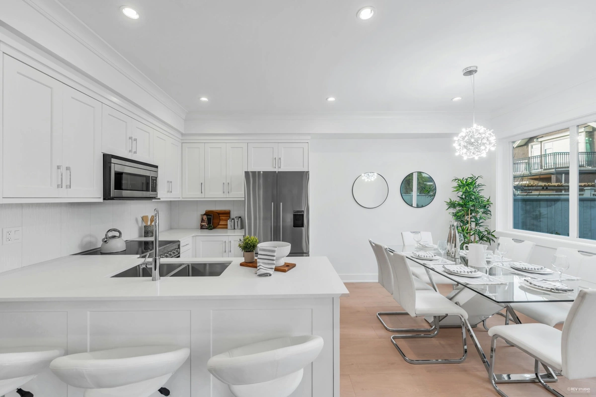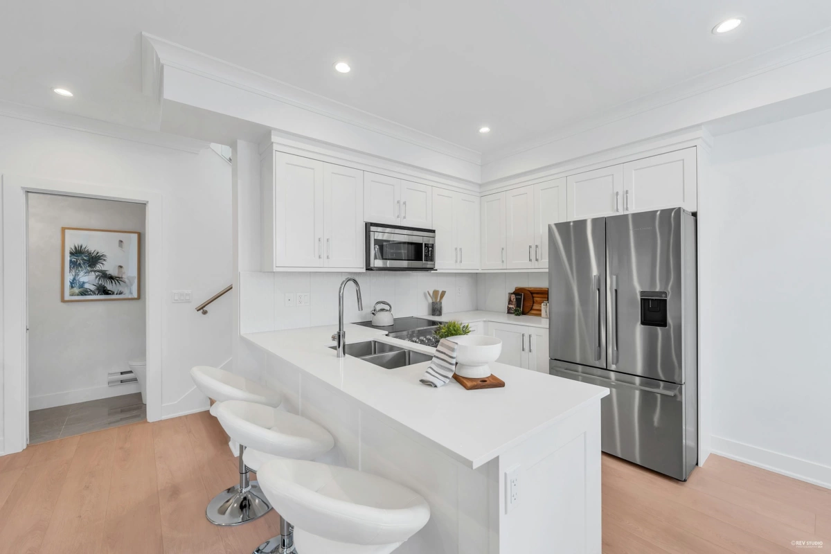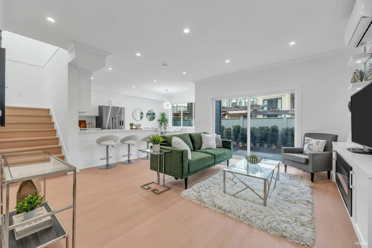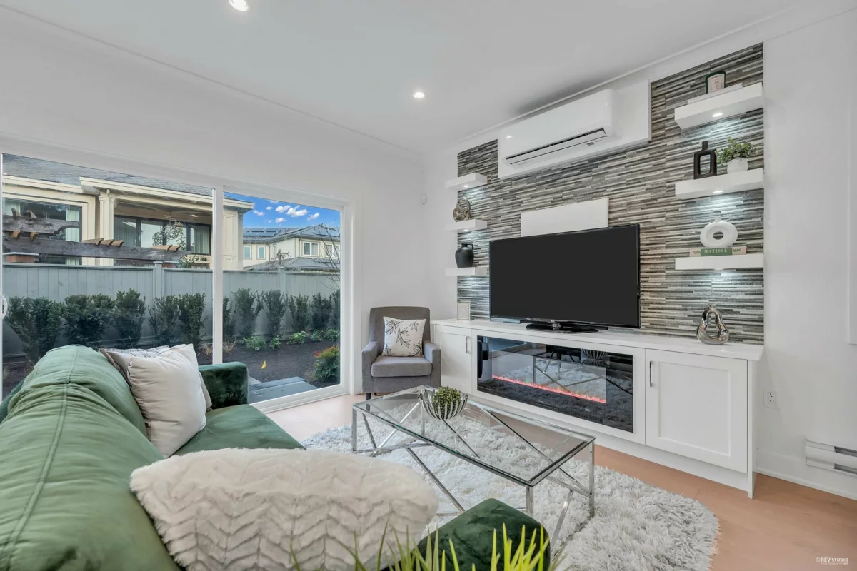 This modern 2-story townhome boasts high end finishes with abundance of natural light and a functional open floorplan. The gourmet kitchen features SS appliances, quartz countertops, and work island seating that is adjacent spacious dining room. The cozy living area features built-in entertainment cabinetry, under lit shelving with modern electric fireplace and contemporary wide plank laminate flooring. All generous sized bedrooms, with 2nd bedroom offering cheater ensuite bath and 3rd bedroom with study area. Complete with AC, HRV, Heat Pump, plus electric baseboard. DOUBLE car garage with EV outlet and more. Convenient central location close to both school levels, South Arm Community Center offering Pickleball & Tennis Courts, outdoor pool, and Athletic fields.