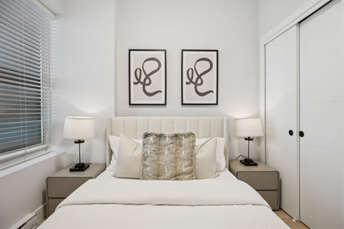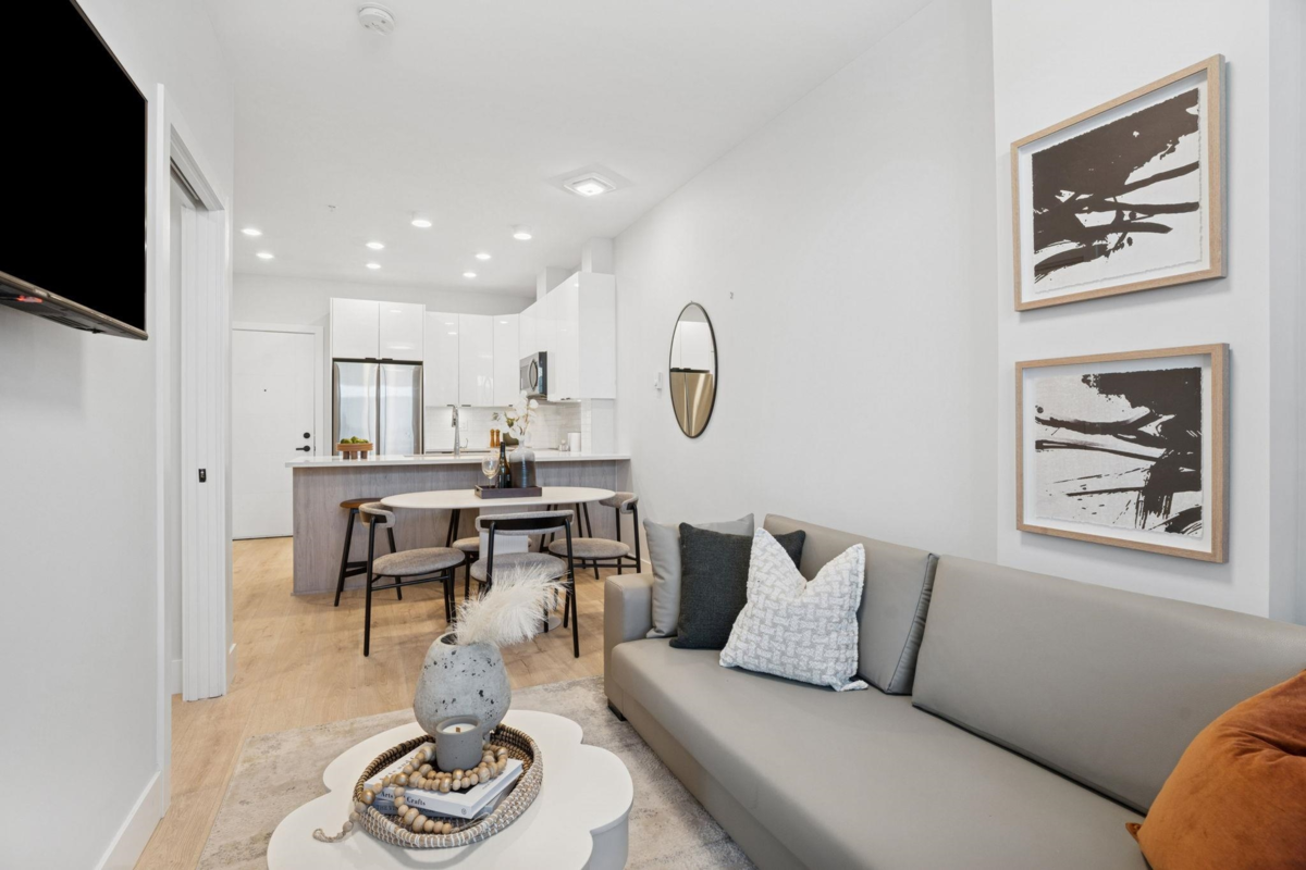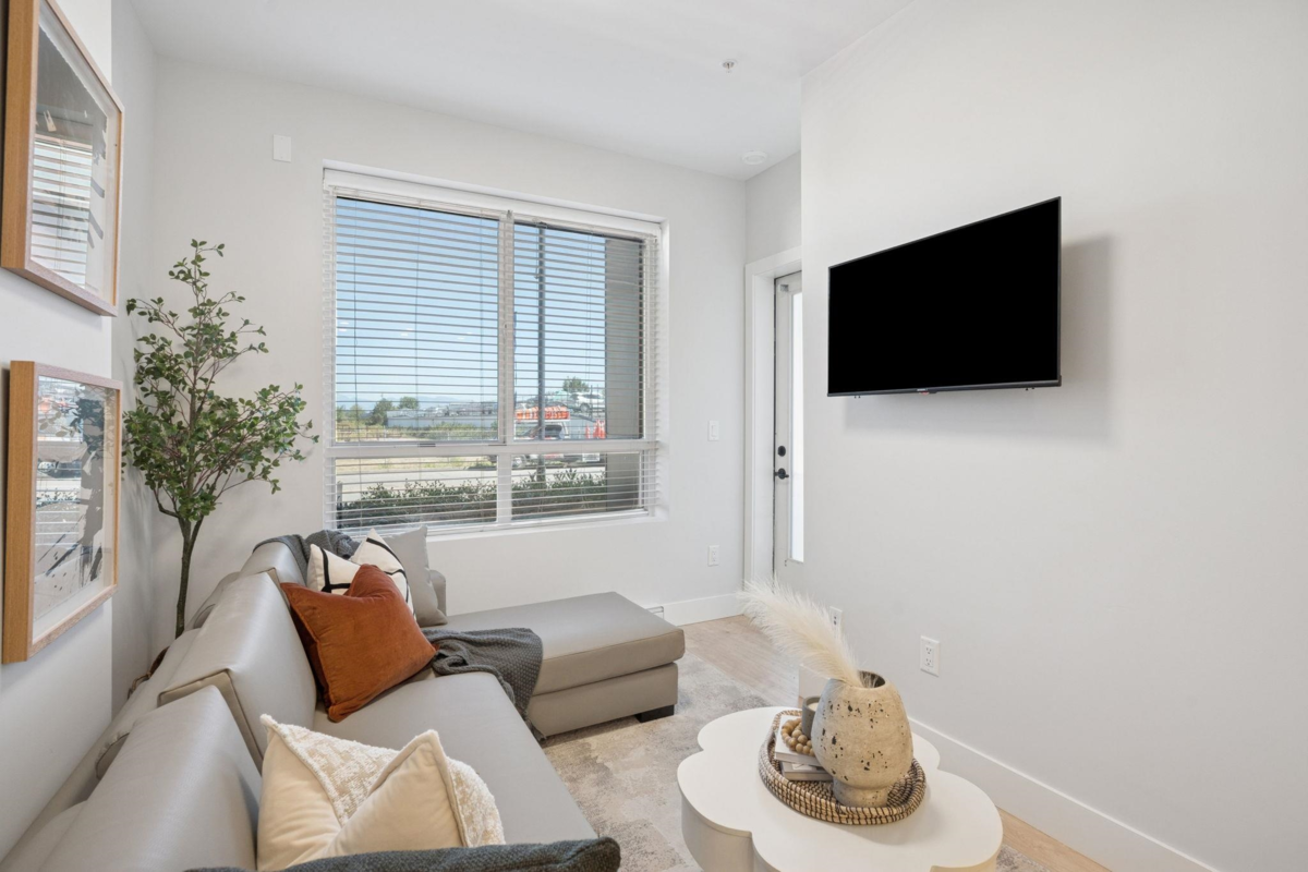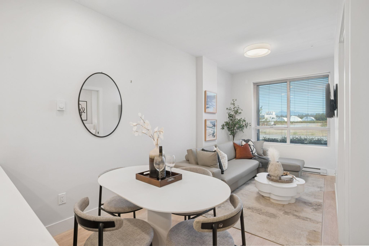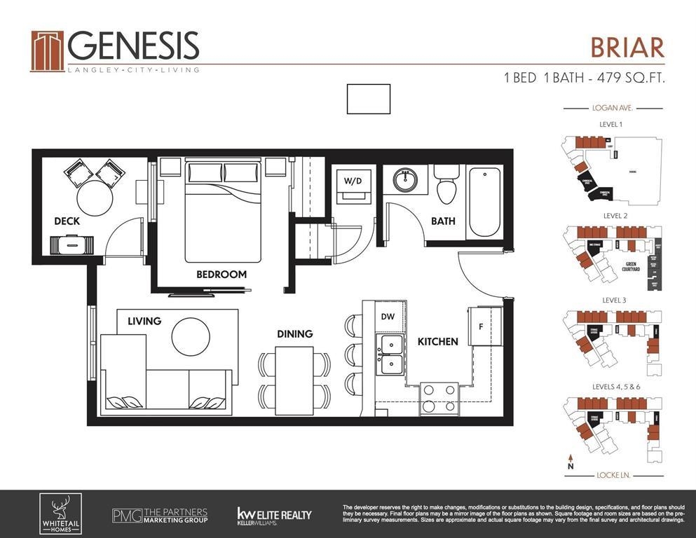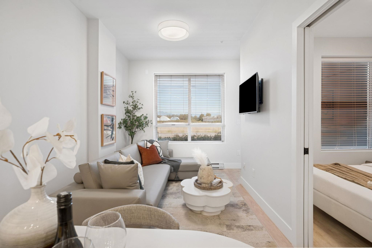 Newly Renovated and move-in ready! This 1 bed, 1 bath unit in the sold-out GENESIS by Whitetail Homes offers 460 sq ft of bright, open-concept living. Closet new project in Langley to future skytrain station. Recently fully redone after an insurance claim, it features brand new quartz counters, stainless steel appliances, wide-plank laminate flooring, and a spa-style bath and 9 foot ceilings. Enjoy year-round use of the covered patio and ground level entrance. The building offers excellent amenities including a gym, landscaped courtyard with putting green, and meeting rooms, Located steps from future SkyTrain, shopping, restaurants, and schools. Rentals and 2 pets allowed-ideal for investors or first-time buyers!
