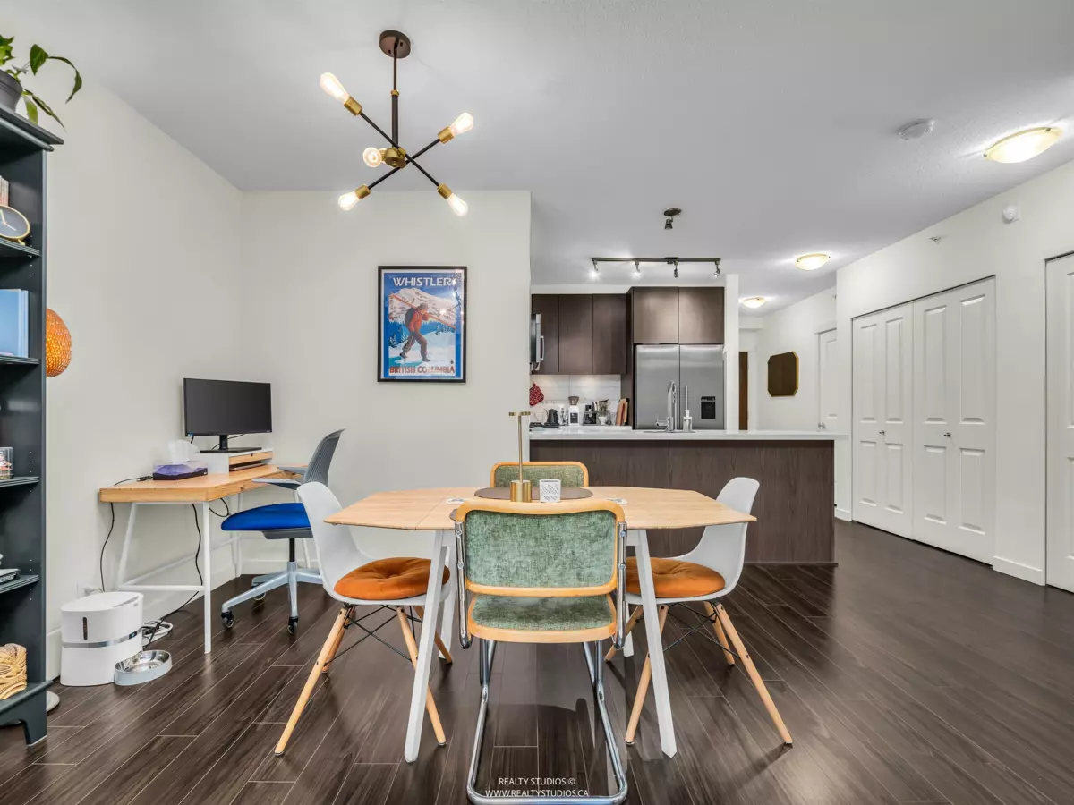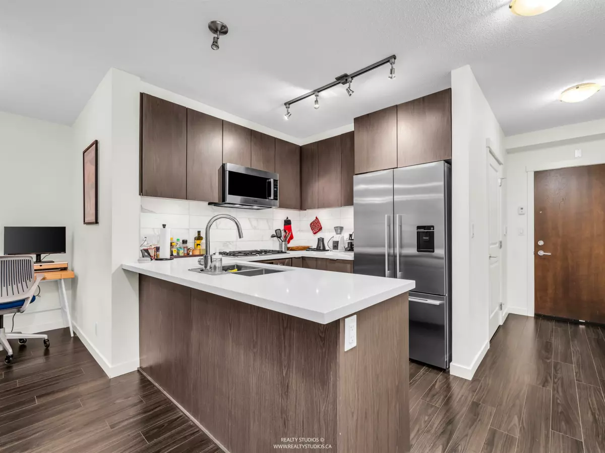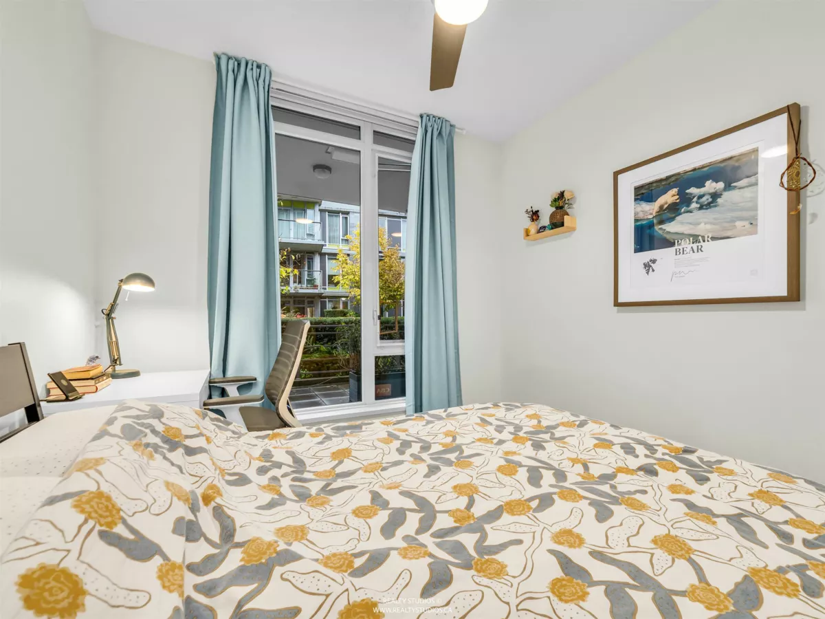 Prime River District 1 BEDROOM + DEN GROUND FLOOR concrete building by POLYGON with its own safe private covered WALK OUT PATIO (282sq ) for pets or young children. West Coast modern architecture featuring brick and concrete facades with a spacious, 9' ceiling and an open floor plan. Laminate floors & Stainless steel appliances Up-to-date & fully equipped fitness room and huge party room. 1 parking space with a lot of visitor parking. Just mins driving to Metrotown, Richmond and Marine gateway. Walking distance to the Fraser River trails, parks, Save On Foods, Shoppers Drug Mart, and Romer's Burger Bar. Clean and well-maintained unit in move-in condition. A MUST SEE AND QUICK POSSESSION POSSIBLE.
