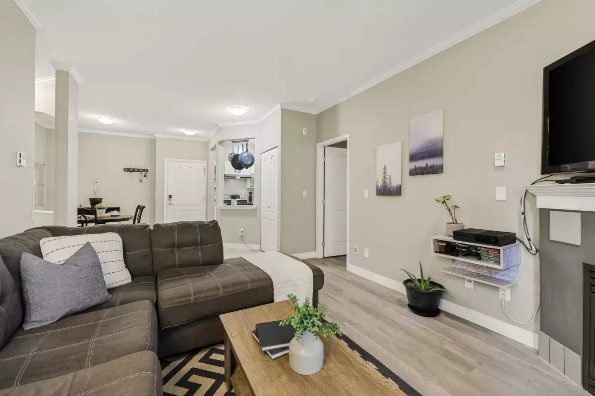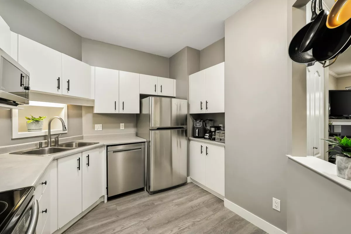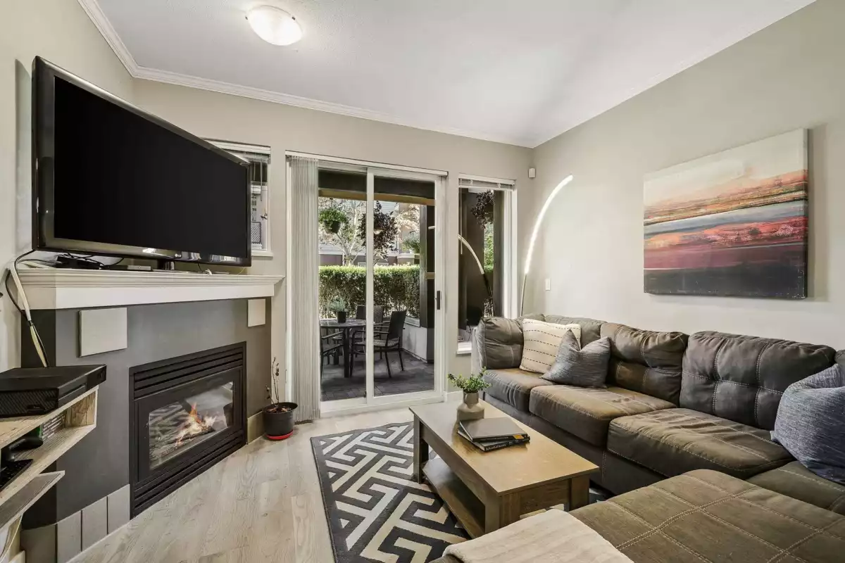 CORNER, GROUND Floor unit in sought-after City Grande! This 2Bdrm/2Bth is beautifully updated with wide-plank floors throughout PLUS new SS appliances in your bright kitchen w/double-sinks + ample storage. The generous Primary offers plenty of closet space + your private 3-pce Ensuite. Enjoy the abundant natural light, a cozy gas fireplace & private covered deck perfect for relaxing or entertaining. Convenient in-suite laundry space provides extra storage. Close to shops, cafes, near Lynnwood Park & upcoming SkyTrain. Well-maintained complex amenities include Exercise, Billiards & Rec rooms. Secure underground parking + storage locker. This condo is move-in ready!
