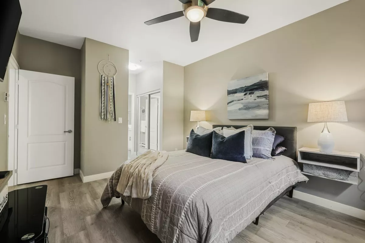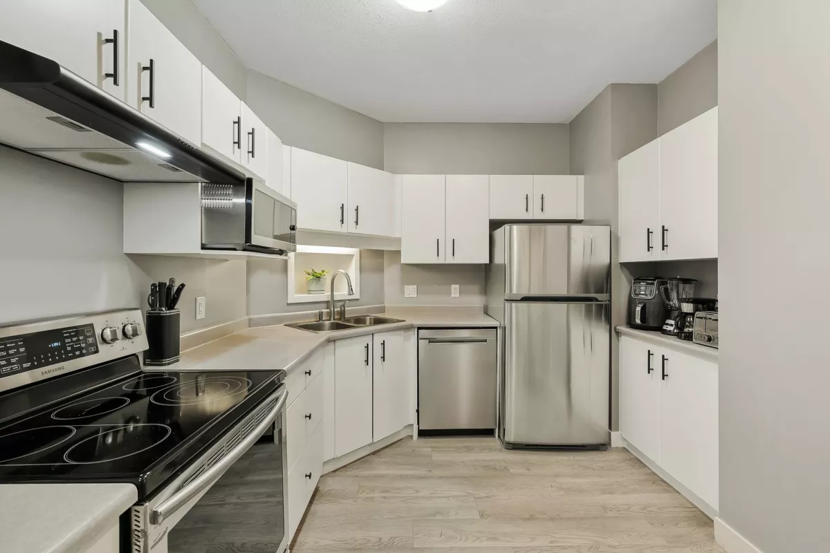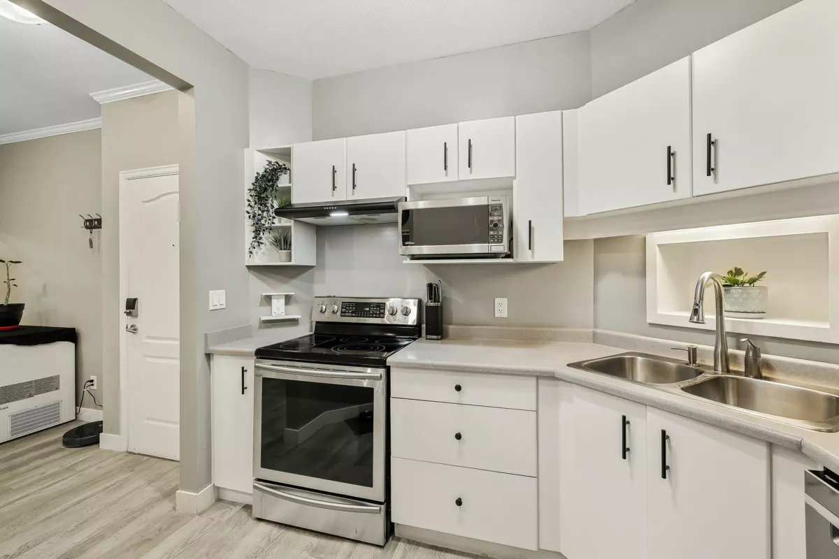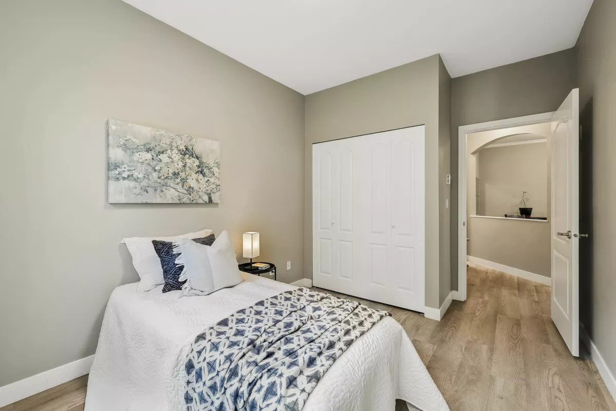CORNER, GROUND Floor unit in sought-after City Grande! This 2Bdrm/2Bth is beautifully updated with wide-plank floors throughout PLUS new SS appliances in your bright kitchen w/double-sinks + ample storage. The generous Primary offers plenty of closet space + your private 3-pce Ensuite. Enjoy the abundant natural light, a cozy gas fireplace & private covered deck perfect for relaxing or entertaining. Convenient in-suite laundry space provides extra storage. Close to shops, cafes, near Lynnwood Park & upcoming SkyTrain. Well-maintained complex amenities include Exercise, Billiards & Rec rooms. Secure underground parking + storage locker. This condo is move-in ready!