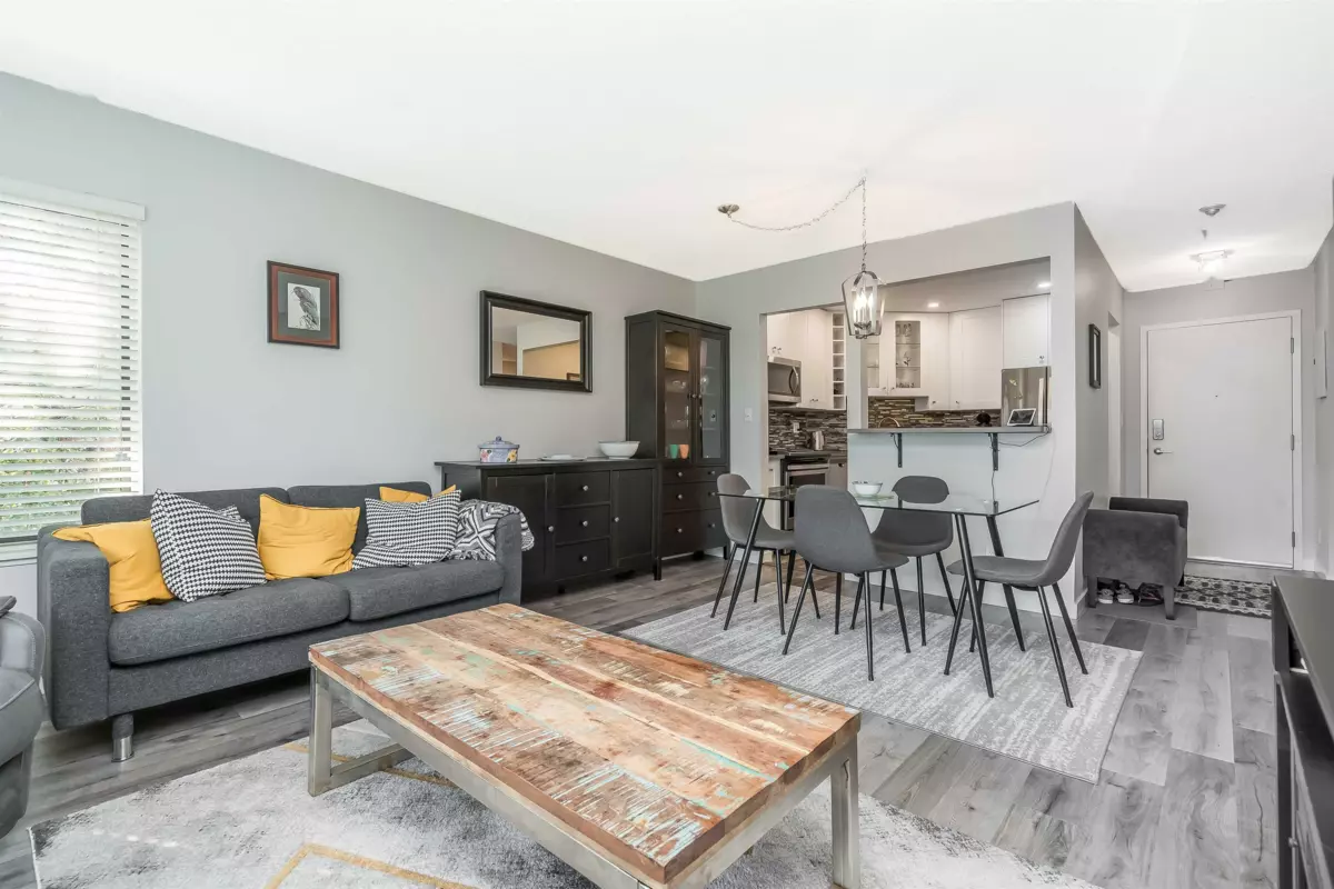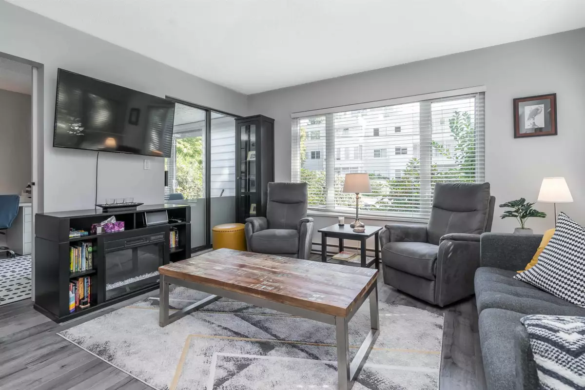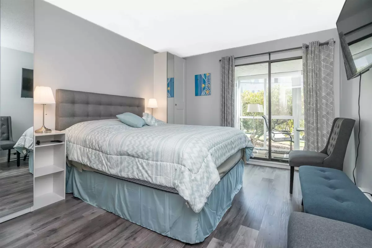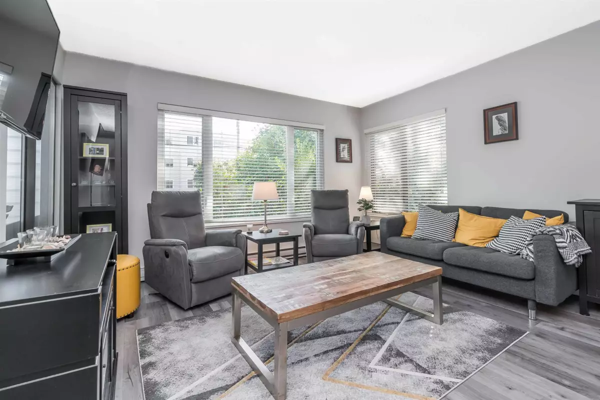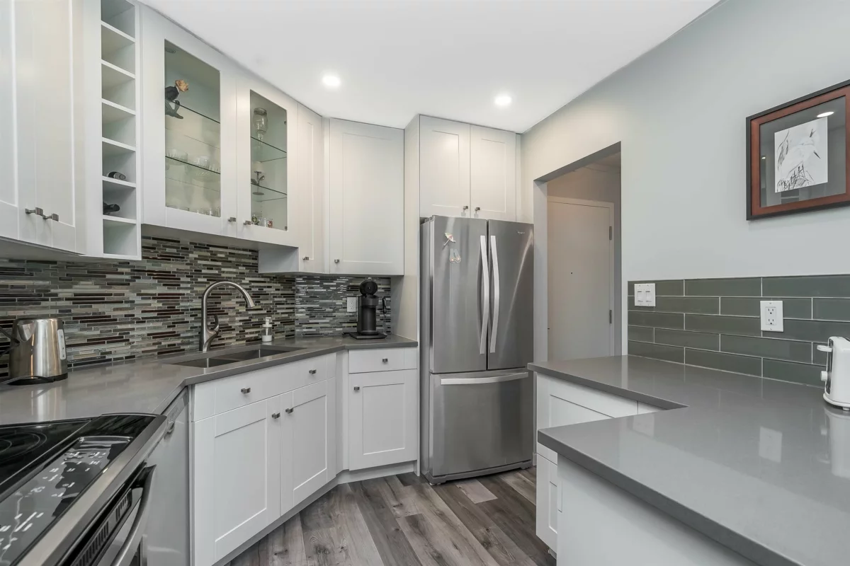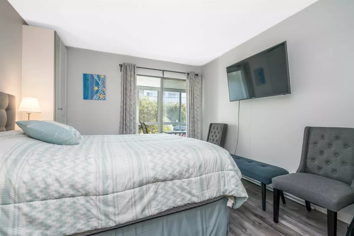 Summerhill. MOVE-IN READY! Furnished & beautifully updated 2 bed, 2 bath home in the heart of White Rock. Immaculate and well designed condo offers a modern kitchen with quartz countertops, white cabinetry, stainless steel appliances (new fridge) & double sinks. Designer colour scheme, stylish laminate flooring throughout with a bright spacious living room offering unique sliding barn doors leading into the 2nd bedroom. Primary bedroom has walk thru his/her closets & extra built in storages beside the bed. Enclosed sunroom (included in sq.ft.) with sliding glass doors & bonus storage! 1 parking stall & storage locker underground. Condo includes furniture. Centrally located within walking distance to White Rock town centre with its many shops & restaurants. 55+ age restriction & 1 cat ok.