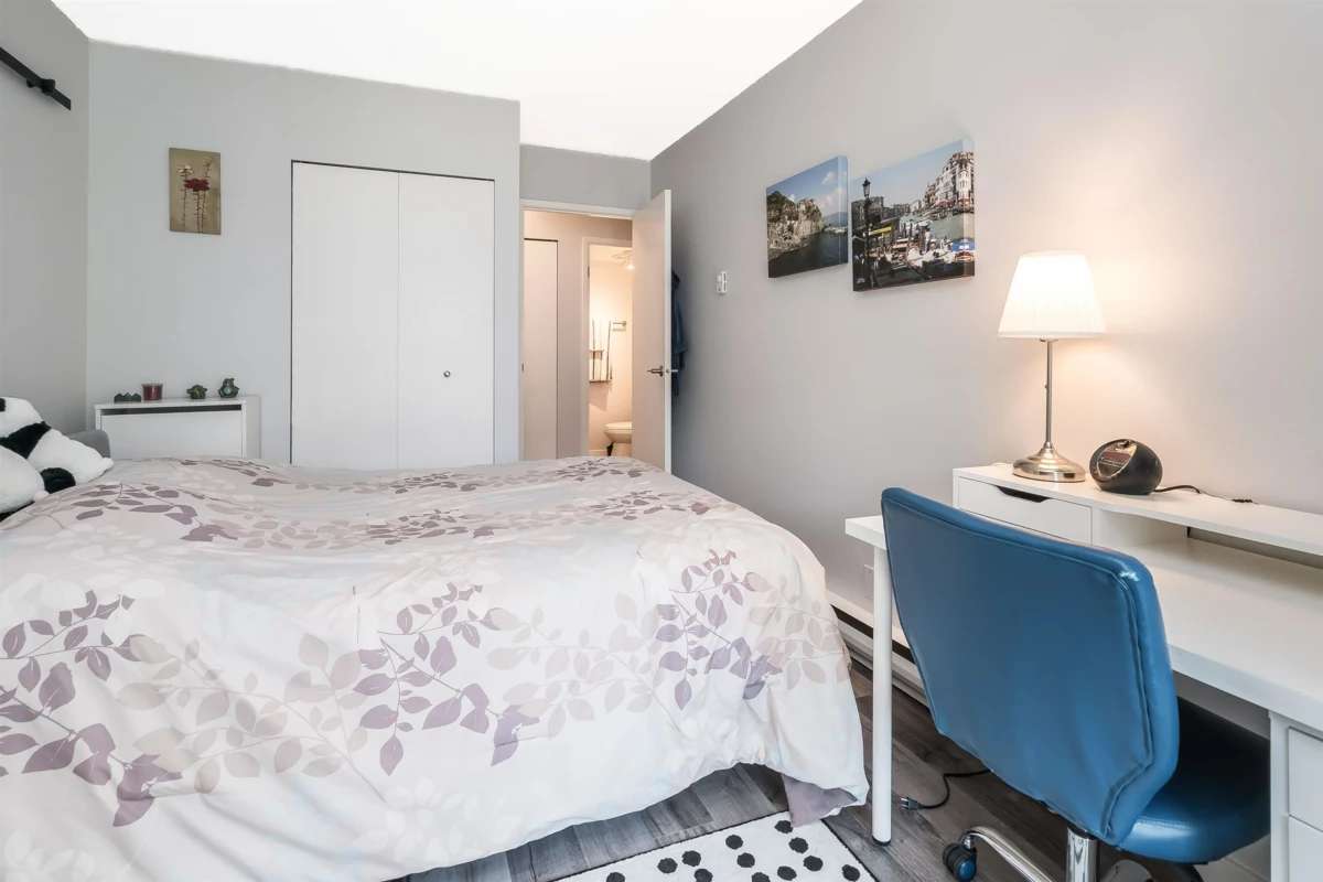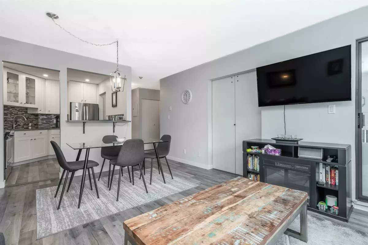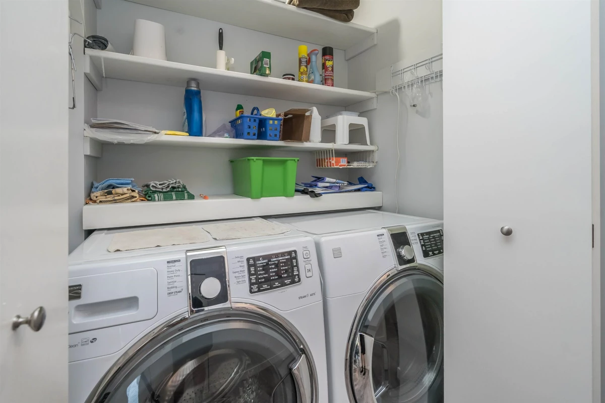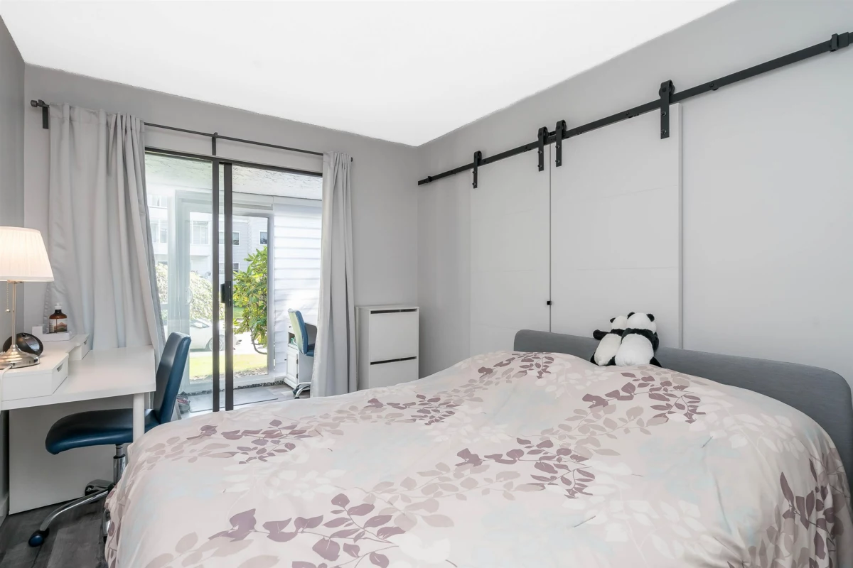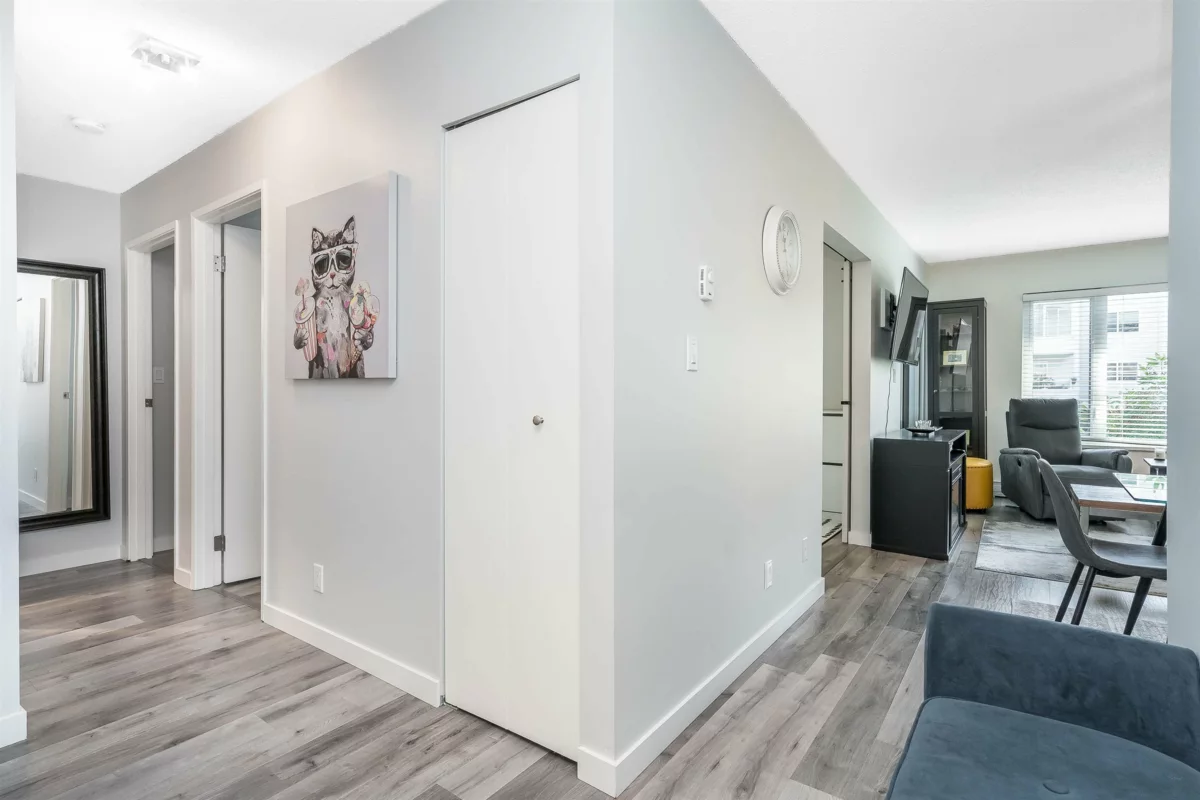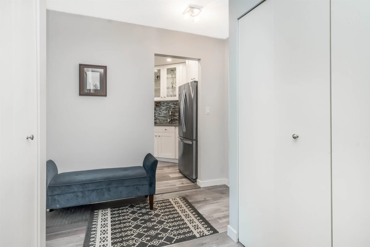 Summerhill. MOVE-IN READY! Furnished & beautifully updated 2 bed, 2 bath home in the heart of White Rock. Immaculate and well designed condo offers a modern kitchen with quartz countertops, white cabinetry, stainless steel appliances (new fridge) & double sinks. Designer colour scheme, stylish laminate flooring throughout with a bright spacious living room offering unique sliding barn doors leading into the 2nd bedroom. Primary bedroom has walk thru his/her closets & extra built in storages beside the bed. Enclosed sunroom (included in sq.ft.) with sliding glass doors & bonus storage! 1 parking stall & storage locker underground. Condo includes furniture. Centrally located within walking distance to White Rock town centre with its many shops & restaurants. 55+ age restriction & 1 cat ok.