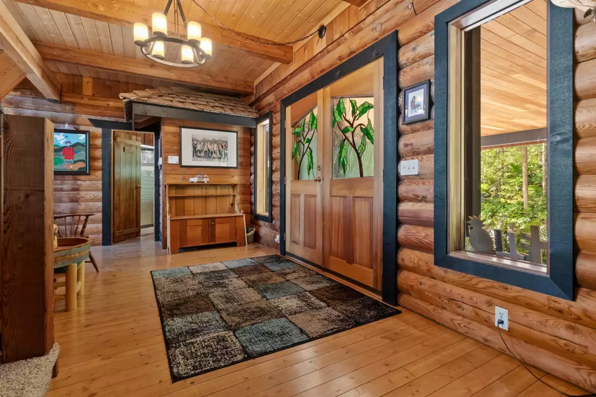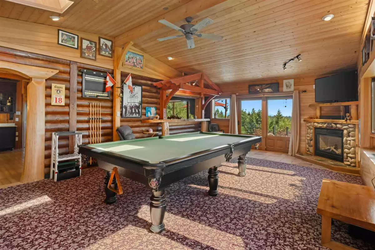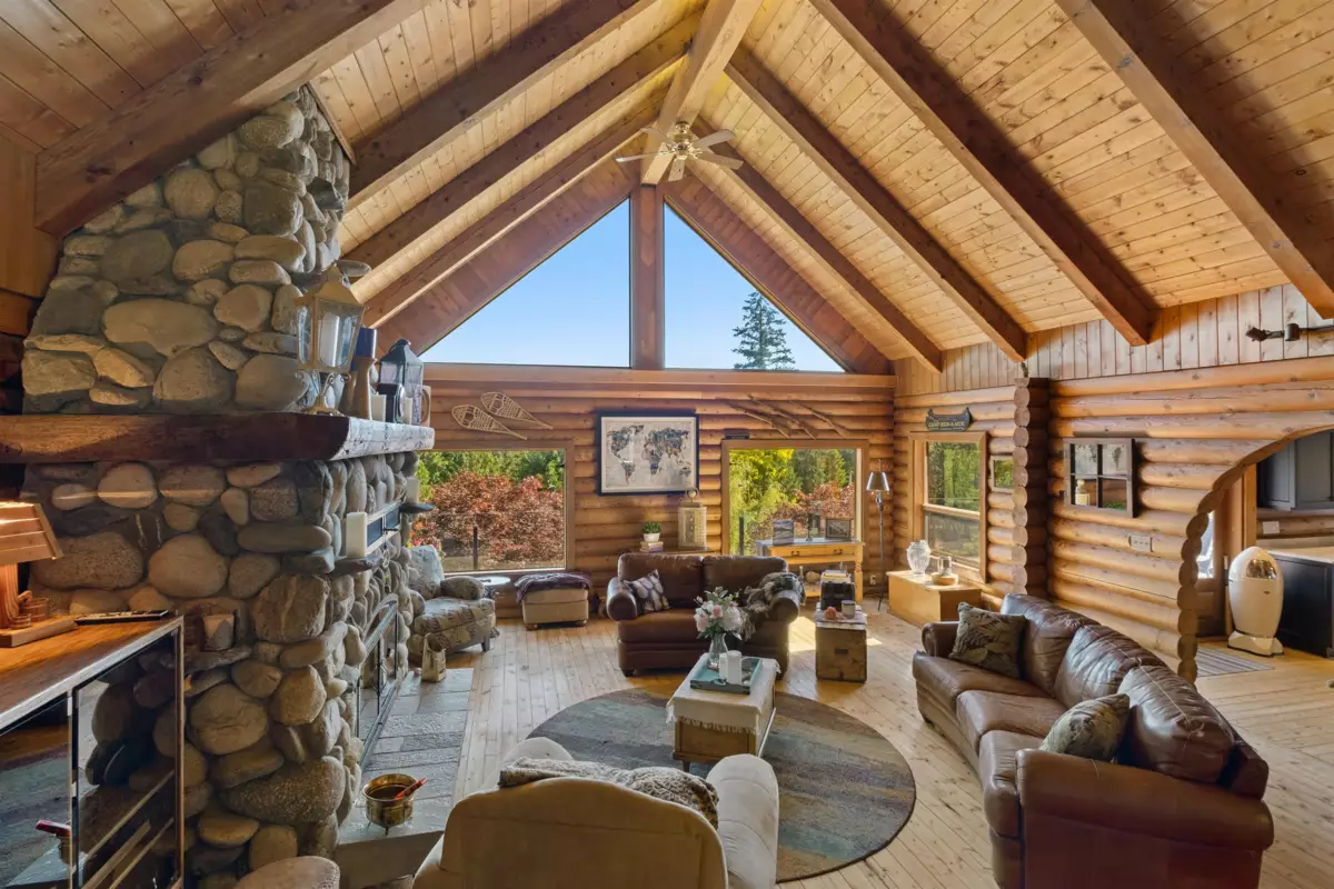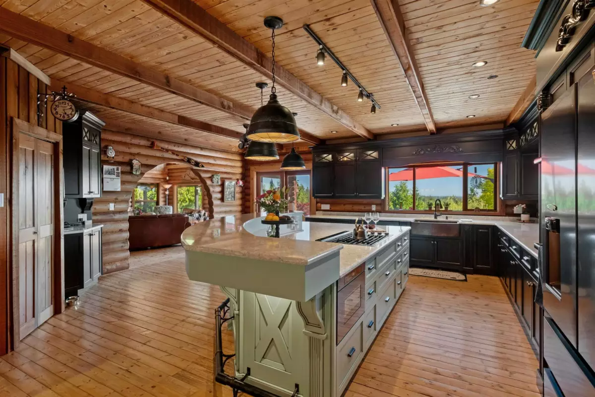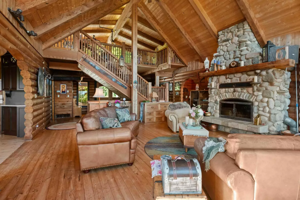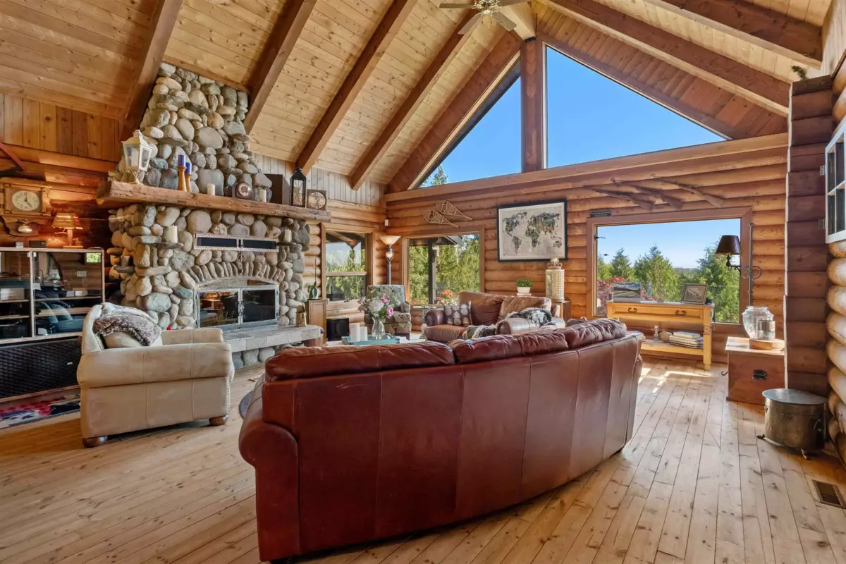 Welcome to your private paradise! This spectacular custom 4,188 sqft log home features 180 degree panoramic views while nestled on a sprawling 5.01 acres. Incredible wood work through out the home. Tons of natural sunlight into games room, kitchen and large living room with vaulted ceilings. Upgraded kitchen with pantry is an entertainers dream with Dacor appliances, an expansive island and a dedicated eating area. Primary bedroom is on the main floor with a walk-in closet and a spacious ensuite bathroom. In the basement, the laundry and 2 bedrooms with a full bathroom await as well as a spacious living room. The property also includes a 2,780 sqft detached heated garage with 3 bay doors with space for RV parking inside w/200amp service. Amazing outdoor lighting throughout the property.