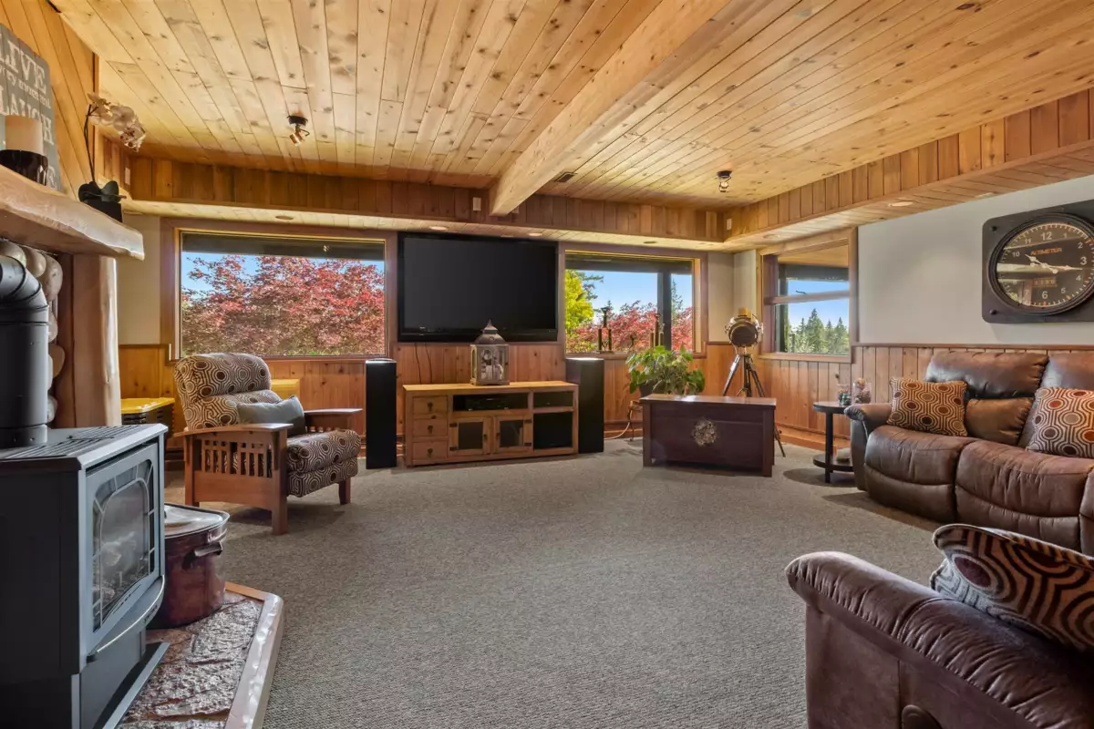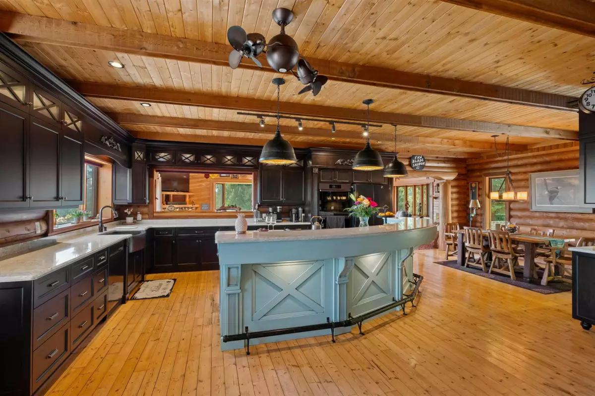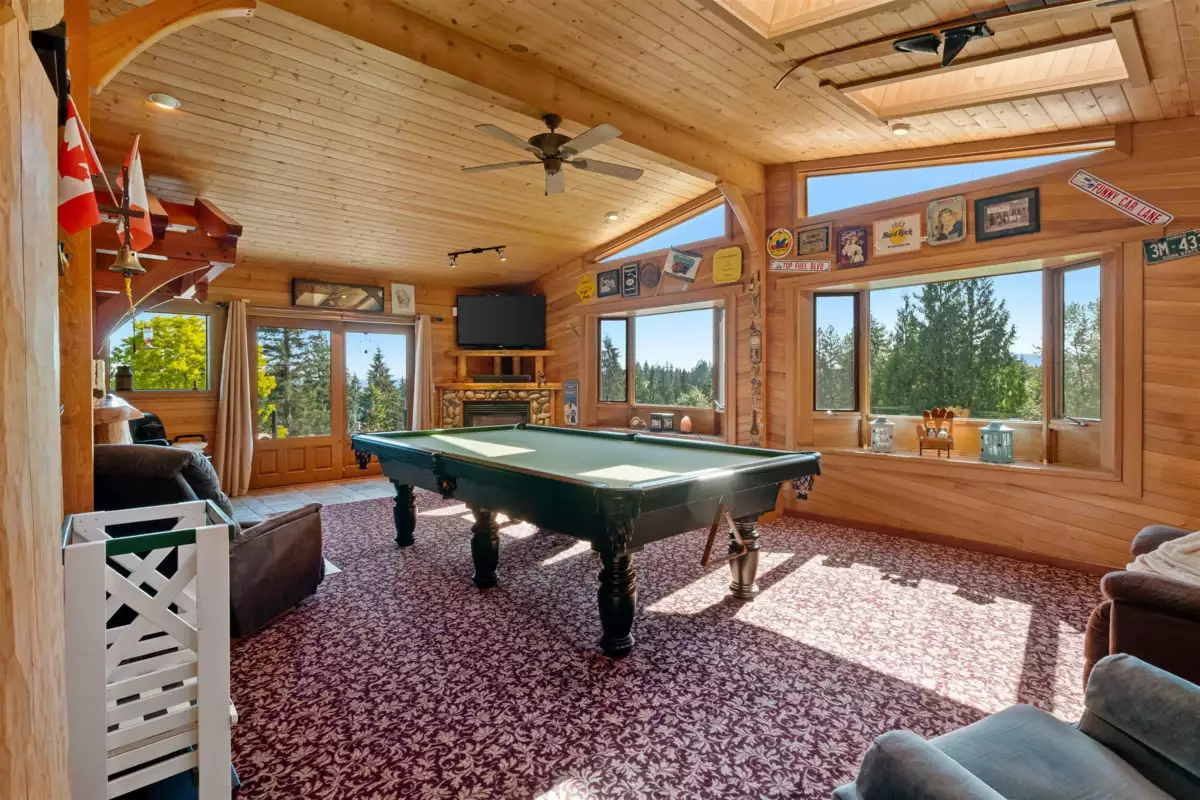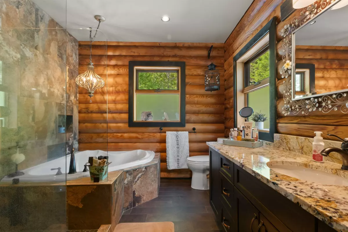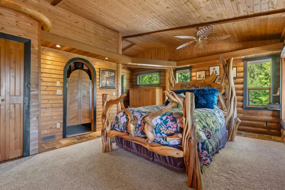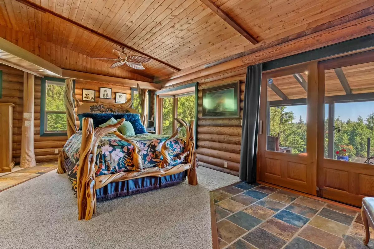 Welcome to your private paradise! This spectacular custom 4,188 sqft log home features 180 degree panoramic views while nestled on a sprawling 5.01 acres. Incredible wood work through out the home. Tons of natural sunlight into games room, kitchen and large living room with vaulted ceilings. Upgraded kitchen with pantry is an entertainers dream with Dacor appliances, an expansive island and a dedicated eating area. Primary bedroom is on the main floor with a walk-in closet and a spacious ensuite bathroom. In the basement, the laundry and 2 bedrooms with a full bathroom await as well as a spacious living room. The property also includes a 2,780 sqft detached heated garage with 3 bay doors with space for RV parking inside w/200amp service. Amazing outdoor lighting throughout the property.