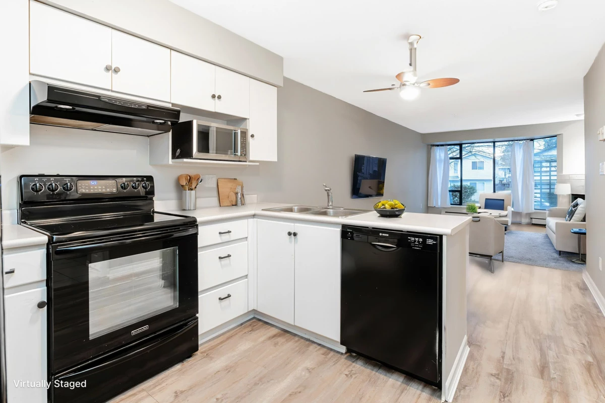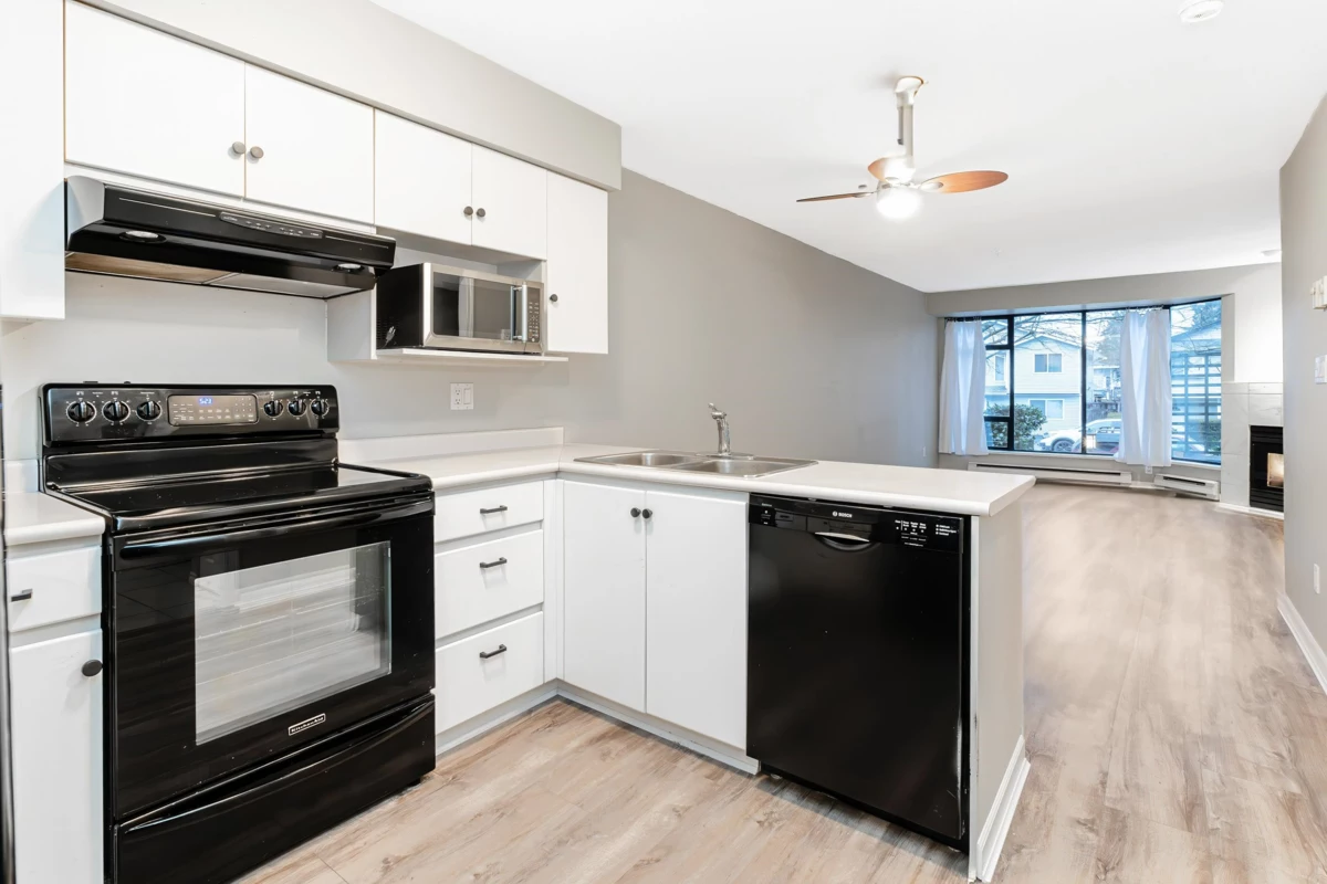 Urban living in this charming large 1 bed + den, 1 bath condo in a prime central location! This home features big floor-to-ceiling windows, filling the space with natural light. The cozy gas fireplace adds warmth to the open living area. The large bedroom connects to a 4-piece bathroom, enjoy cooking in functional kitchen + ample cupboard space. Enjoy the convenience of in-suite storage and large den/flex area. Upgraded high end flooring throughout! Spacious concrete patio, perfect for outdoor relaxation. With a walk-up townhouse feel, you're steps from dining, shopping, recreation, and scenic trails. A perfect blend of comfort and convenience!
