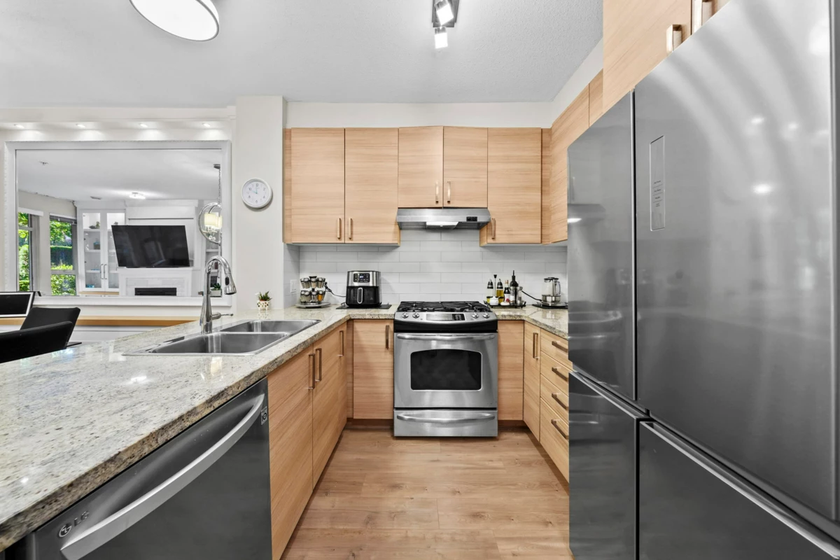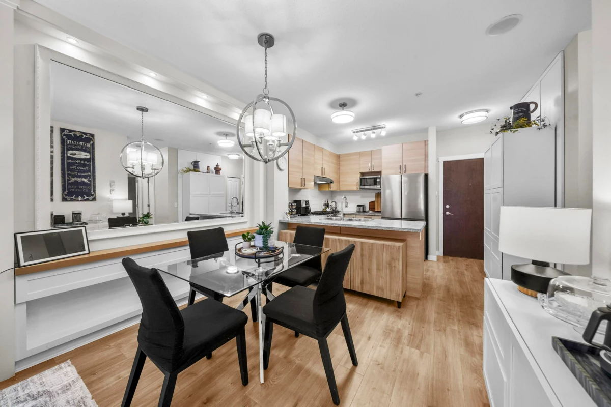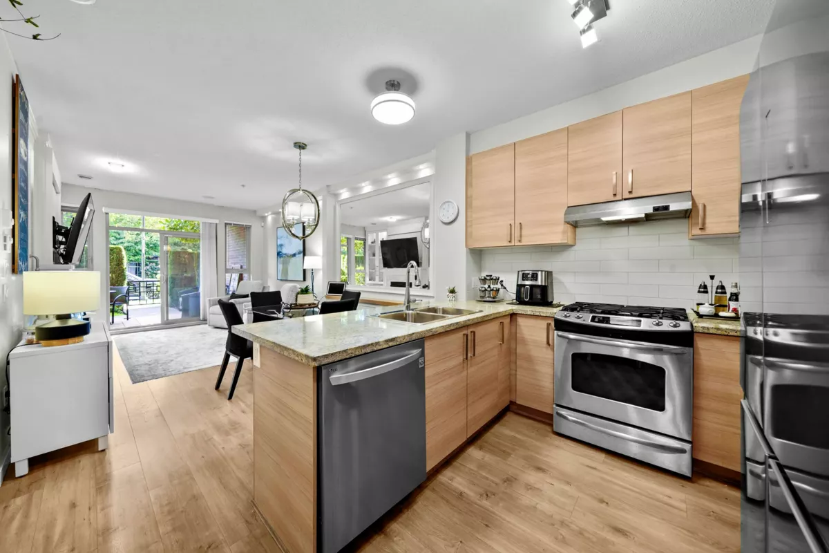 This STUNNING former "Show Home" is MOVE IN READY!! The "Thomas house" built by Polygon is a 2 bed/2 bath ground floor home featuring upgrades throughout: sophisticated built-ins, natural wood highlights, designer wallpaper, large framed mirrors, custom designed headboard featuring built-in side tables with lights, new flooring and more! BONUS: 9' ceiling, gas stove, storage locker, EV charging, LARGE patio w/ fenced yard - perfect for pets/kids! Residents also have access to the private Nakoma Clubhouse, which features over 18,000 sq. ft. of resort-style amenities: basketball/badminton court, outdoor pool, gym, guest suites, & yoga area. Located near trails, school, parks, Skytrain & more. Open house Saturday, November 22nd 2-4pm.