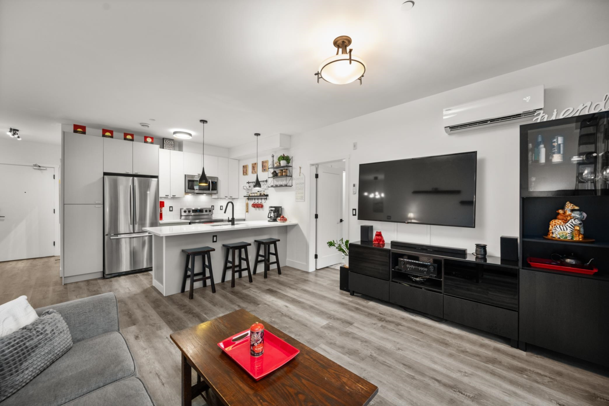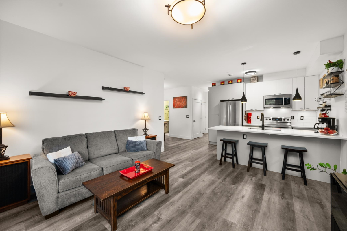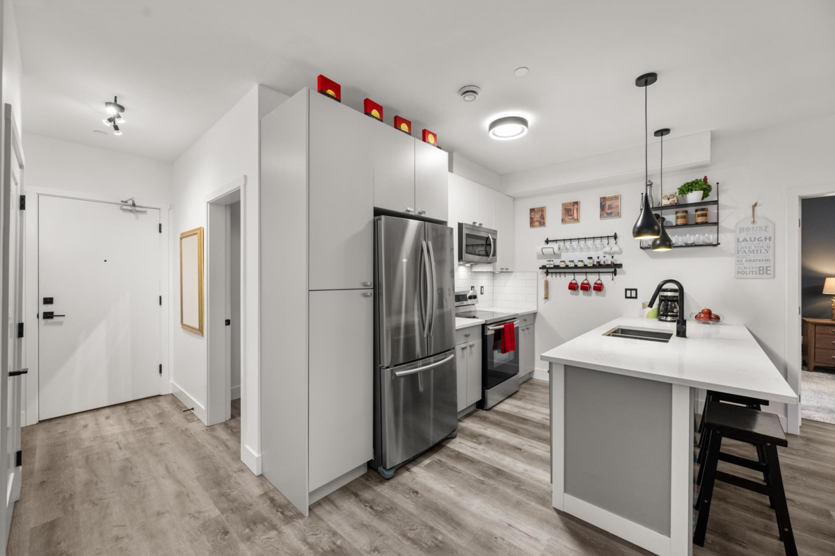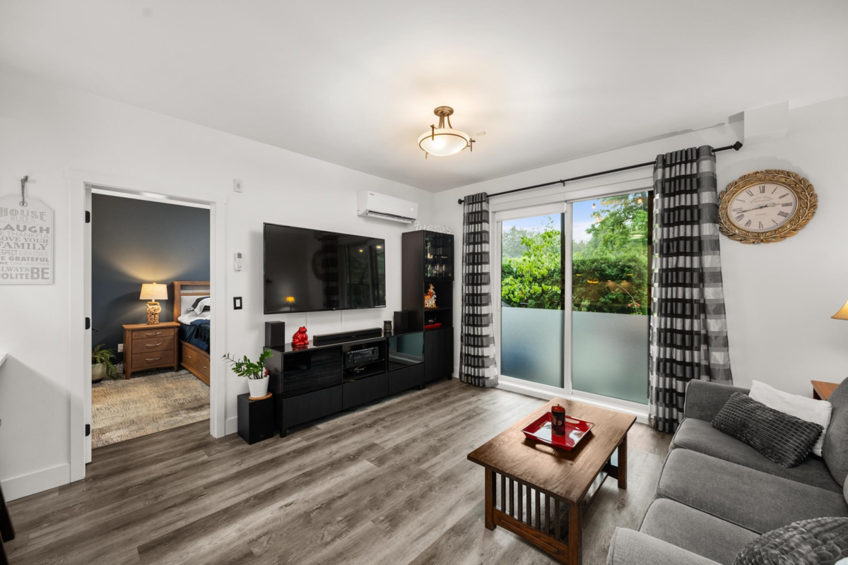 Bright and convenient, ground-floor condo with an oversized patio that feels like your own private retreat! This one-owner, 2-bed/2-bath home with den (perfect for office or pantry) offers a peaceful setting at the end of a no-through road. Enjoy modern comfort with air conditioning/heat pump, quartz countertops, laminate flooring, and stainless steel appliances. The 5-year-young building is located in the heart of Central Maple Ridge — close to shops, parks, and transit. Includes 2 parking stalls, a storage locker, and greenspace at your doorstep. A perfect blend of comfort, convenience, and nature — just move in and enjoy. Pets welcome!