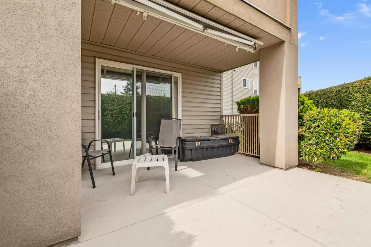 This 55+ 2 bed, 2 bath ground-floor unit features a well-designed layout with level entry. South facing unit, set back from busy Yale Road, offers a quiet and peaceful atmosphere, complemented by an extra-large, private, covered patio. Plenty of updates including flooring, paint throughout, concrete patio, appliances, automatic Valor fireplace, included portable AC, light fixtures, faucets, sinks & countertops. Windows have a UV protection/privacy film for added privacy and comfort. Well-managed building, residents benefit from secure underground parking (extra stalls may be available), a storage locker, and guest suite. The monthly strata fee includes natural gas, sewer, and water. Conveniently situated just 5 mins from Hwy 1 and 3 mins from groceries, shopping, and District 1881!