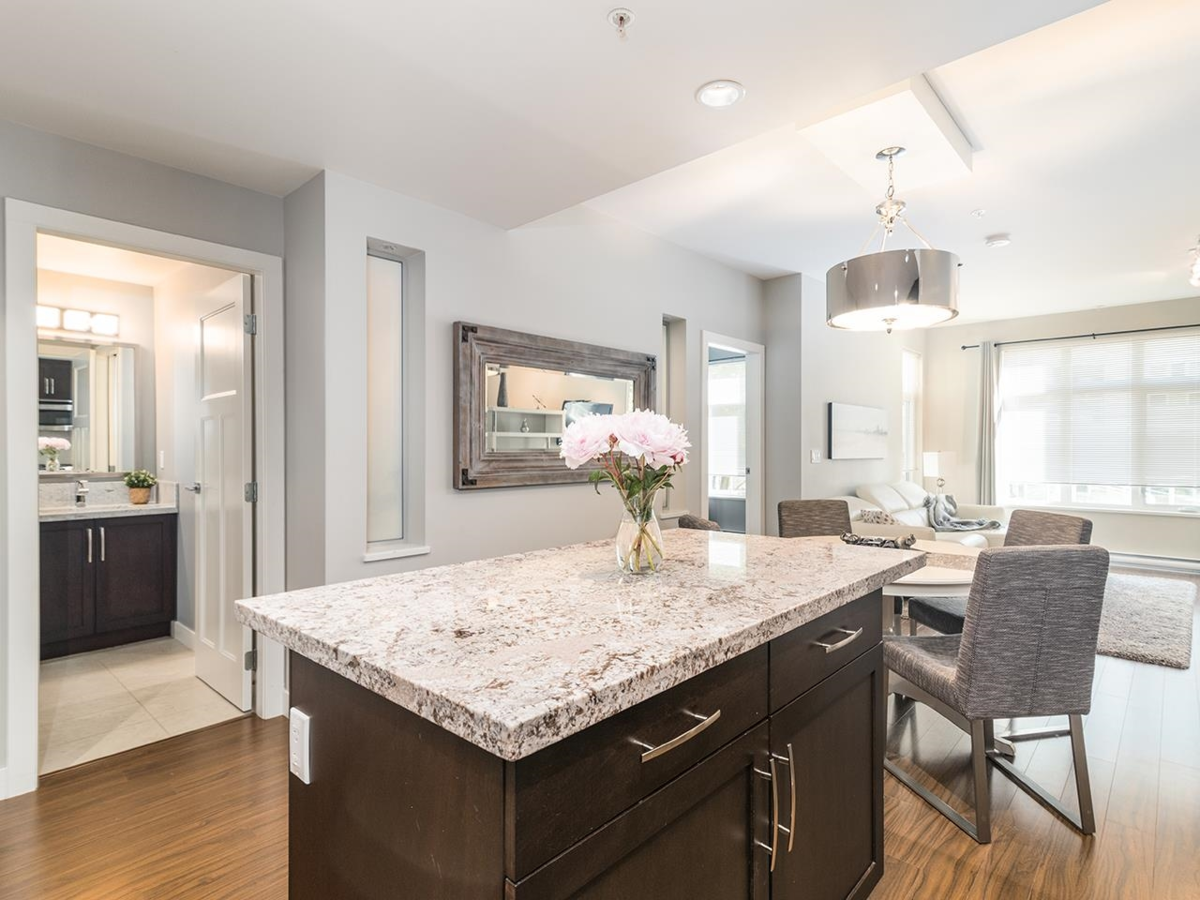 This Elegant 2bd 2 bath unit tucked in a tranquil location of Grandview Heights & offering a beautiful private oasis. The open concept design offers lots of natural light, marble & granite island, tons of storage, SS appliances, gas stove. With a warm inviting colour palate, undercounter lighting this inviting unit needs to be seen. You will love the private walk out covered patio to enjoy the morning sun. Bonus office & huge amenity room to rent, Bike room, Fitness room, storage & 1 UG parking with lots of visitor parking. Centrally located near shopping, restaurants, transit, commuter routes and the perfect place to call home. Furniture can be included. Put this one on your list. Come take a look