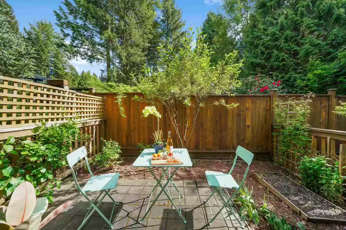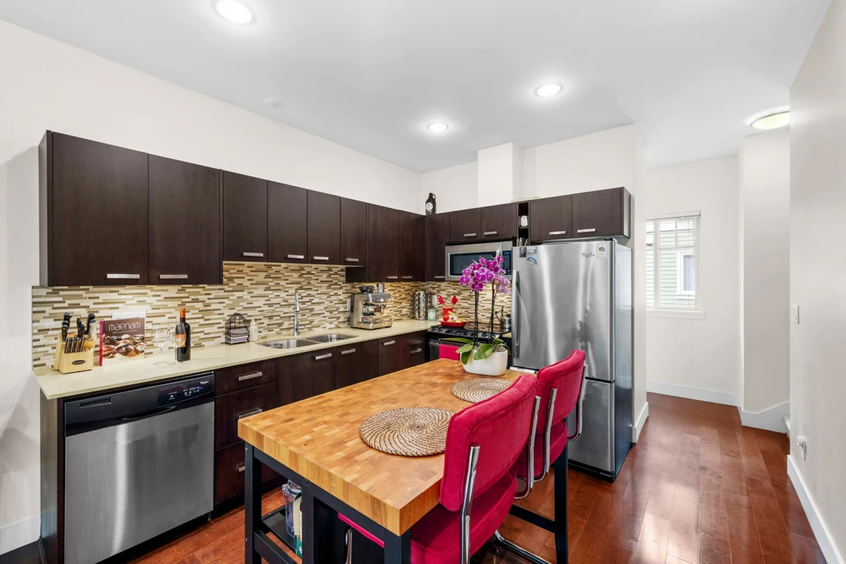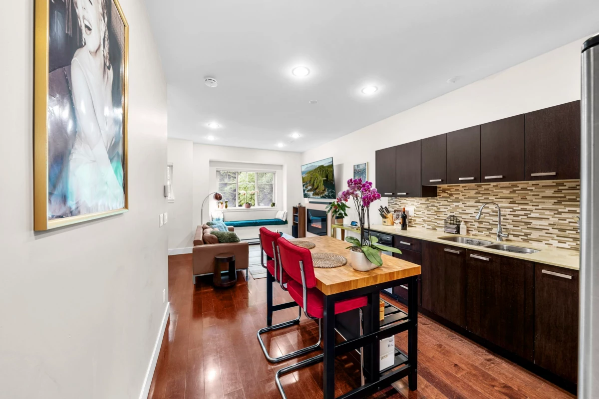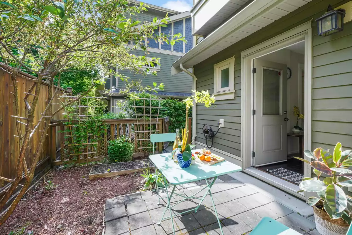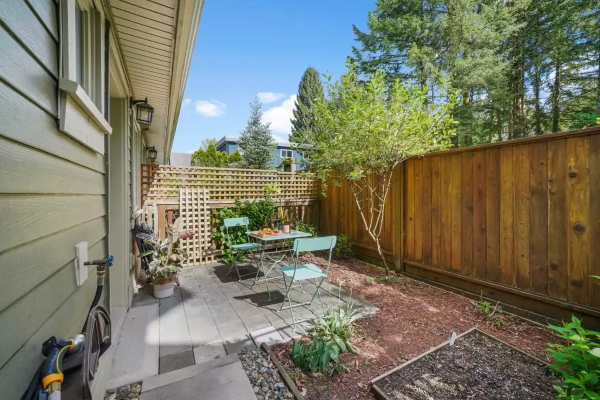 This rare end-unit townhome offers unmatched privacy on the quiet side of the complex. Enjoy a private garage, a separate garden-level entrance to a bedroom with ensuite and patio — ideal for guests, in-laws, or a home office.The main floor features an inviting bay window, electric fireplace, engineered h/w & an open-concept kitchen with granite counters, stainless steel appliances, and a convenient powder room. Upstairs, two spacious bedrooms (including a bay-windowed primary with double closets) offer peace & quiet being a corner end unit. Walk to Rocky Point, Brewers Row, SkyTrain, West Coast Express, schools, shops, and more. Perfect for families, professionals, or investors — just add your personal touch to MAKE IT YOUR HOME!