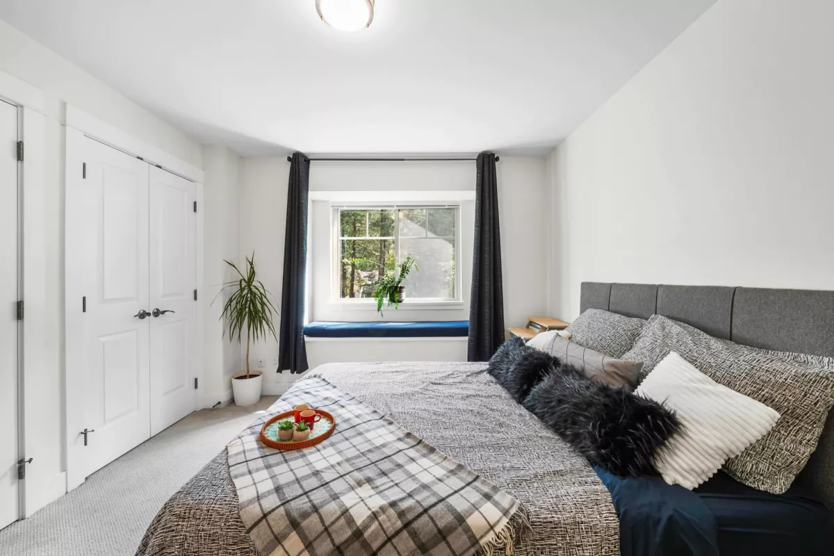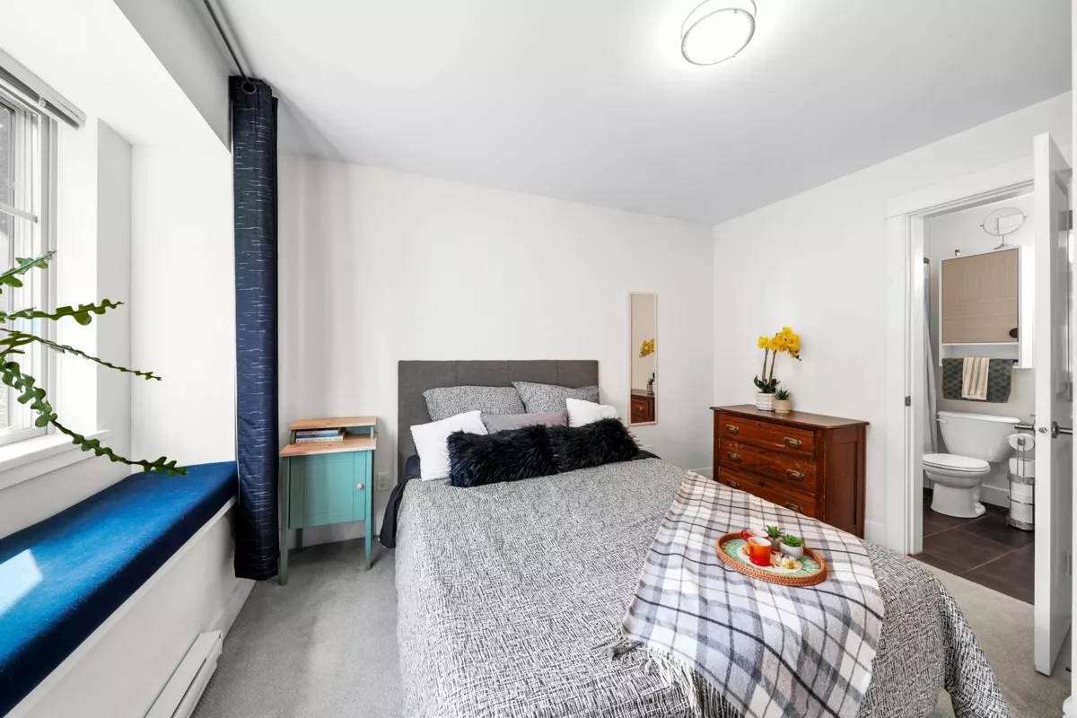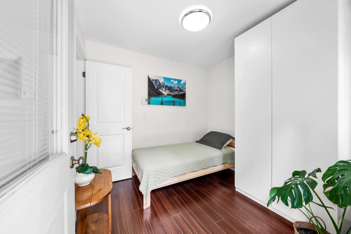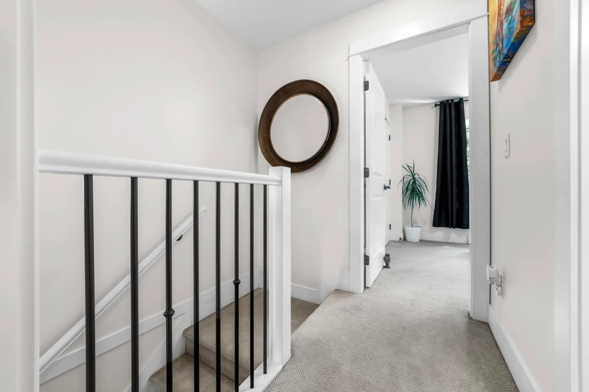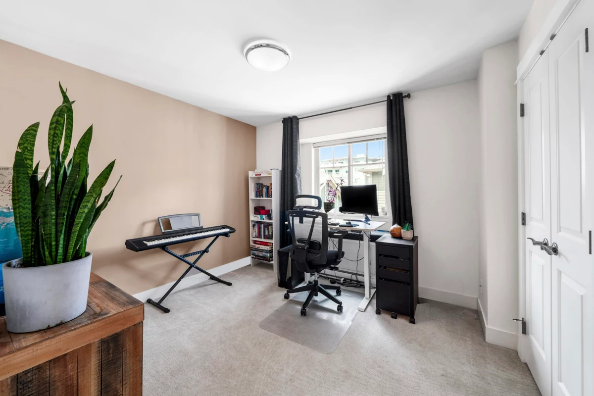 This rare end-unit townhome offers unmatched privacy on the quiet side of the complex. Enjoy a private garage, a separate garden-level entrance to a bedroom with ensuite and patio — ideal for guests, in-laws, or a home office.The main floor features an inviting bay window, electric fireplace, engineered h/w & an open-concept kitchen with granite counters, stainless steel appliances, and a convenient powder room. Upstairs, two spacious bedrooms (including a bay-windowed primary with double closets) offer peace & quiet being a corner end unit. Walk to Rocky Point, Brewers Row, SkyTrain, West Coast Express, schools, shops, and more. Perfect for families, professionals, or investors — just add your personal touch to MAKE IT YOUR HOME!