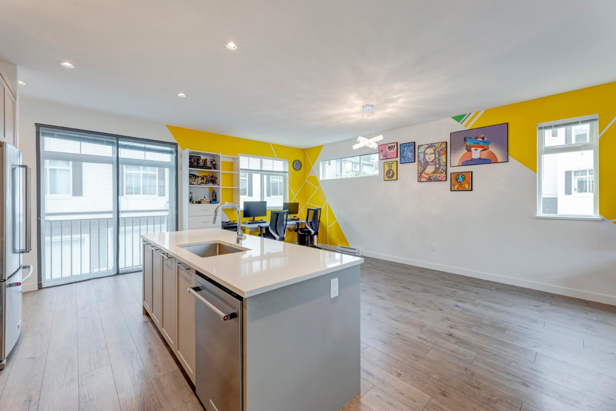 Rocklin on the Creek by Woodbridge Homes. This spacious 1,452sqft CORNER UNIT features open, bright and airy living/dining space with a south-facing patio overlooking kids play area and a bonus Juliet balcony with sliding door for max fresh air flow. Chef's kitchen has huge kitchen island, quartz countertops, and S/S appliances. Master bedroom boasts vaulted ceiling, bright WIC with organizers and 4pcs ensuite w/double sinks and frameless glass shower. Custom paint throughout this sweet home. Generous side-by-side double garage with a window offers plentiful storage space and a back door leading to a cute fenced backyard. Short walk to Victoria Park, Leigh Elementary, Leigh Park (a dog & bike park) and future Burke Mountain community centre.