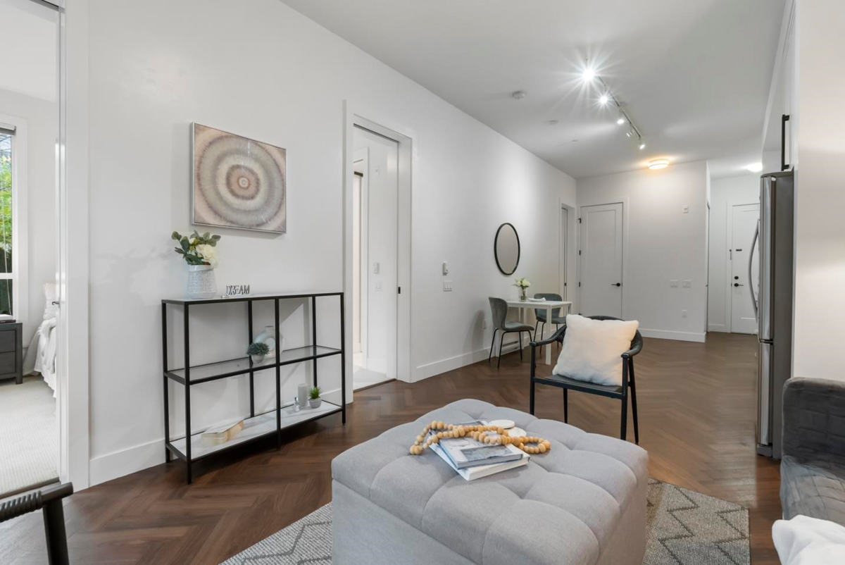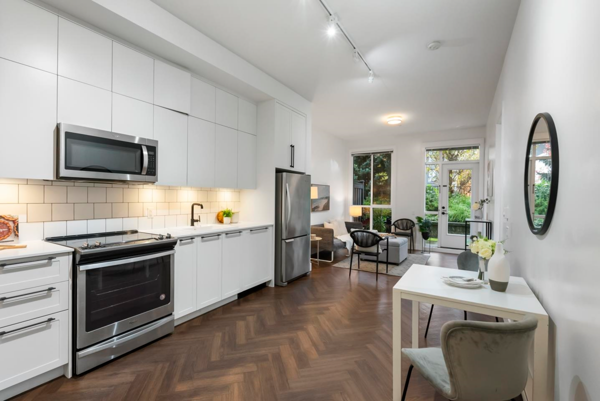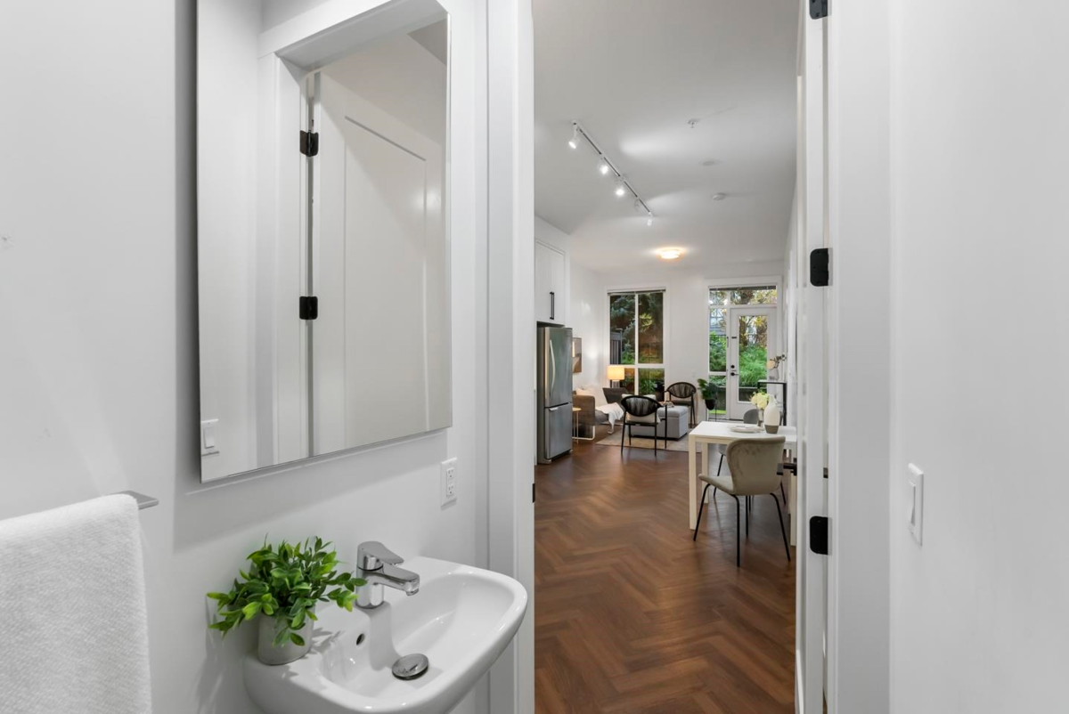 A rare blend of condo living with your very own private yard. Welcoming you into this bright and inviting ground-floor home in the popular Guildhouse community by Mosaic. This 2-bedroom, 1.5-bath suite offers 807 sq.ft. of thoughtfully designed living space with 10 ft ceilings and a spacious private yard—perfect for morning coffee or quiet evenings outdoors. Inside, you’ll find modern finishes throughout, from stylish flooring and tile work to sleek kitchen cabinetry. The open layout feels fresh and comfortable, ideal for everyday living or entertaining. Located just steps from Guildford Town Centre, parks, and transit, this home combines convenience, comfort, and contemporary style in one of Surrey’s most walkable neighbourhoods.