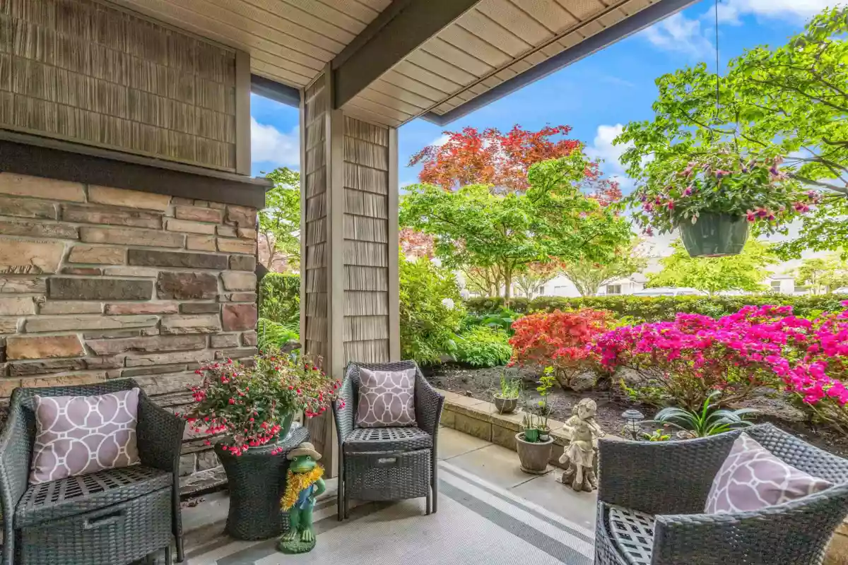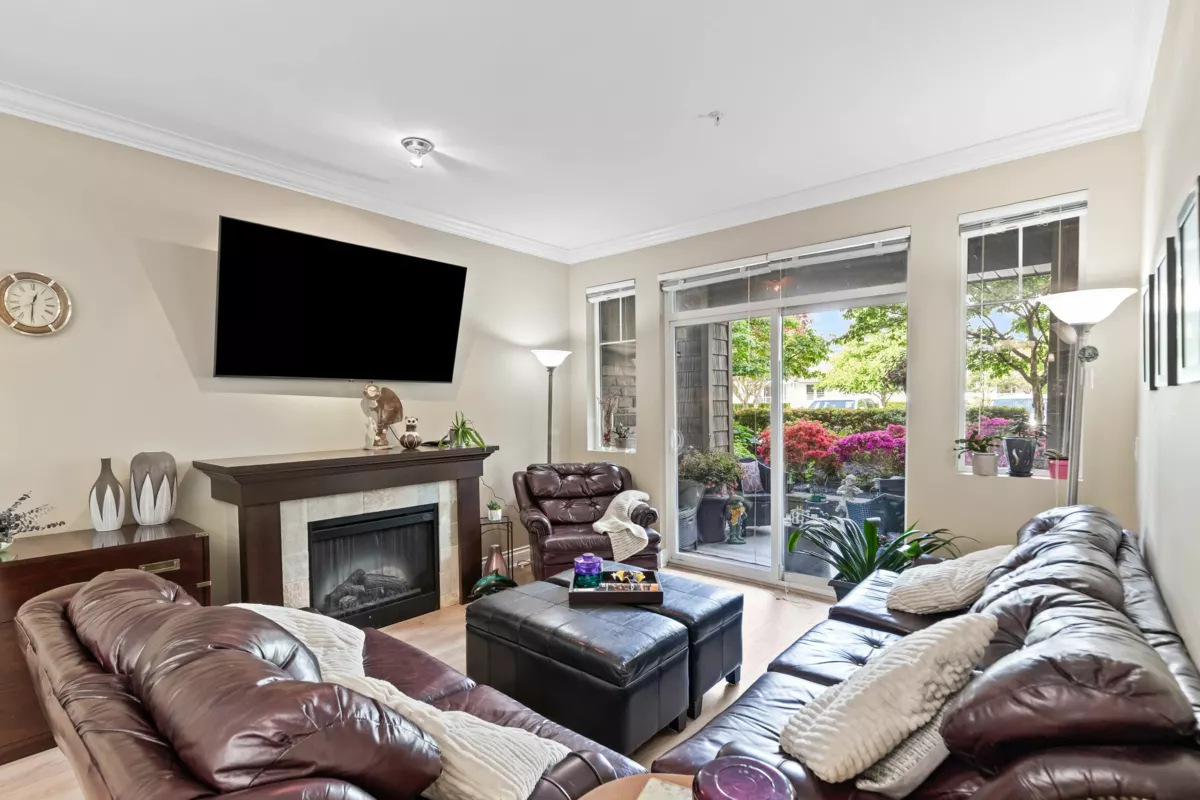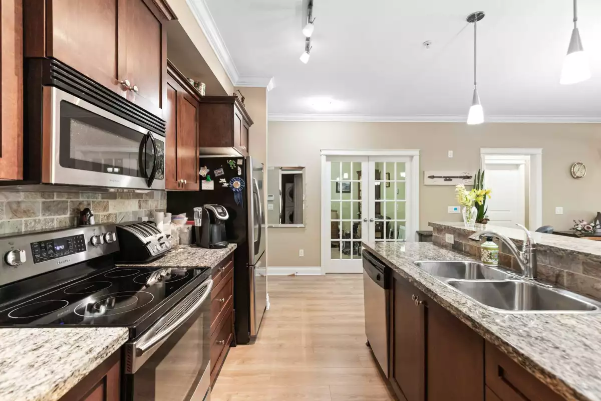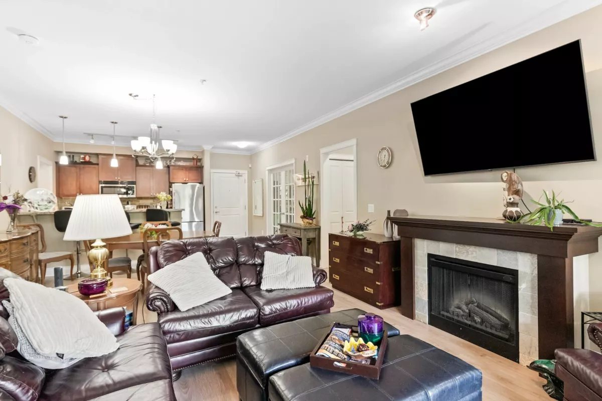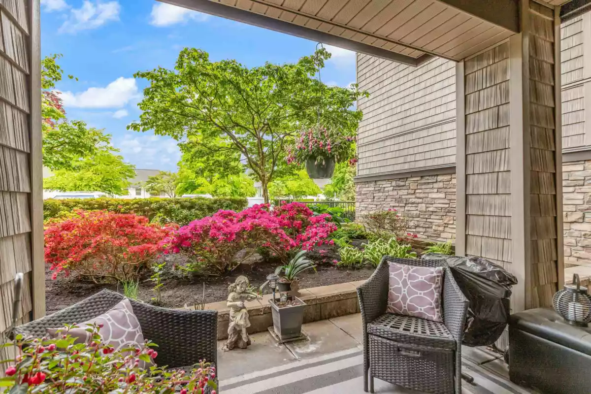 Your chance to own in the highly desired STONEGATE complex! This beautiful ground-floor unit offers a bright, open-concept layout with 2 spacious bedrooms, 2 full bathrooms & a den, perfect for home office or guest space. The kitchen features SS appliances, maple cabinetry, granite countertops & dedicated laundry room with extra storage/pantry space. The large dining area is ideal for entertaining. Relax in the cozy living room with an electric fireplace & walk out to the covered patio to enjoy the beautiful lush landscaping. Features engineered hardwood floors, a generous primary bedroom suite including a deluxe ensuite with a separate shower and soaker tub, as well as a spacious walk-in closet. Bedrooms on opposite sides for privacy. Walking distance to shopping, transit & schools.