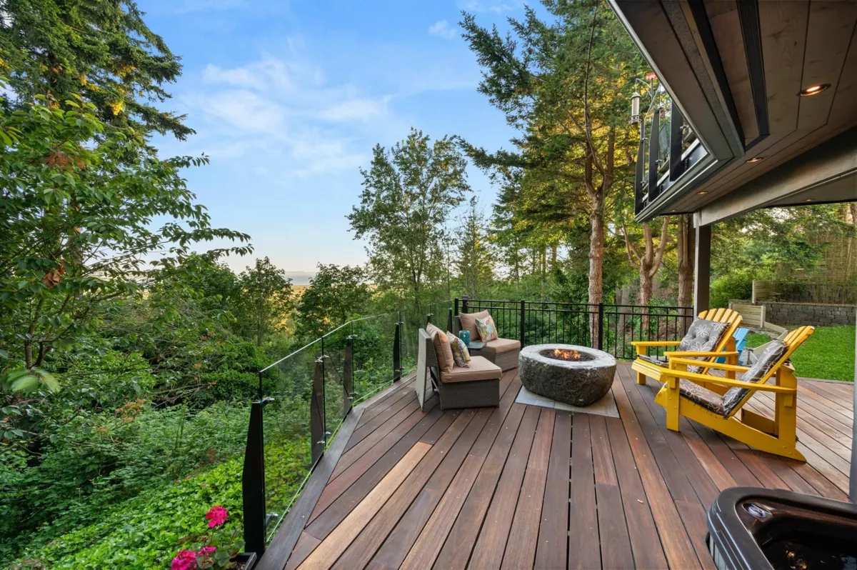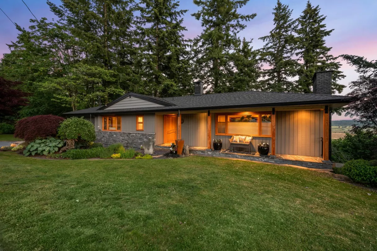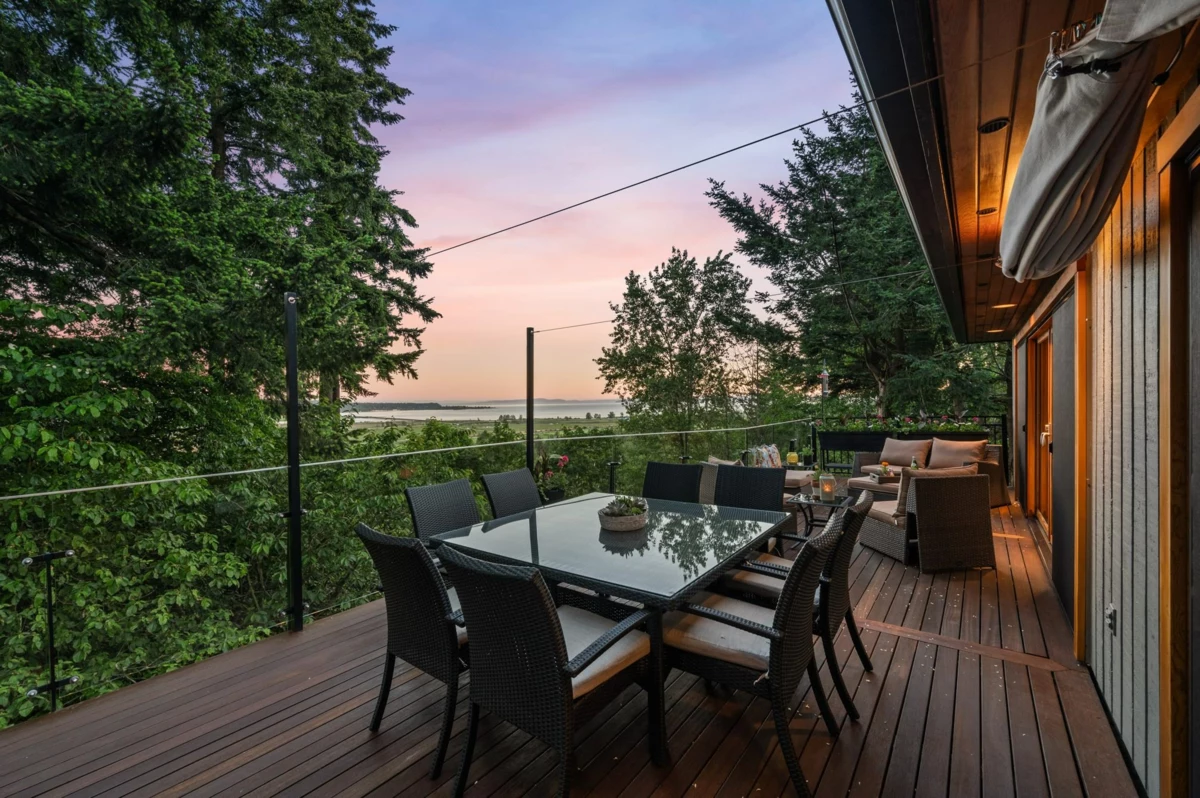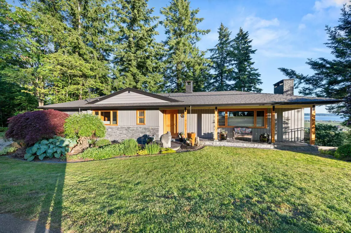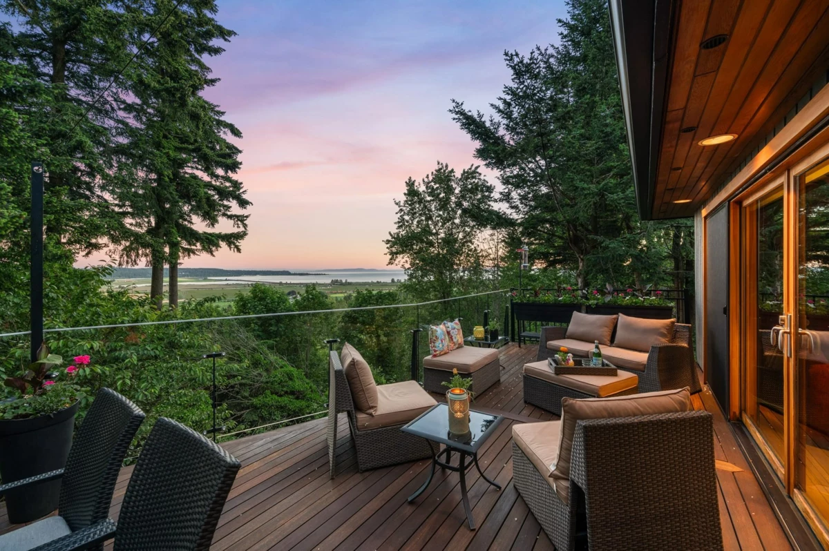 PANORAMA RIDGE OASIS! Discover this exclusive, 3-bdrm executive or retirement sanctuary. Enjoy unparalleled privacy with panoramic ocean & farmland views. Two tiers of spacious decks feature a firepit & hot tub, ideal for unwinding with a glass of wine as you watch the stunning sunsets & nature. Renovated with natural elements, the home offers a seamless indoor-outdoor flow. The primary suite boasts a spa-inspired ensuite & a spacious walk-in dressing room. Boasting artistic landscaping with rain chains leading into planter pots, thoughtfully designed pathways, and multiple decks that maximize the use of space. Top appliances, low-maintenance yard & easy access to commuter routes, this secluded haven is the perfect blend of luxury & convenience. Experience a holiday retreat every day!