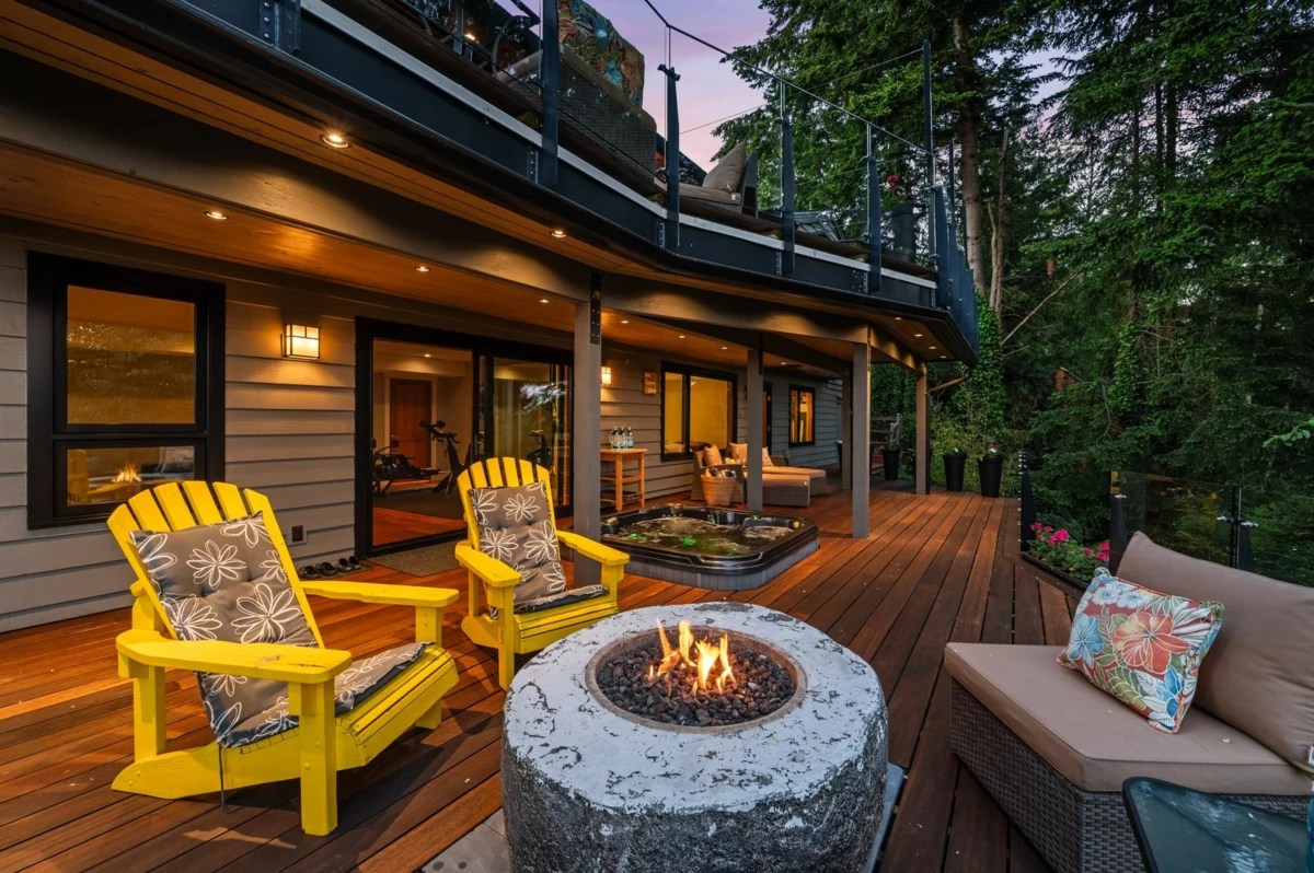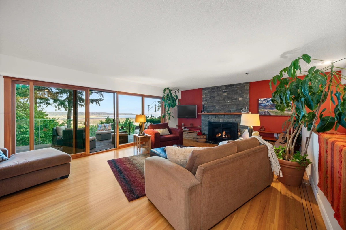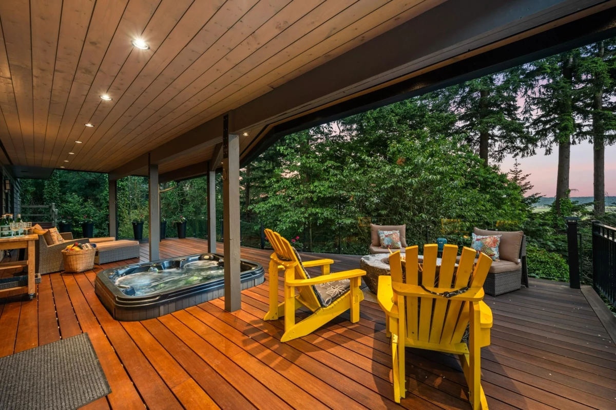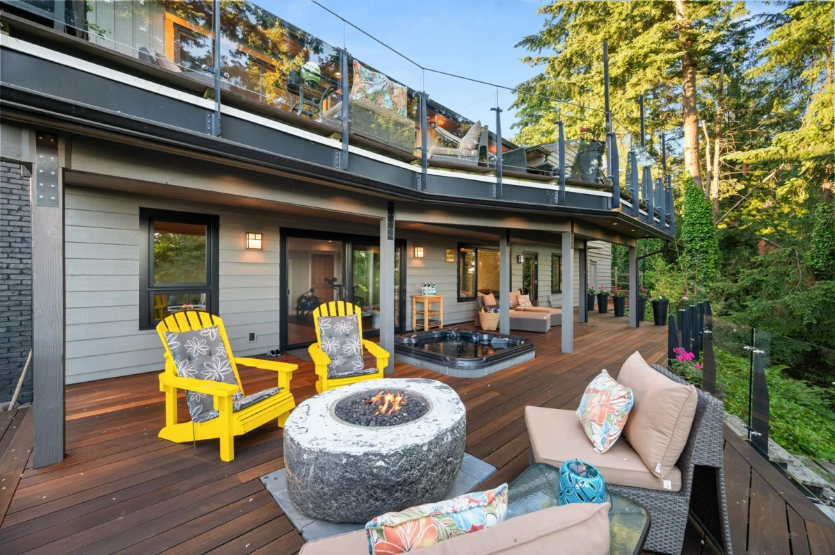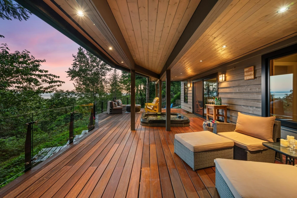 PANORAMA RIDGE OASIS! Discover this exclusive, 3-bdrm executive or retirement sanctuary. Enjoy unparalleled privacy with panoramic ocean & farmland views. Two tiers of spacious decks feature a firepit & hot tub, ideal for unwinding with a glass of wine as you watch the stunning sunsets & nature. Renovated with natural elements, the home offers a seamless indoor-outdoor flow. The primary suite boasts a spa-inspired ensuite & a spacious walk-in dressing room. Boasting artistic landscaping with rain chains leading into planter pots, thoughtfully designed pathways, and multiple decks that maximize the use of space. Top appliances, low-maintenance yard & easy access to commuter routes, this secluded haven is the perfect blend of luxury & convenience. Experience a holiday retreat every day!