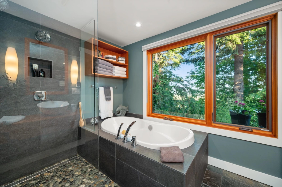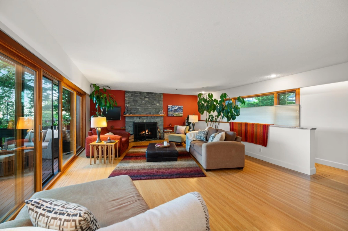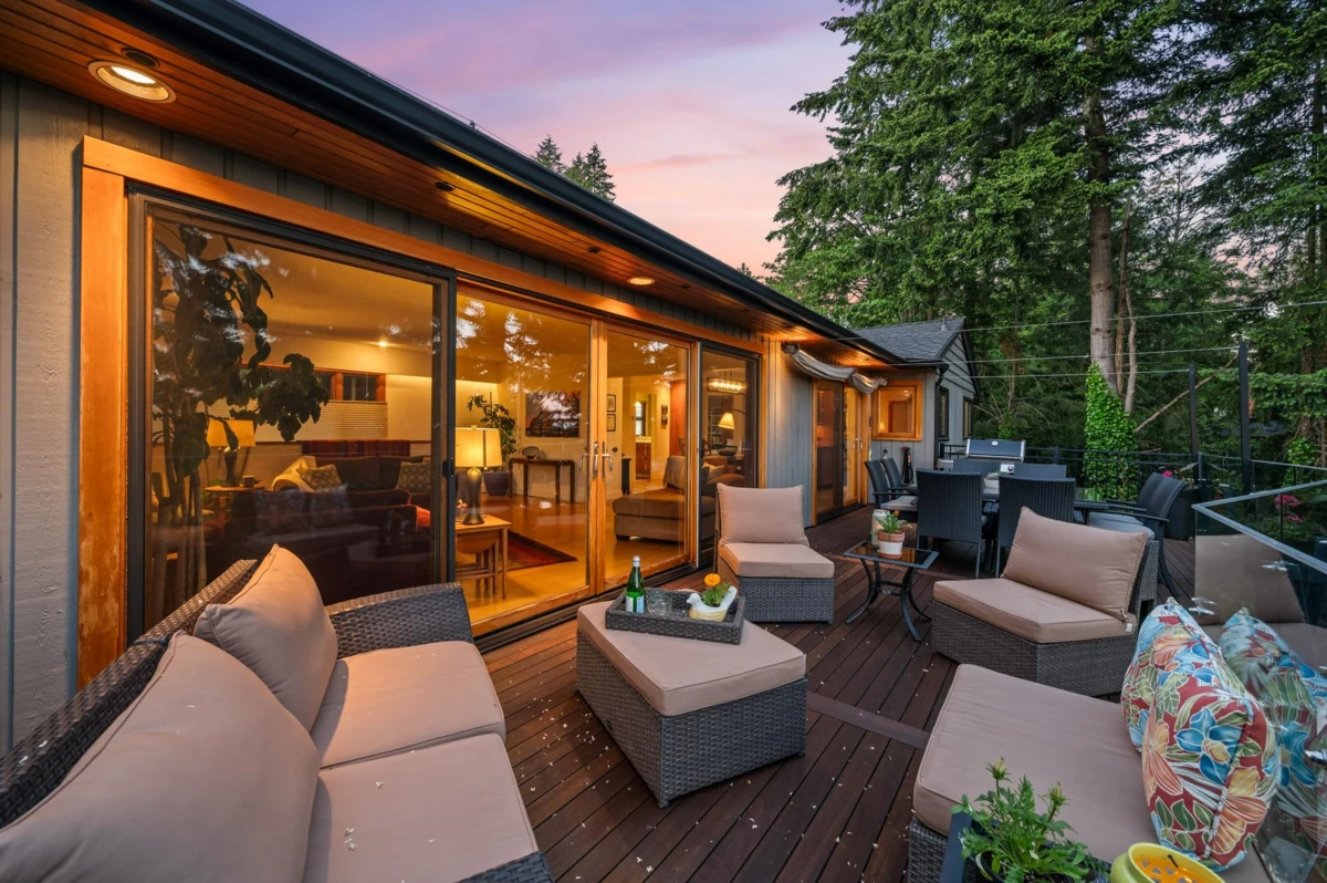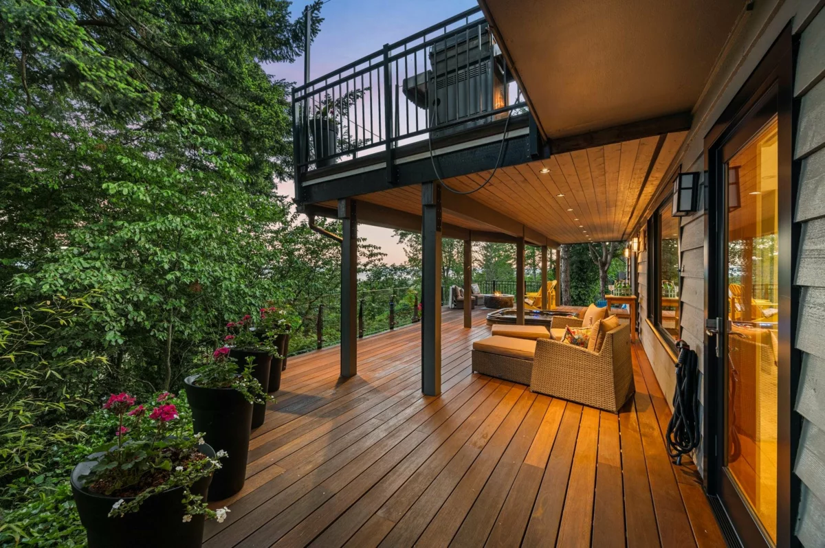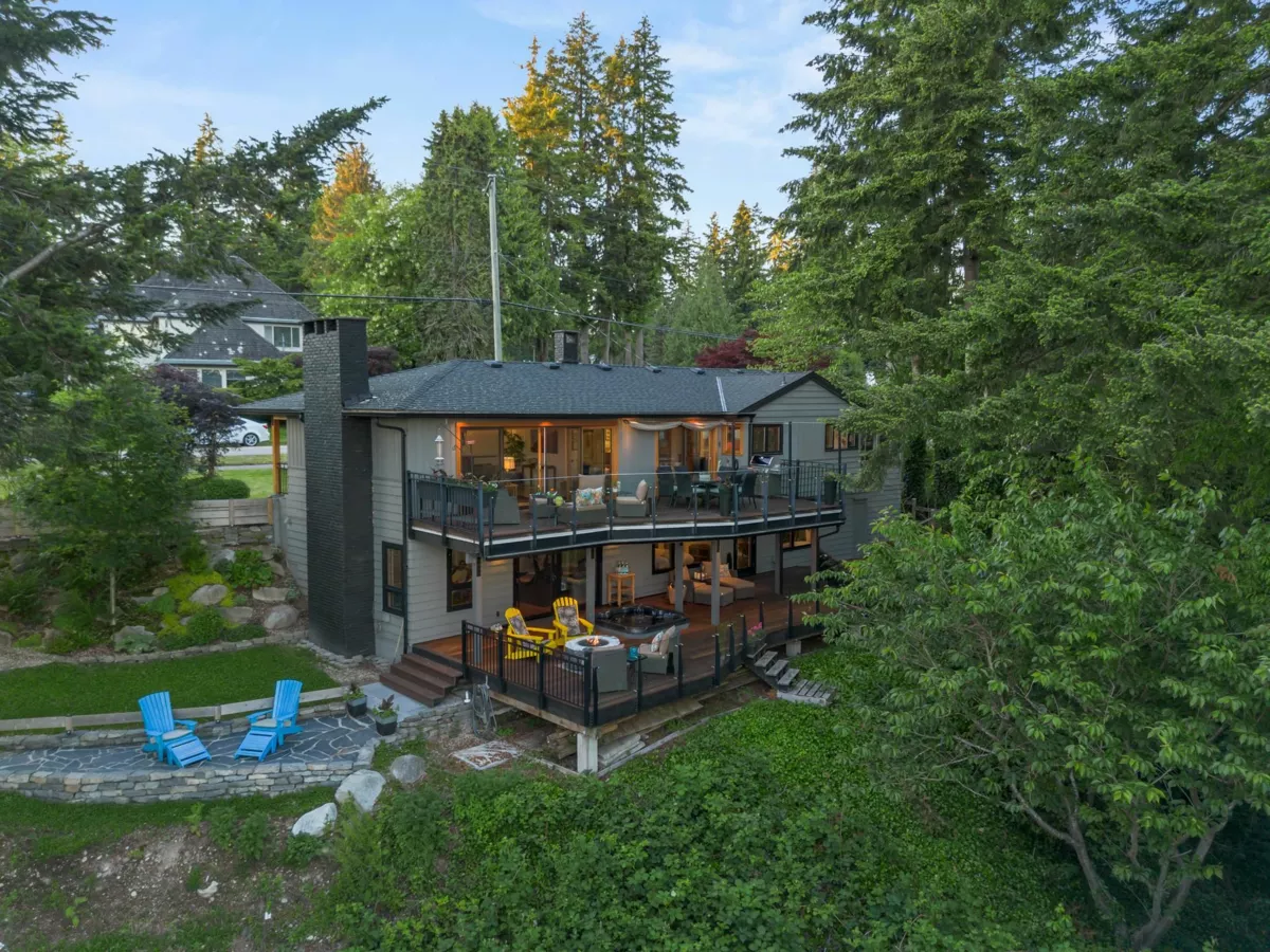PANORAMA RIDGE OASIS! Discover this exclusive, 3-bdrm executive or retirement sanctuary. Enjoy unparalleled privacy with panoramic ocean & farmland views. Two tiers of spacious decks feature a firepit & hot tub, ideal for unwinding with a glass of wine as you watch the stunning sunsets & nature. Renovated with natural elements, the home offers a seamless indoor-outdoor flow. The primary suite boasts a spa-inspired ensuite & a spacious walk-in dressing room. Boasting artistic landscaping with rain chains leading into planter pots, thoughtfully designed pathways, and multiple decks that maximize the use of space. Top appliances, low-maintenance yard & easy access to commuter routes, this secluded haven is the perfect blend of luxury & convenience. Experience a holiday retreat every day!
