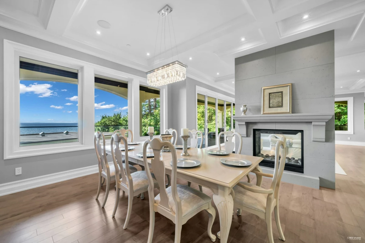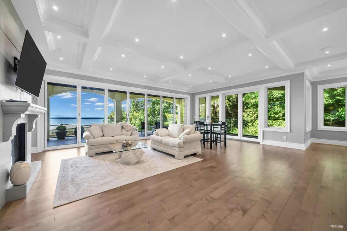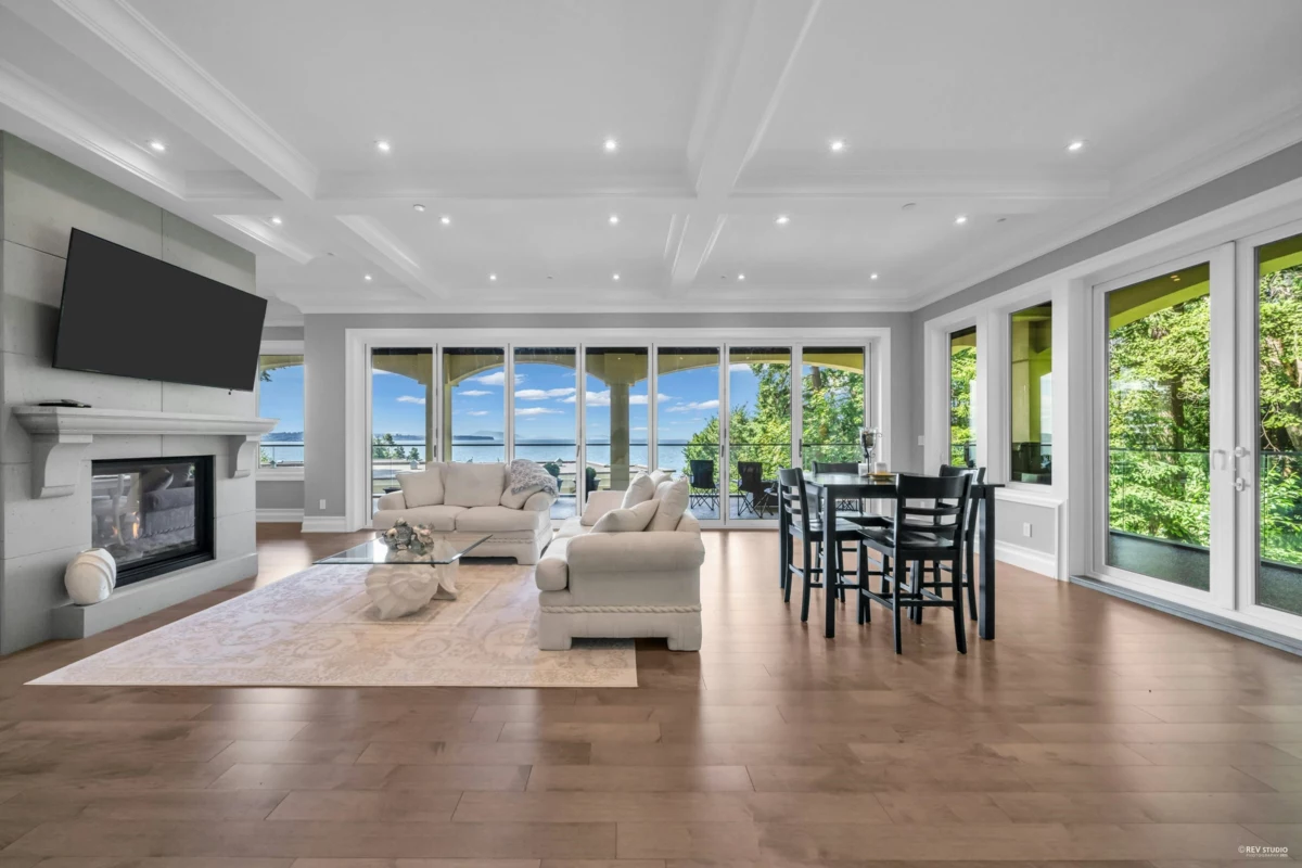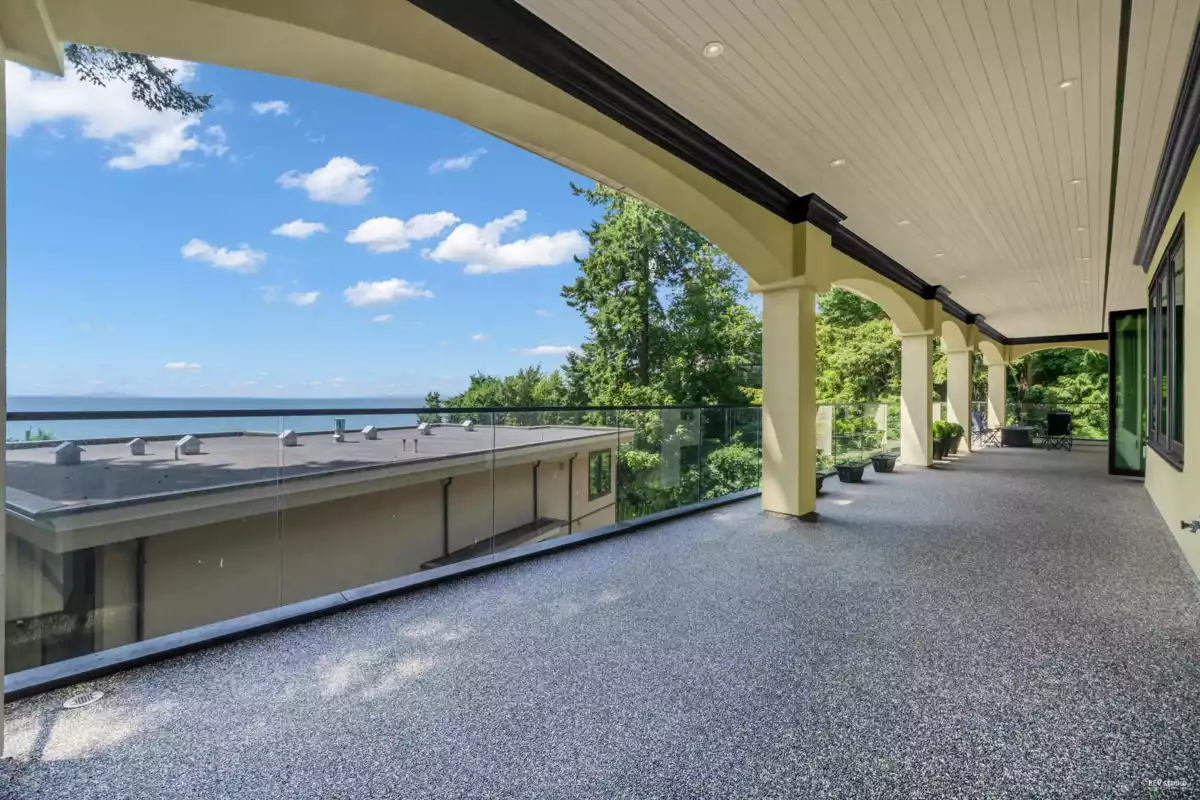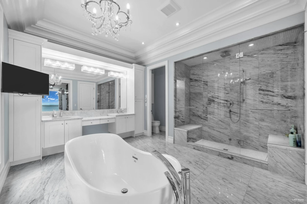 Must sell! Unobstructed panoramic ocean view. Pristine 5,734 sf executive home by renowned Ronco Construction on a S-facing 9,350 sf lot with 132.4' frontage, surrounded by mature trees and trail to Centennial Park. Main floor features open living/dining, Thermador gourmet kitchen, office/4th ensuite bdrm, and 1,080 sf wrap-around covered balcony plus 200+ sf private patio with built-in trellis—perfect for entertaining. Lower floor offers 4 spacious ensuite bdrms and 978 sf covered balcony. Luxurious primary ensuite with soaker tub, crystal chandelier, steam shower, marble finishes. Basement includes home theatre, 2-bdrm legal suite, wine cellar, and 5-car garage. 10' ceilings, Viessmann radiant heating, HRV, flood-warning system, elevator, cedar soffits, man-made stream, electric gate.