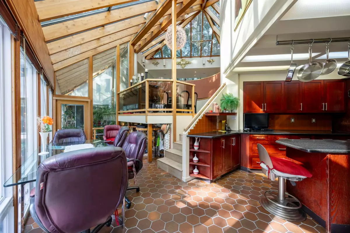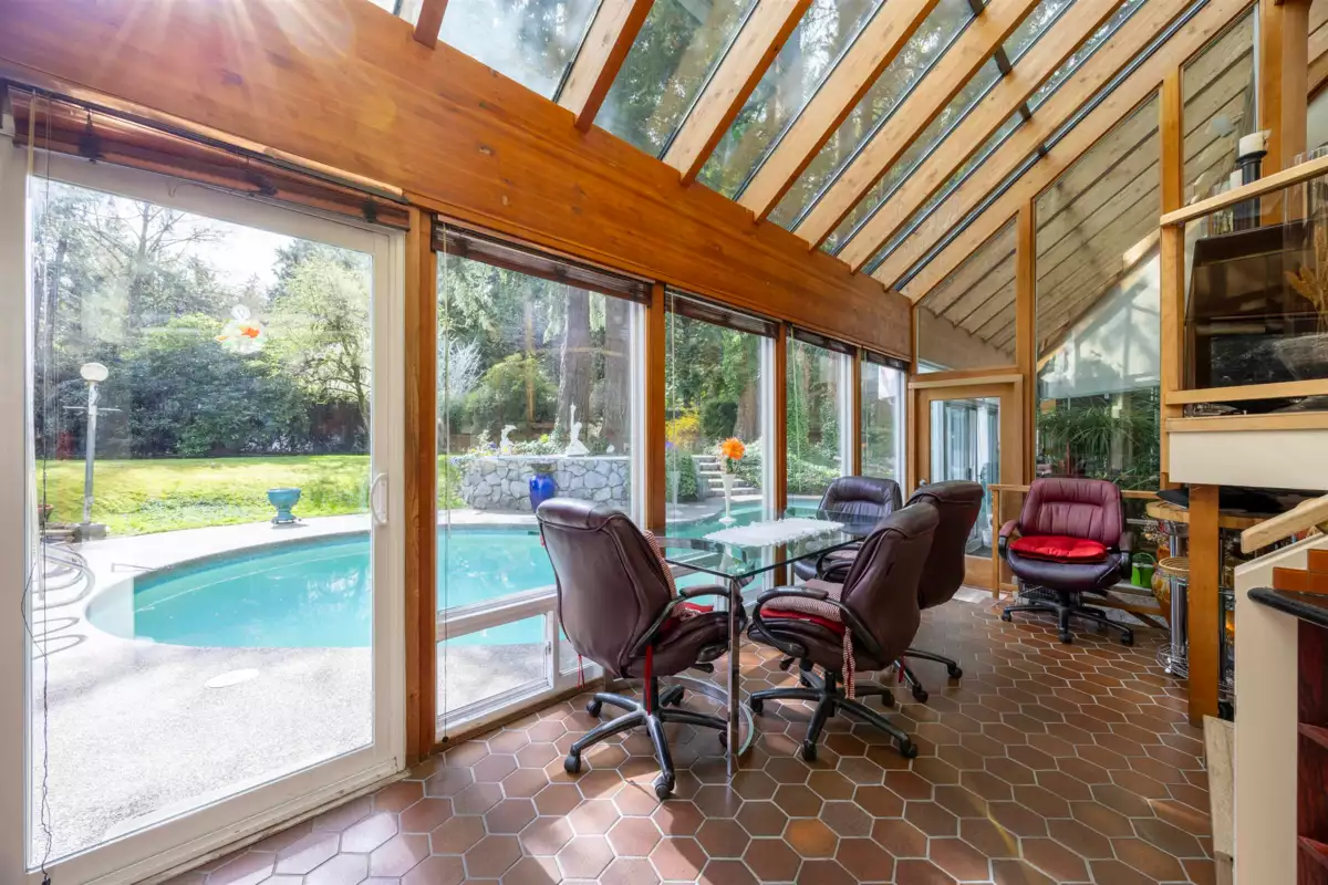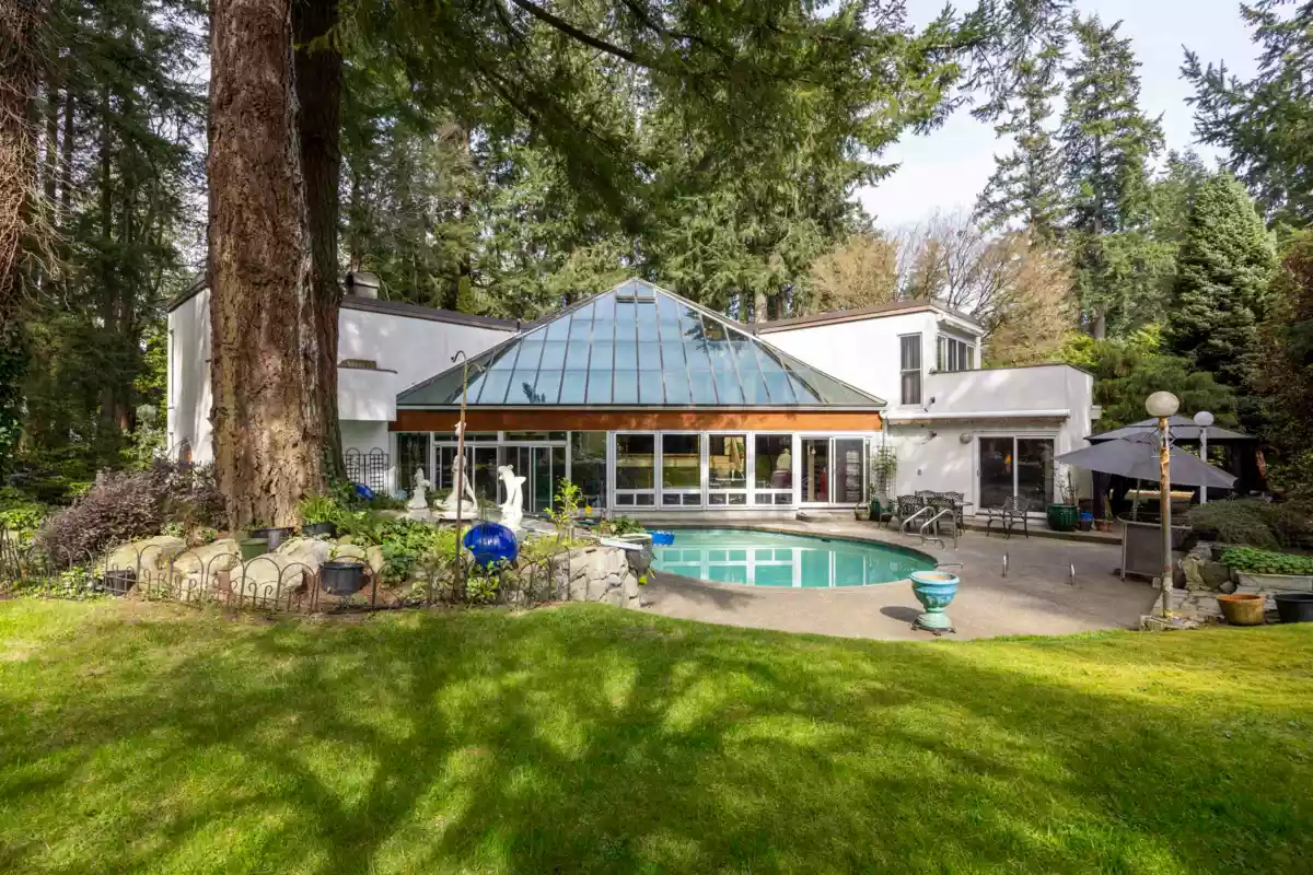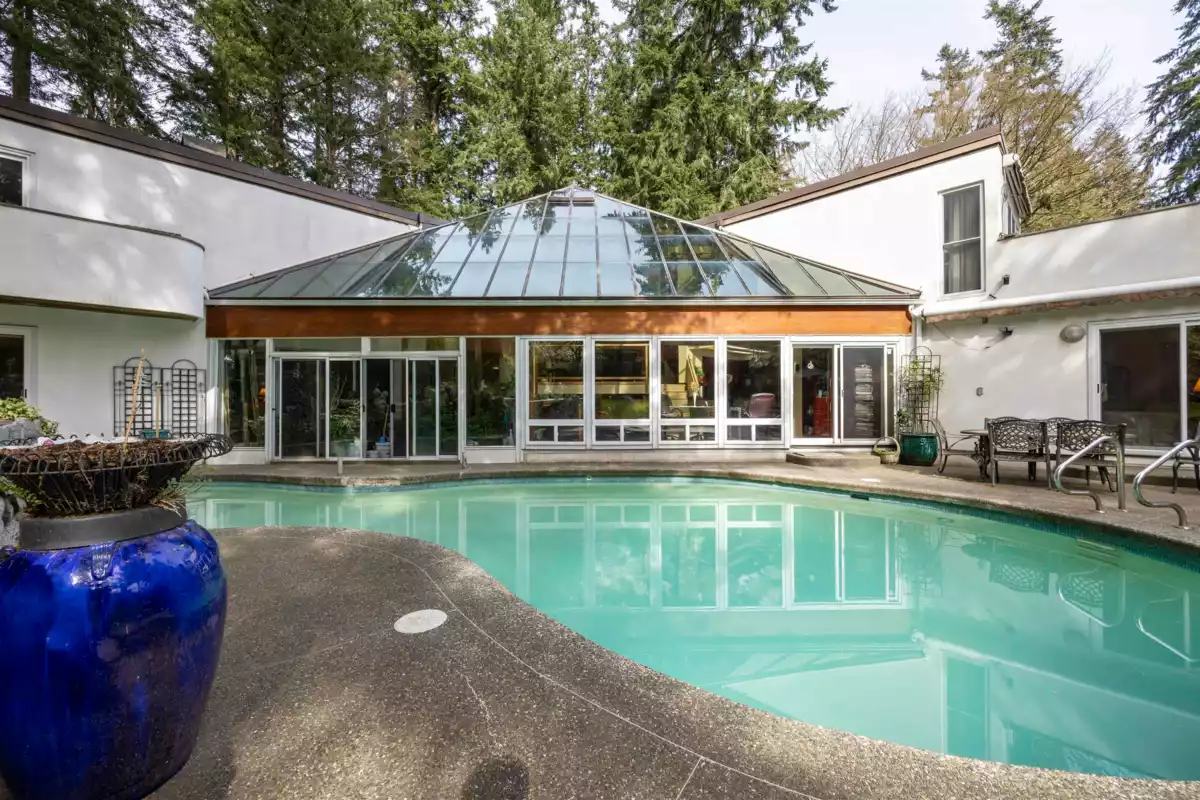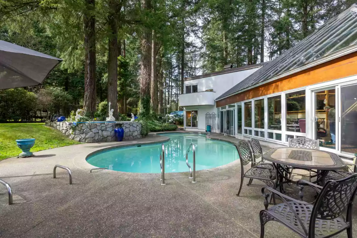Located in the Elgin Chantrell area of South Surrey, this unique property on 1.05 acres is truly a stunning living space. With a generous 4035 square feet of living area, the design is thoughtfully crafted, blending modern aesthetics with natural harmony. The interior is spacious and bright, featuring a dual-sided wood-burning fireplace that adds warmth and creates a cozy atmosphere throughout the home. One of the highlights of this residence is its impressive amenities, including a luxurious swimming pool, sauna, and a hot tub, providing the perfect environment for relaxation. Additionally, the outdoor garden and indoor garden greenhouse add to the property's charm, with lush greenery offering a serene escape that feels like a peaceful retreat. The land is situated in a rare and desirable