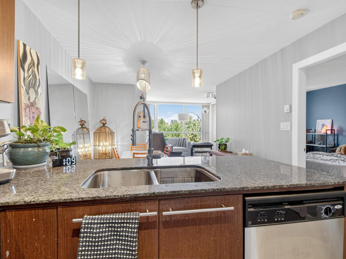 AMAZING, PANORAMIC, mountain views facing the QUIET side that doesn't face a hundred buildings in a QUALITY build by Ledingham McAllister! This PERFECTLY laid out one bedroom and good sized den is a HOME to be PROUD of in a location that's second to none and a TOP spot in the lower mainland! Everything anyone could want is at your doorstep including the skytrain! AWESOME sought after extra's like a gas cooktop, stone counters throughout, electric fireplace for AMBIANCE and laminate floors! One parking and locker, EXCELLENT pro active strata, PHENOMENAL amenities and one dog or two cats allowed! EXCELLENT first timer or downsizer place to call HOME!