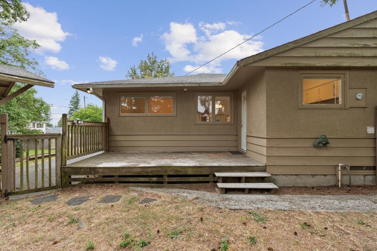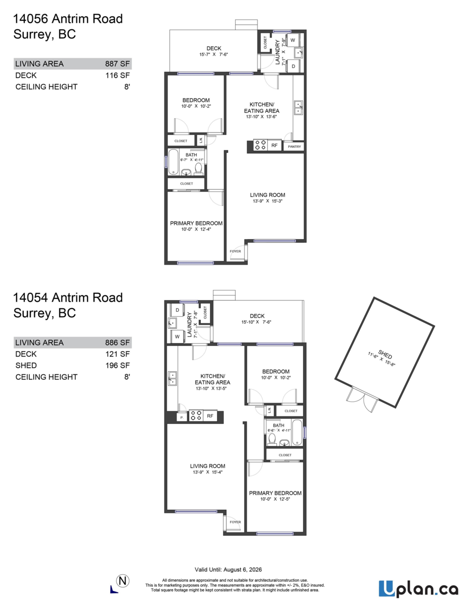 2 UNITS FOR SALE! 14054 and 14056 Antrim Rd! Side-by-side DUPLEX on a massive 12,000+ corner lot with lane access, in the R2 Quarter Acre Residential Zone – allowing the new owner to build up to 4 units on this lot. OR this is a unique opportunity to live in one side and rent out the other side or buy with family/friends and enjoy being neighbors. Both units are 2 bed, 1 bath, nearly 900 sq ft, each w/ insuite laundry, spacious kitchens, hardwood floors, fenced backyards, huge side yards. 70+ ft driveway provides plenty of parking plus 15'8" x 11'6" storage shed. Excellent location - walk to James Ardiel Elementary, quick access to Hwy 17, King George Blvd & Pattullo Bridge. The city has given permission to remove the two front yard trees.
