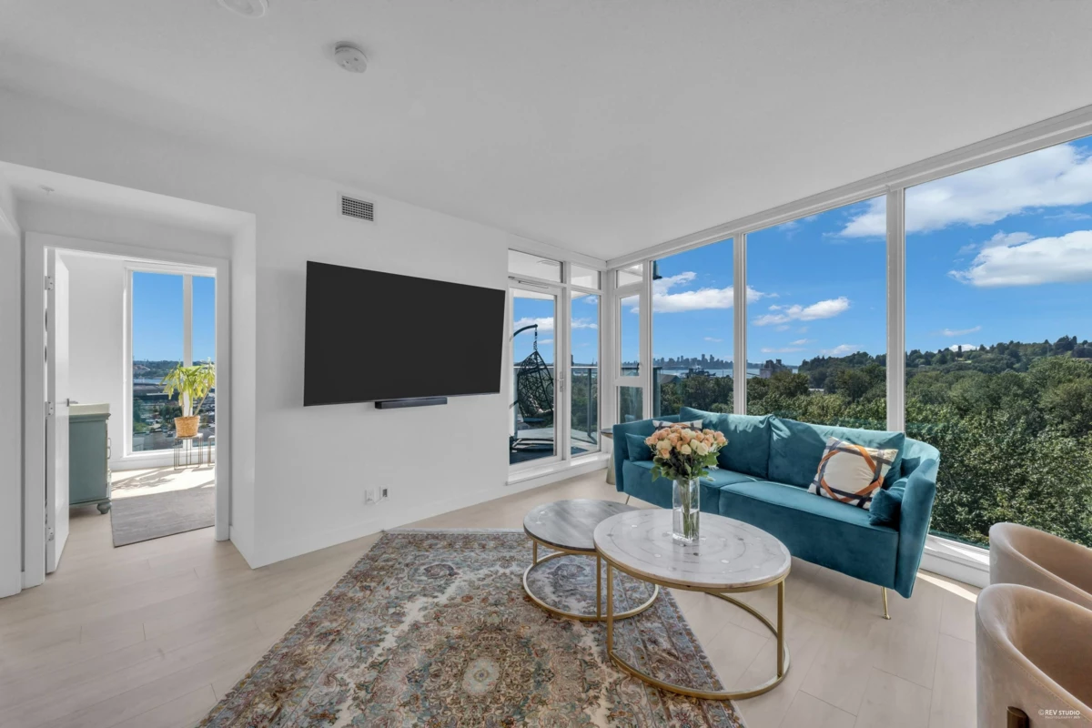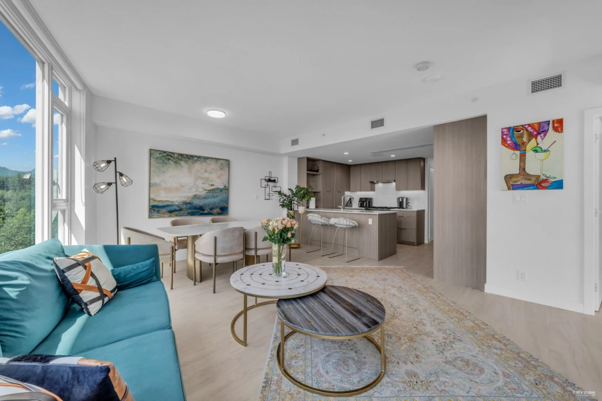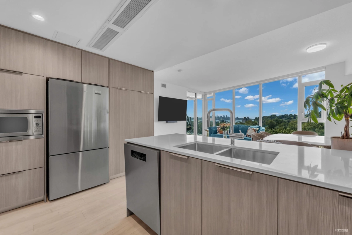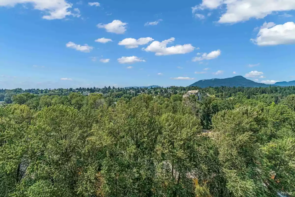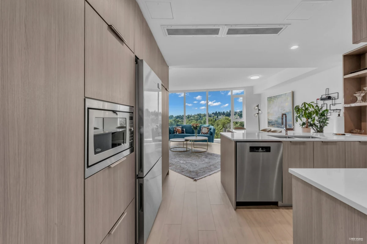 Stunning Corner Residence with Forest & Water Views at Hunter, Lynnmour Perched on the 14th floor of North Vancouver’s sought-after Hunter building, this 2-bedroom, 2-bathroom corner home offers 946 sq.ft. of beautifully designed living space plus a 118 sq.ft. covered balcony to enjoy serene forest vistas & calming water views. Floor-to-ceiling windows flood the open-concept layout with natural light, while the sleek chef’s kitchen boasts quartz countertops, high-end stainless steel appliances, & custom cabinetry with pantry storage. The private primary suite features a walk-in closet & spa-inspired 4-piece ensuite. This home includes air conditioning, in-suite laundry & 1 secure parking.Residents enjoy world-class amenities—state-of-the-art fitness centre, sauna/steam room and etc.