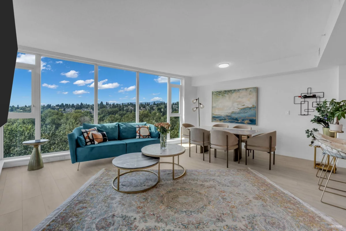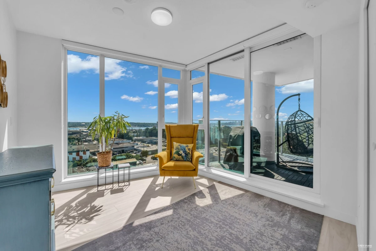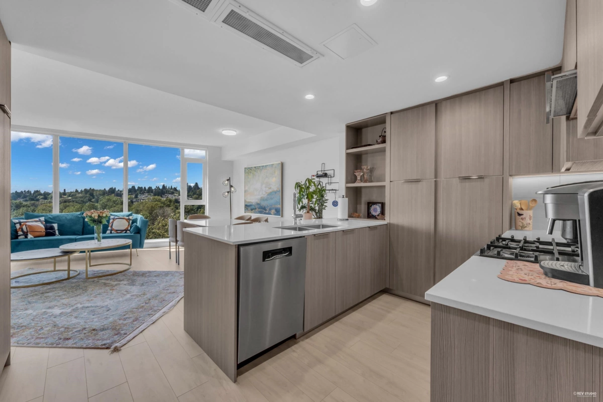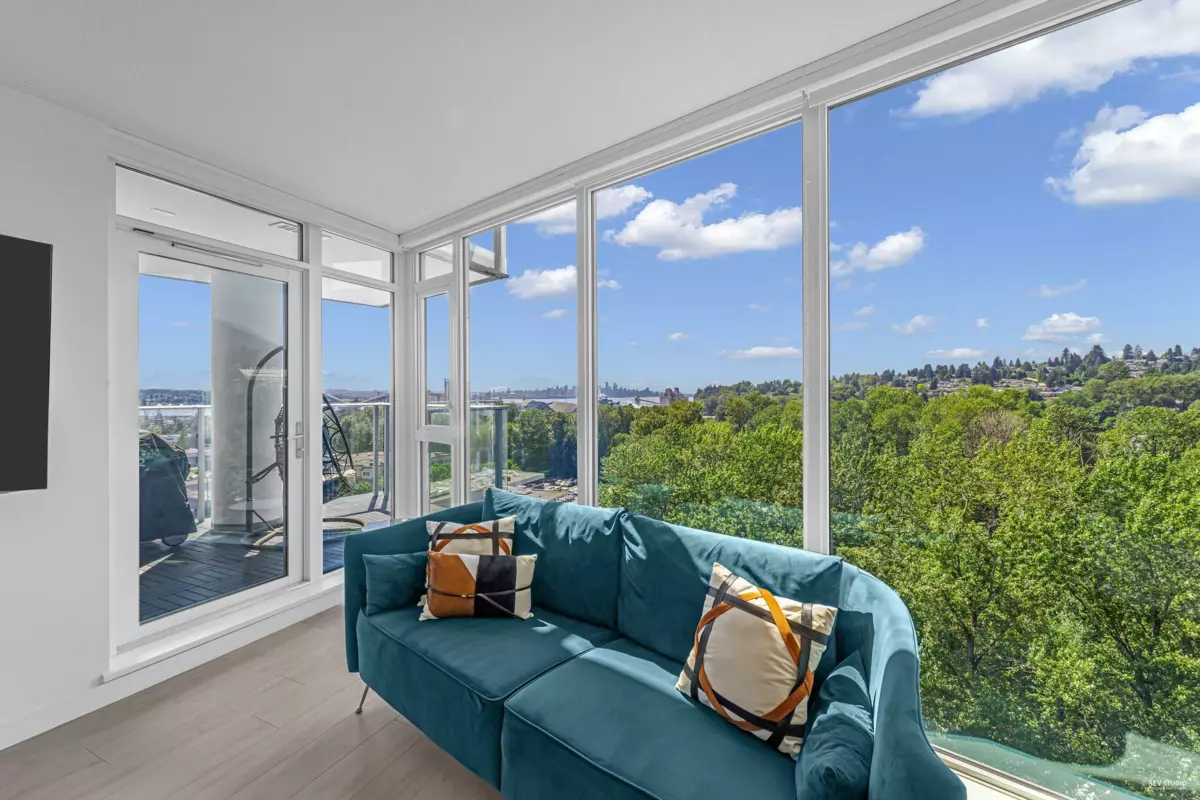 Stunning Corner Residence with Forest & Water Views at Hunter, Lynnmour Perched on the 14th floor of North Vancouver’s sought-after Hunter building, this 2-bedroom, 2-bathroom corner home offers 946 sq.ft. of beautifully designed living space plus a 118 sq.ft. covered balcony to enjoy serene forest vistas & calming water views. Floor-to-ceiling windows flood the open-concept layout with natural light, while the sleek chef’s kitchen boasts quartz countertops, high-end stainless steel appliances, & custom cabinetry with pantry storage. The private primary suite features a walk-in closet & spa-inspired 4-piece ensuite. This home includes air conditioning, in-suite laundry & 1 secure parking.Residents enjoy world-class amenities—state-of-the-art fitness centre, sauna/steam room and etc.