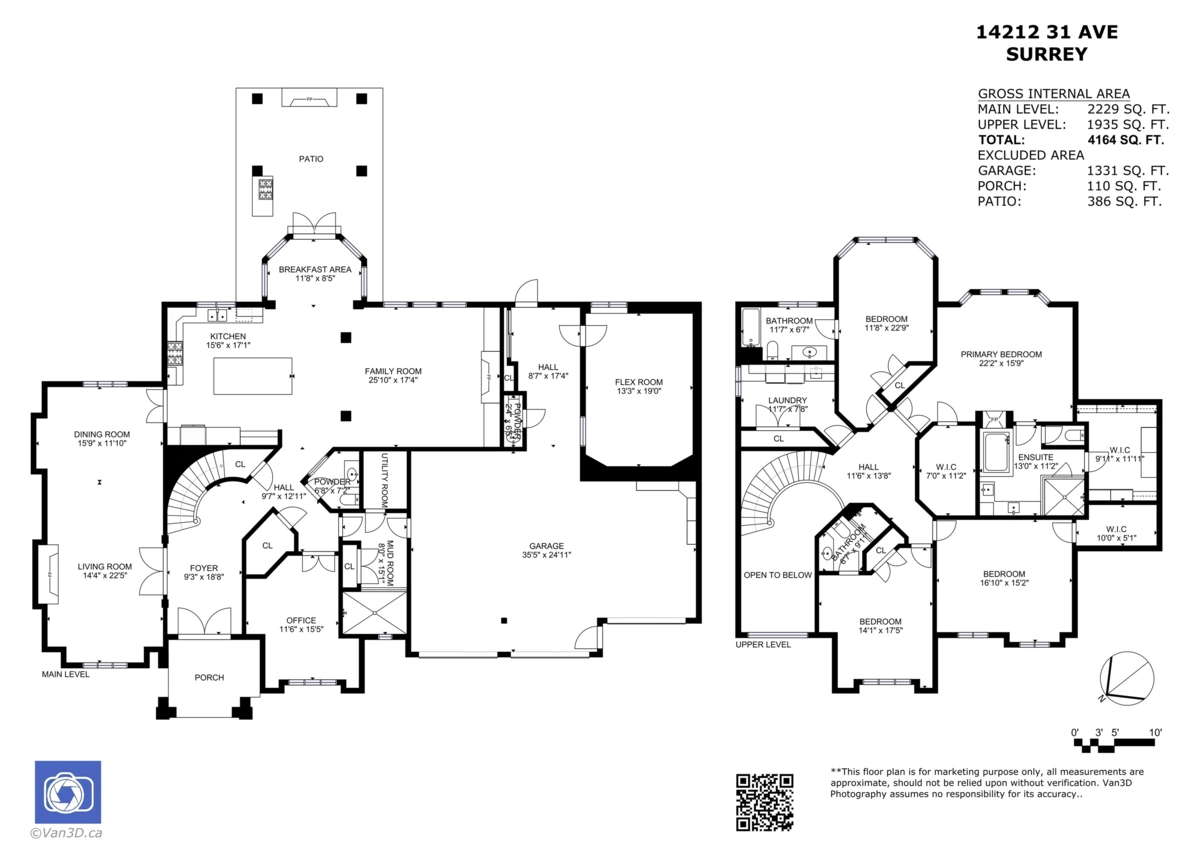Musicians/creators alert. A rare find in the prestigious Elgin Park, this well maintained home sits on a beautifully landscaped SE facing lot on a quiet cul-de-sac. The main floor features soaring ceilings in the foyer, living and dining room, while upstairs features 3 generous bedrooms, each with ensuite, plus a 4th bedroom or flexible room. Extensively renovated in 2008 with over $420K spent, it showcases custom built-ins, A/C, coffered and vaulted ceilings, rich millwork, and a chef’s kitchen with premium appliances. Step outside to a custom-covered patio with a built-in BBQ, perfect for entertaining year-round. It includes a professionally designed, fully soundproof music studio—built by an acoustician. Triple-layer roof in 2012. Oversized driveway easily fits RVs, boats, or 12 cars.
