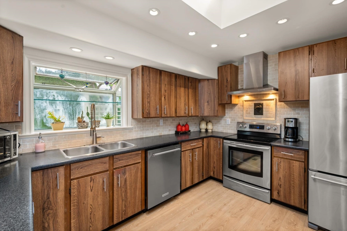 DOWNSIZERS & YOUNG FAMILIES ALIKE. Just 4-minutes to Hwy 1! This rare corner lot with lane access offers space, and flexibility. A charming 4-bedroom, 2-bath rancher featuring a bright layout with a cozy fireplace, a sunlit kitchen and eating area leading to a private deck, and French doors from the primary bedroom opening directly to the garden. Large laundry/mudroom makes family living easy. Outside, enjoy a fully fenced, beautifully landscaped yard with a workshop, mature trees, and room for entertaining or kids at play. Ample parking for RV or boat. Located just minutes from Guildford Mall, the Rec Centre, schools, parks, and Hwy 1. Whether you’re right-sizing, starting fresh, or planning a future rebuild, this property is a rare find that combines comfort and privacy