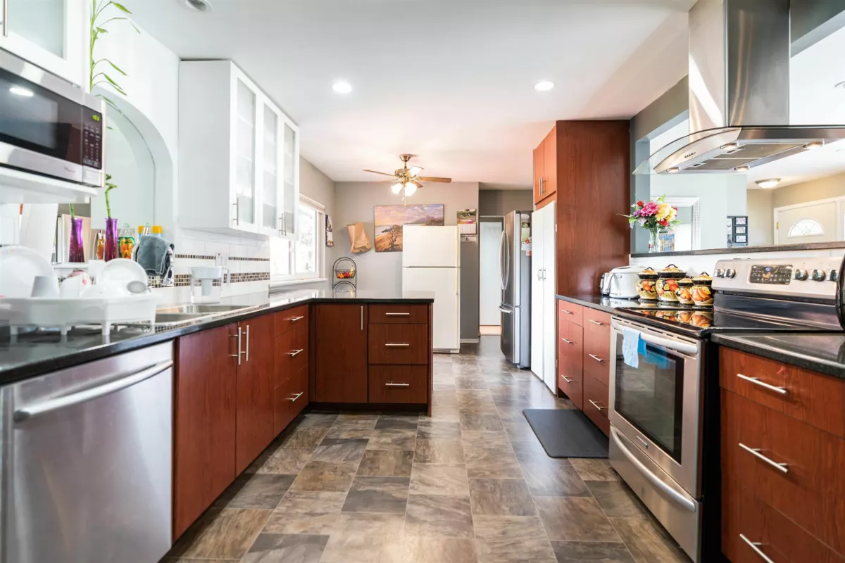 This spacious 4-bedroom, 2.5-bathroom rancher in Bolivar Heights offers comfortable living on a 7200 sq ft lot with friendly neighbors. Features include an ensuite master bedroom, living room, dining room, a gorgeously renovated kitchen with newer cabinets, countertops, and wood flooring, and a professionally upgraded solid driveway. Enjoy outdoor living with patio seating in the picturesque, fenced backyard with a stunning garden. Close to Guildford shopping center, library, & Port Mann Bridge