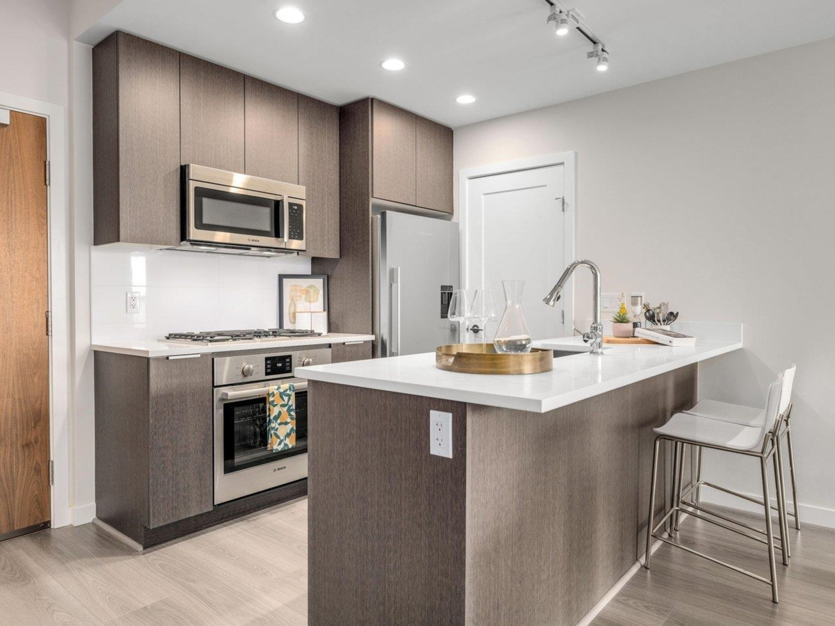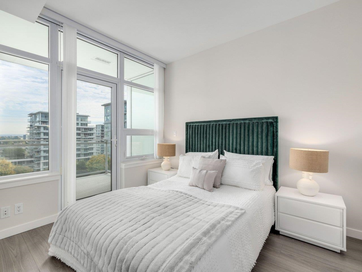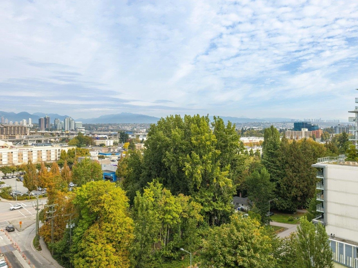 High level East-facing 932 sq ft 2 bed + den at Torino North with open mountain and garden views. Efficient floorplan with no wasted space, double ensuited bedrooms on opposite sides. High ceilings, full-size appliances, wide-plank laminate flooring, and heating/cooling. Convenient location with services, groceries, restaurant, and Capstan Canada Line Station just steps away. New and ready to move in.