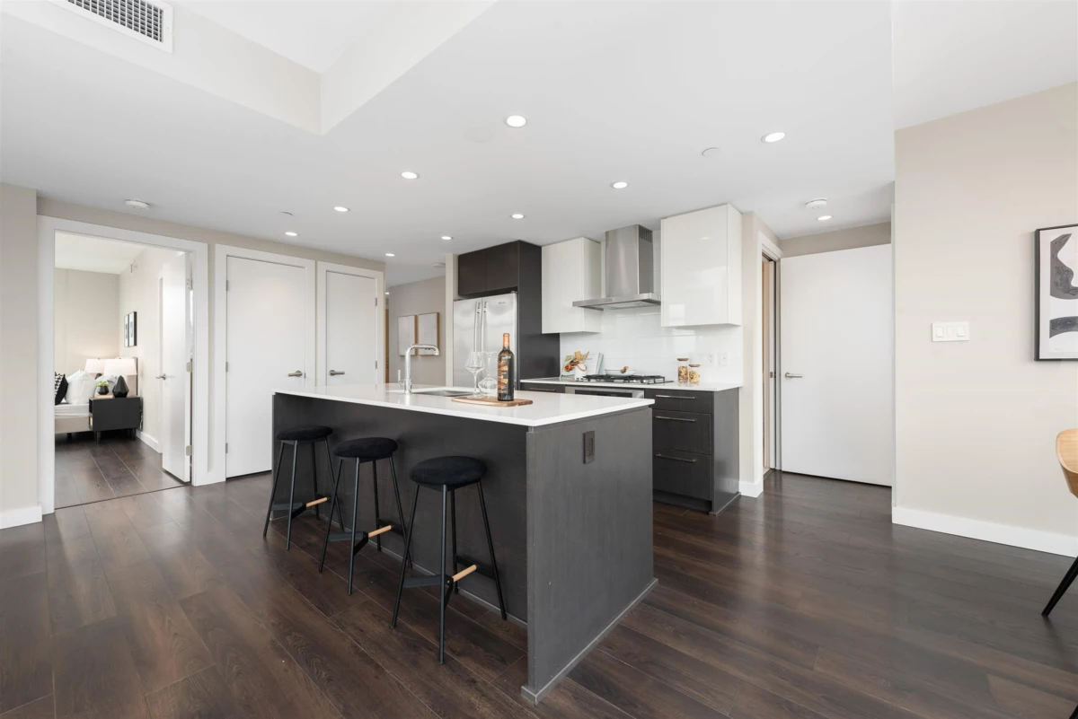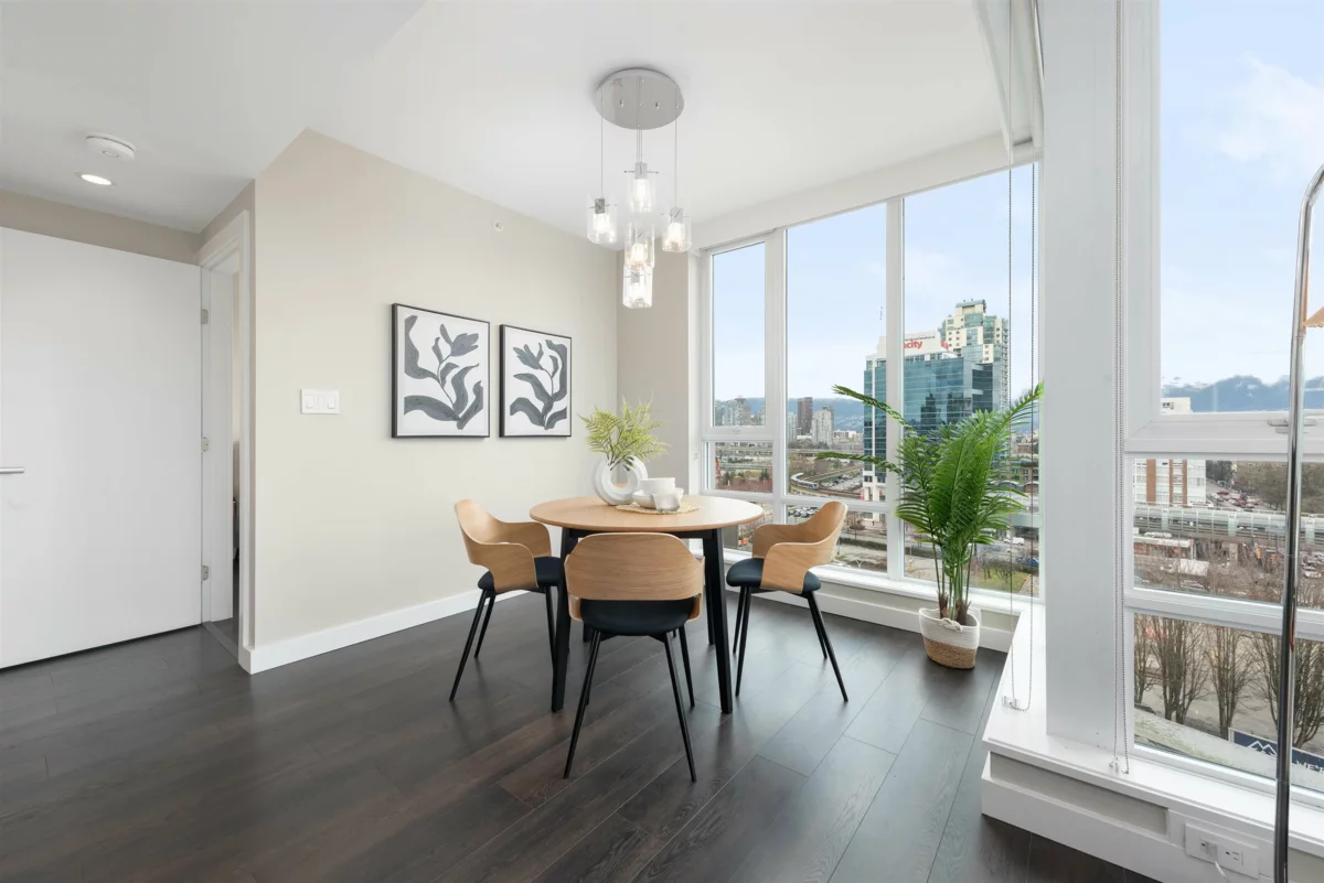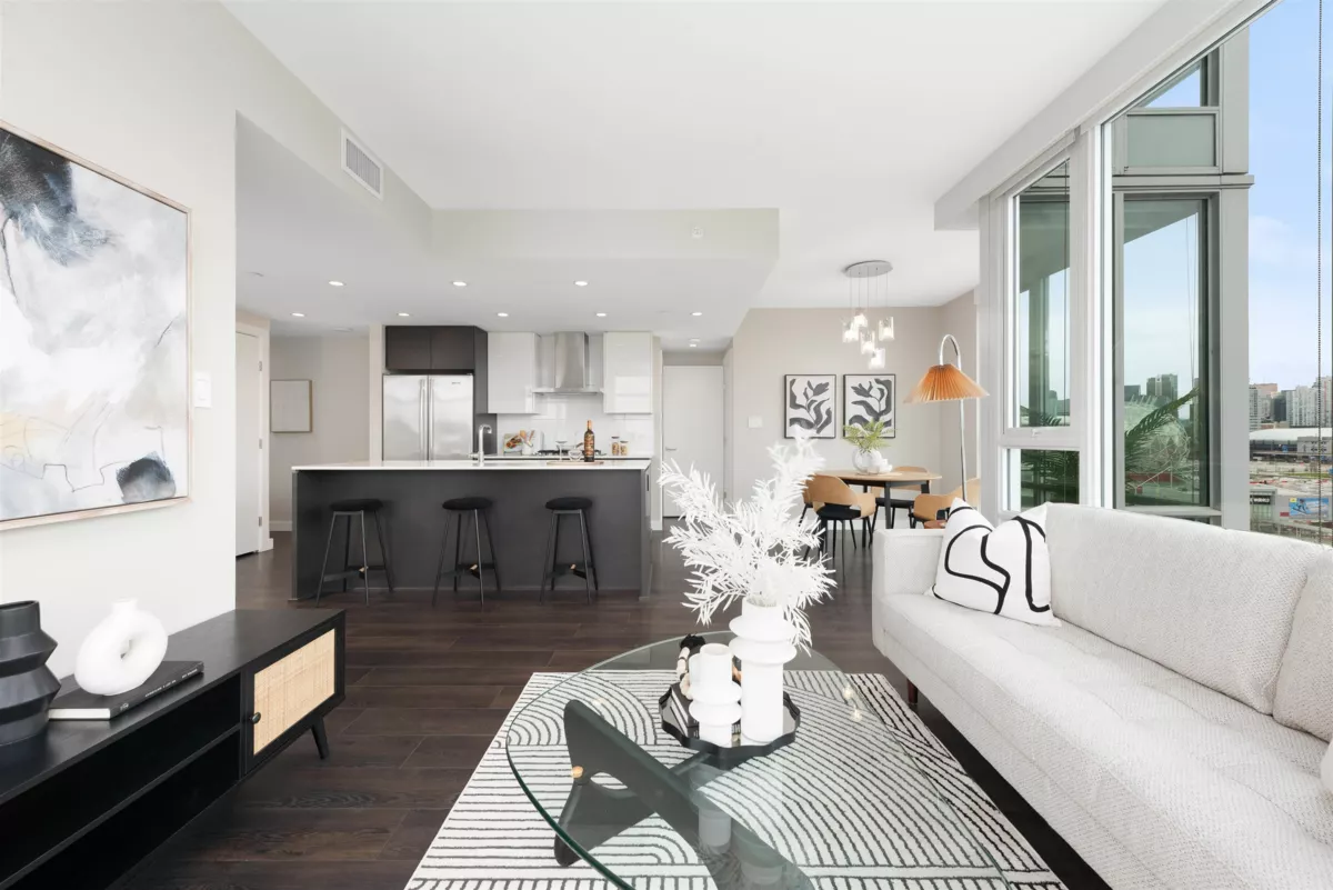 Welcome to Central by Onni! This rare corner unit features 2 beds, 2 baths, a flex room, a den, and balcony offering versatility and space. This bright northeast-facing home showcases stunning city and mountain views and includes central AC and heating for year-round comfort. The modern kitchen boasts integrated stainless-steel appliances and sleek quartz counters. Enjoy luxury amenities like a full-time concierge, rooftop dining terrace with a garden, full-size gym, party room, and theatre. Steps to the seawall, Skytrain, and Olympic Village. Includes 2 side-by-side parking spots and a storage locker. Don’t miss this exceptional opportunity to own in one of Vancouver’s most sought-after neighbourhoods!