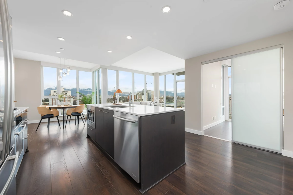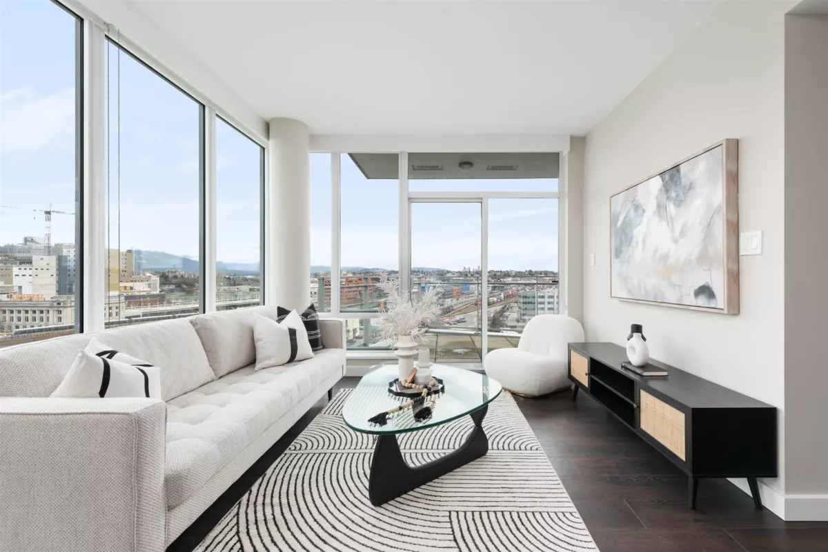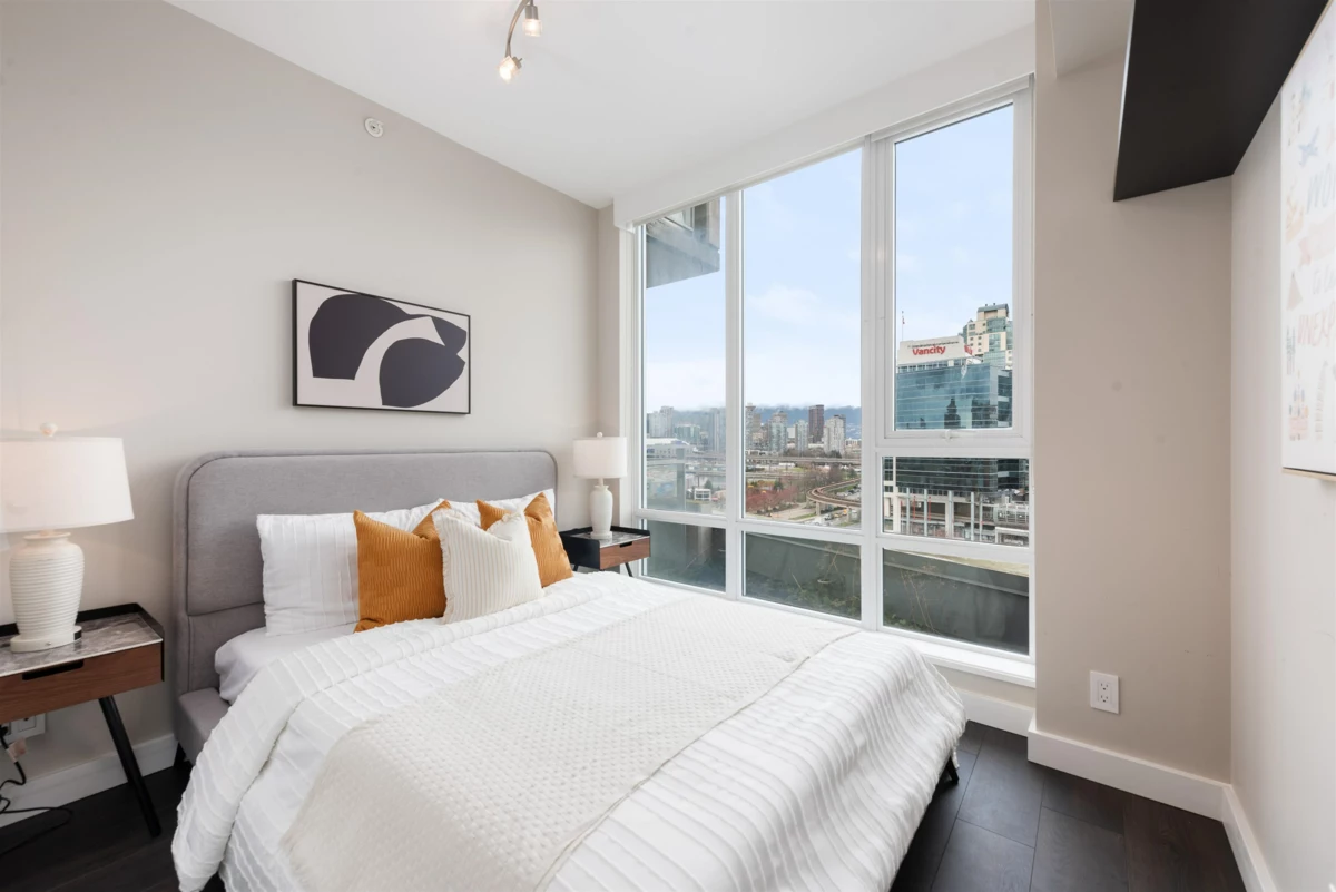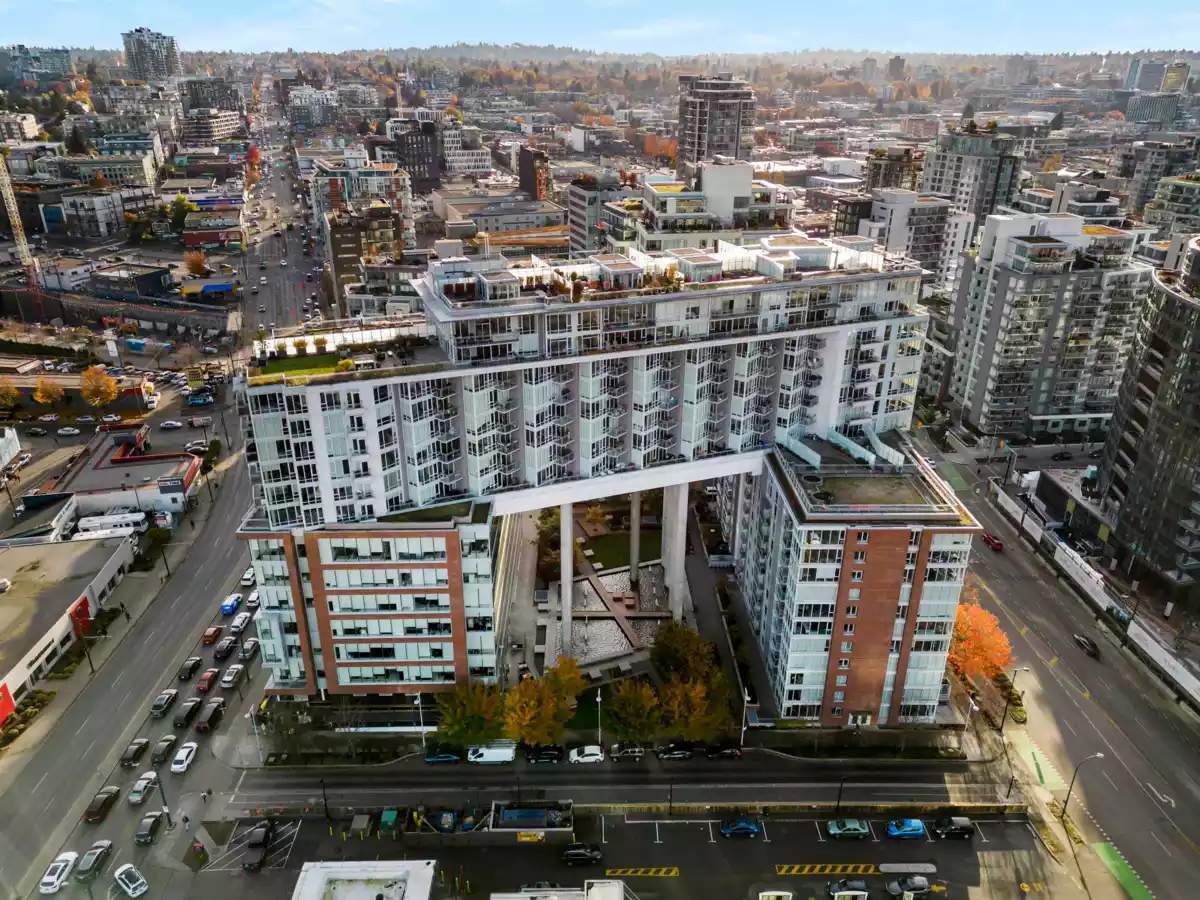 Welcome to Central by Onni! This rare corner unit features 2 beds, 2 baths, a flex room, a den, and balcony offering versatility and space. This bright northeast-facing home showcases stunning city and mountain views and includes central AC and heating for year-round comfort. The modern kitchen boasts integrated stainless-steel appliances and sleek quartz counters. Enjoy luxury amenities like a full-time concierge, rooftop dining terrace with a garden, full-size gym, party room, and theatre. Steps to the seawall, Skytrain, and Olympic Village. Includes 2 side-by-side parking spots and a storage locker. Don’t miss this exceptional opportunity to own in one of Vancouver’s most sought-after neighbourhoods!