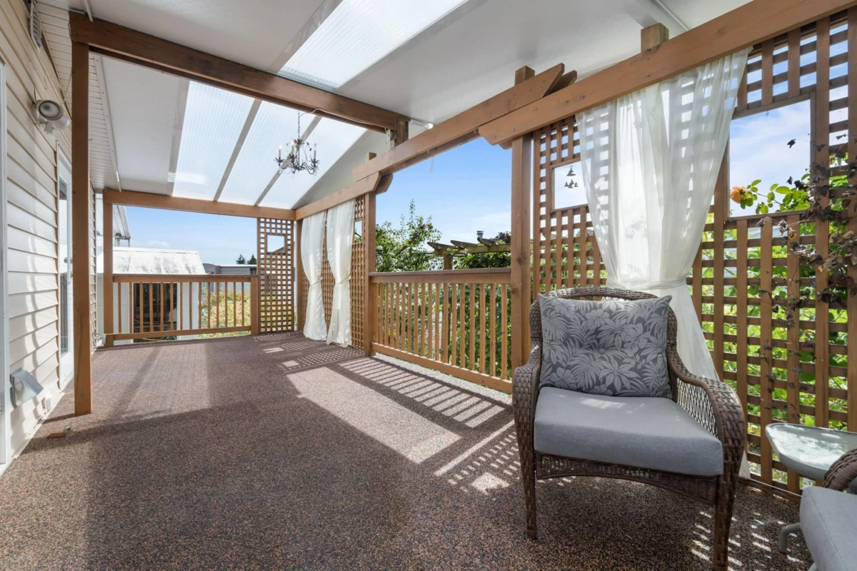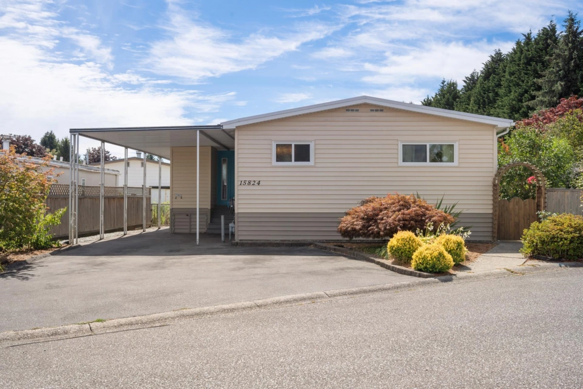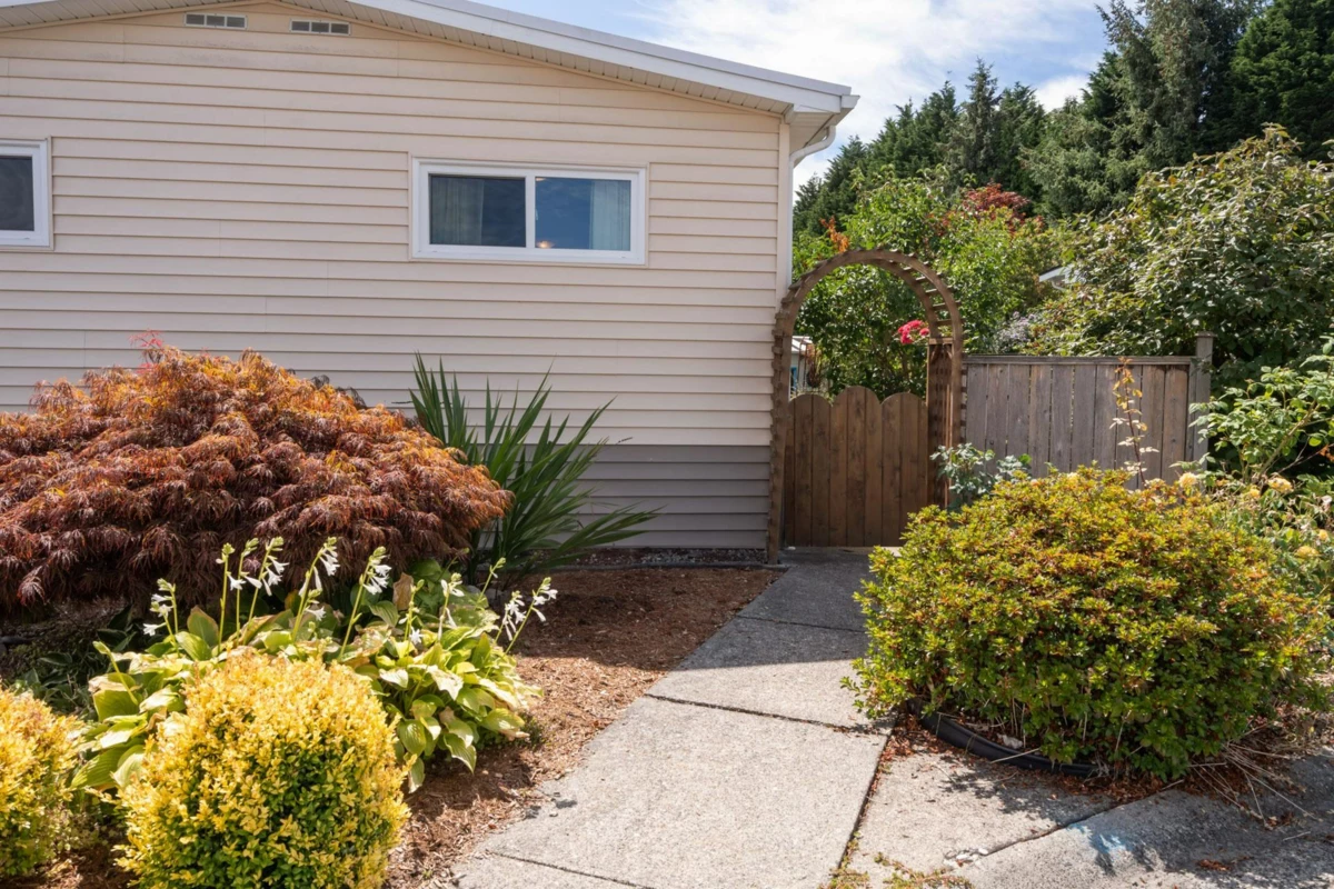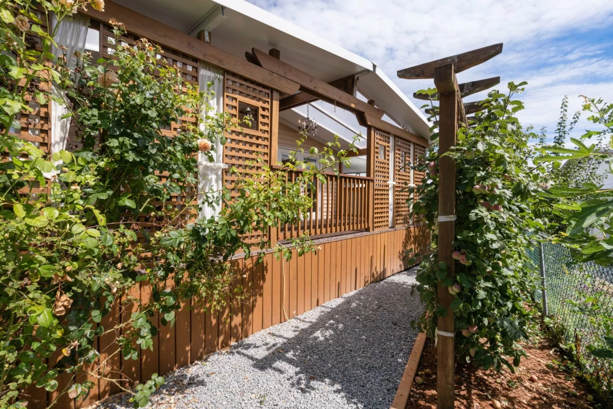 Cranley Place -Stunning Manu Home w/6287sqft lot. NO Strata fees! NO Pad Rental fee! Fully fenced yard to enjoy with this 1175sqft 2bed/ 2bath Double Wide Unit. Spacious Open Concept Living room is open to the kitchen & looks out to the covered 26ft deck; Great for BBQ/entertaining (wired for hot tub) All walls & ceilings are drywall! Plus gorgeous flooring throughout. Bright w/ lots of light from all the upgraded windows. Get creative in the powered Workshop, or heated Studio that's separated by fruit trees & a beautiful garden Oasis...or retire in the evening to sit by the gas fireplace and lookout the two sets of French doors...or enjoy your covered patio/deck...or relax in the soaker tub! Wheelchair ramp, covered parking, cement slab foundation, gas stove, 50+, It's Move In Ready!!