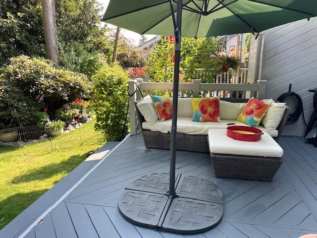 Nestled within the woods of Alder Park - 3 ponds, tennis, basketball courts, playground + walking paths. Beautifully updated 3 bdrm home. Kitch (Maple stained cabinets, with pull outs & drawers only, quartz counters, pot lites, wood ceiling in nook) 2 bathrms redone, rough in bath in bsmnt, engineered, flrs, sound proofed bsmnt media rm: mahogany walls, white washed pine ceiling with pot lites. Replaced inside doors +sliding drs, most windows & Flr, ceiling, window mouldings. Incredible views of greenery from every window. Entertainment size deck off living rm. Gas BBQ hook up. EV Charger. Instant hot water. RV Parking. Earl Marriott Sec 1 Blk. Peace Arch Elementary is close. OPEN SUN Nov. 9, 2-4