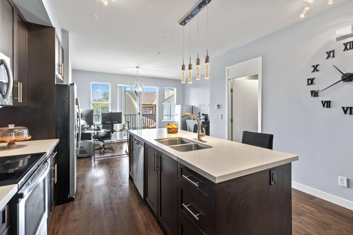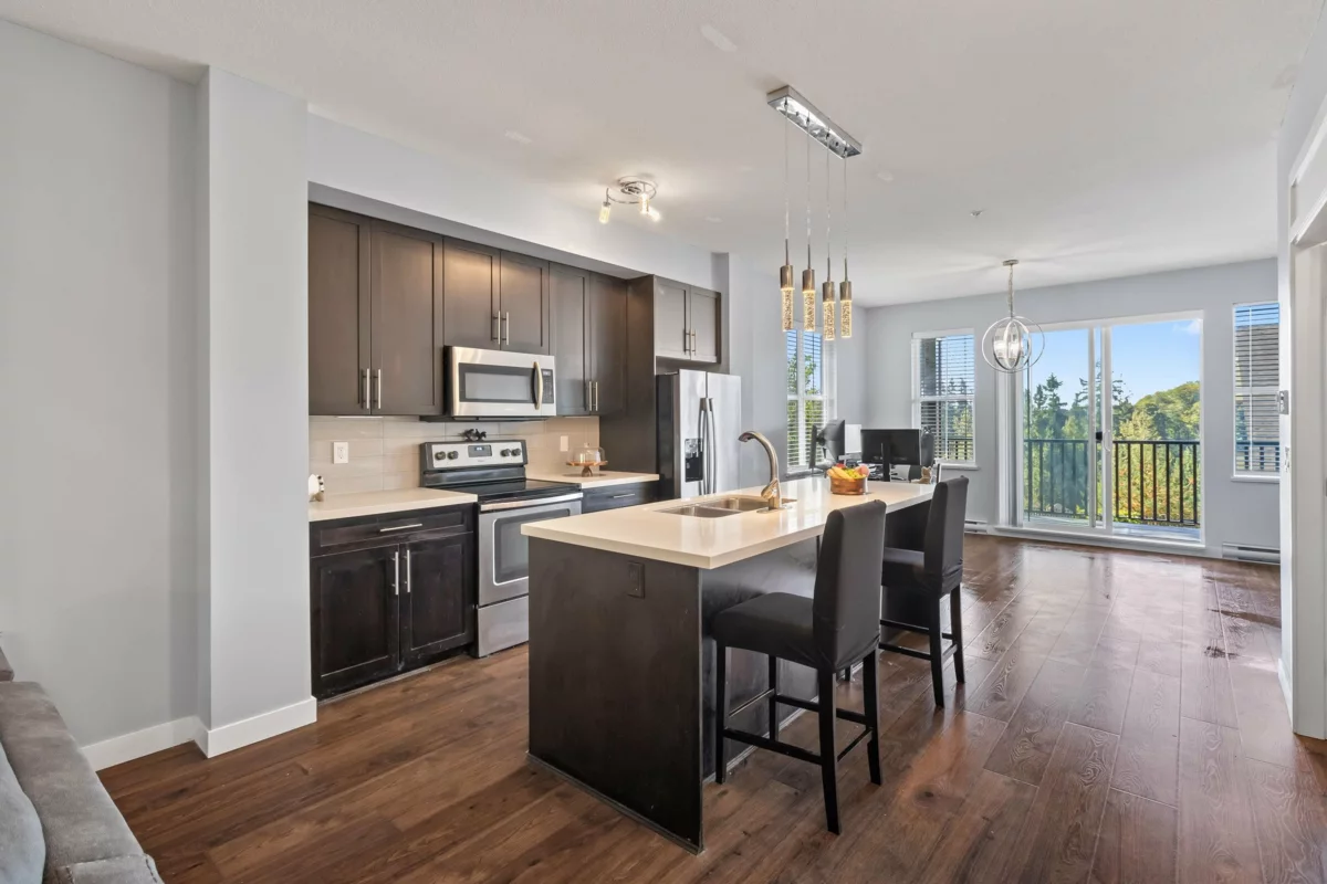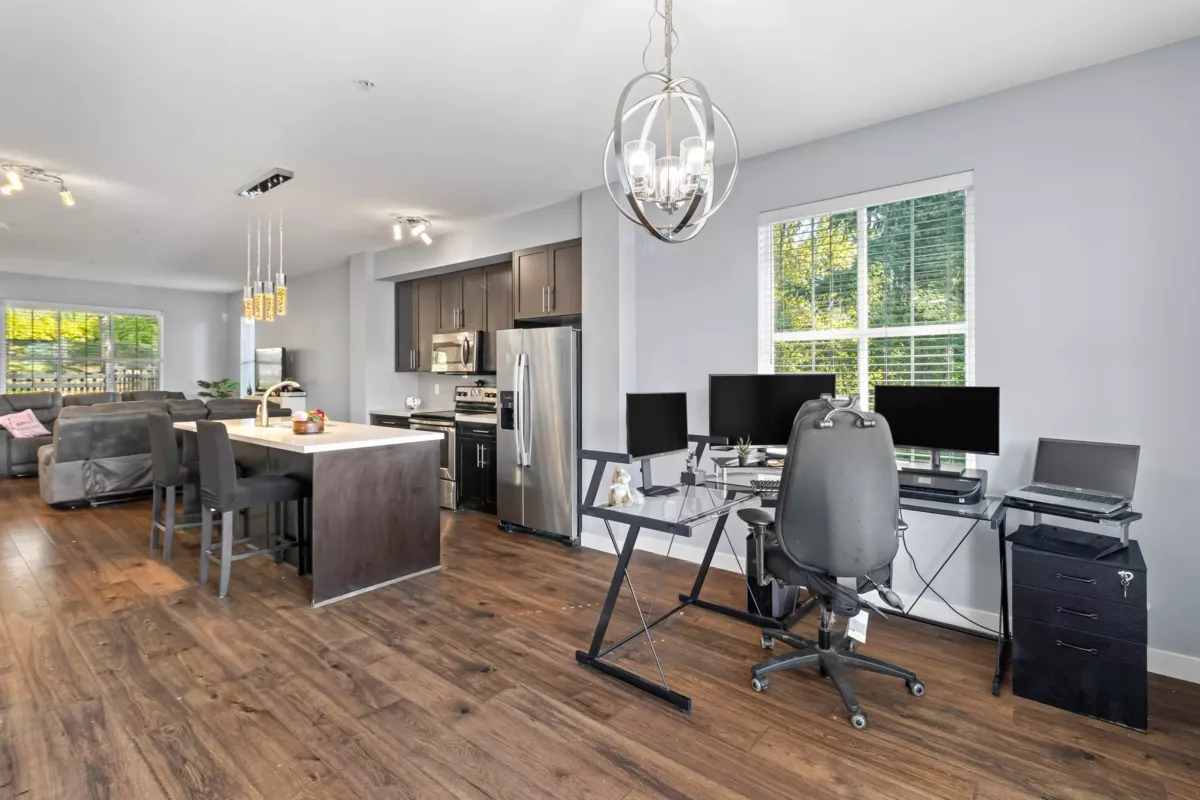 END UNIT | 3 Bed + Rec | 1,600+ Sq Ft | Upgrades Throughout Spacious 3-bedroom end-unit townhome with over 1,600 sq ft of living space in a prime, family-friendly location! Features include double side-by-side garage + driveway parking, new carpet throughout, lifetime warranty vinyl plank flooring, upgraded lighting, and custom detailed entryways. Bright open-concept main floor with large kitchen island, electric fireplace, and full-sized dining area. Oversized rec room below—ideal for office, gym, or playroom. Two covered outdoor spaces: private deck + patio and a large front yard. Steps to Kanaka Creek Elementary, parks, trails, and easy access to transit, West Coast Express & highways.